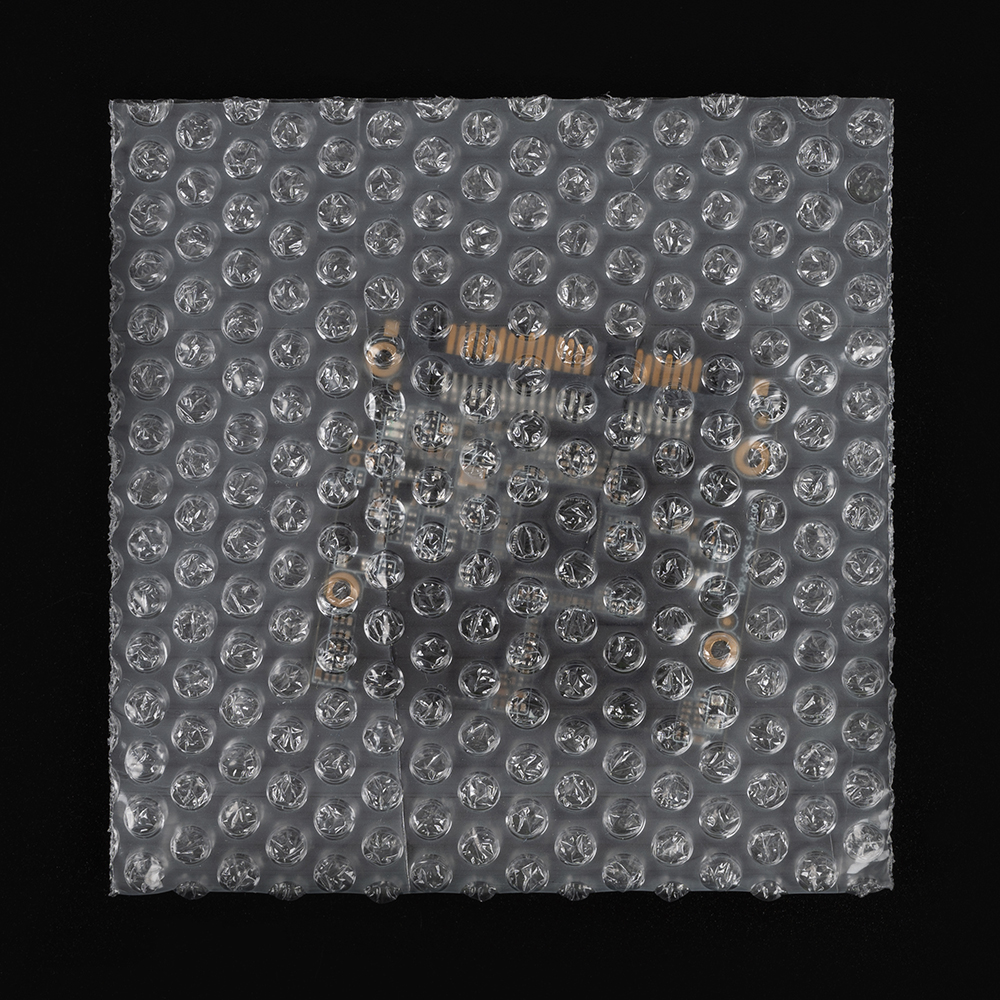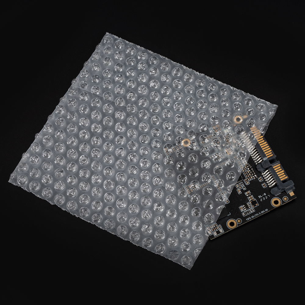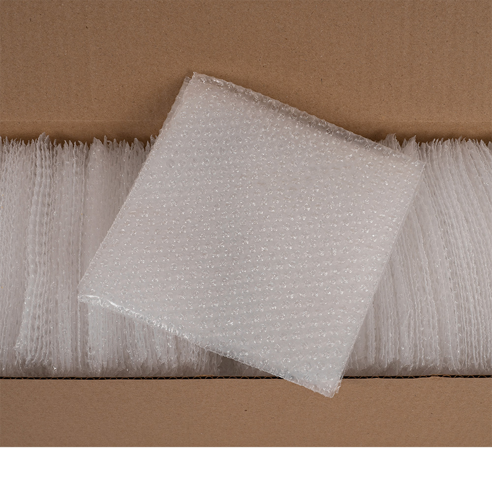 Прозрачные двухслойные воздушно-пузырчатые пакеты из пленки «МиниБабл», длиной 15 см, шириной 15 см, диаметром пузырька 5 мм, плотностью 25 г/м². В коробке 300 пакетов. Изготовлен из полиэтилена. Производится в России.