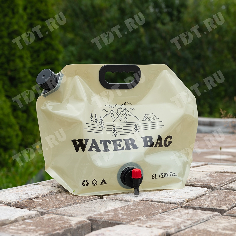 Складная сумка-канистра для хранения воды — ширина 42 см, глубина 7.5 см, высота 31 см, объём 8 л. Бежевый цвет. Материал — PET-G пластик. Занимает минимум места в сложенном виде — всего 15*15*7 см.