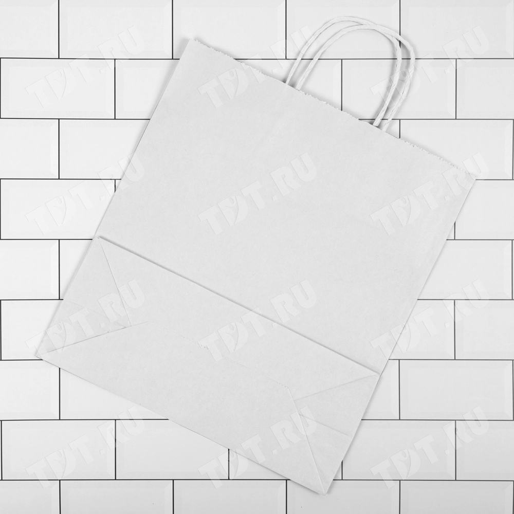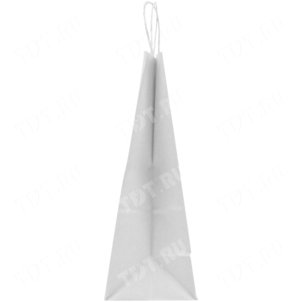 Белый бумажный пакет с кручёной ручкой глубиной 120 мм, шириной 320 мм, высотой 290 мм, изготовлен из экологичного материала. Пакеты производятся в России.