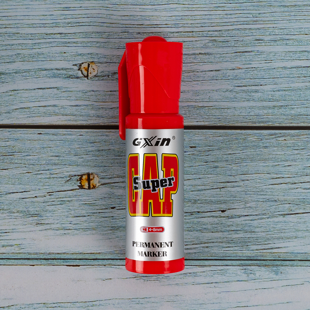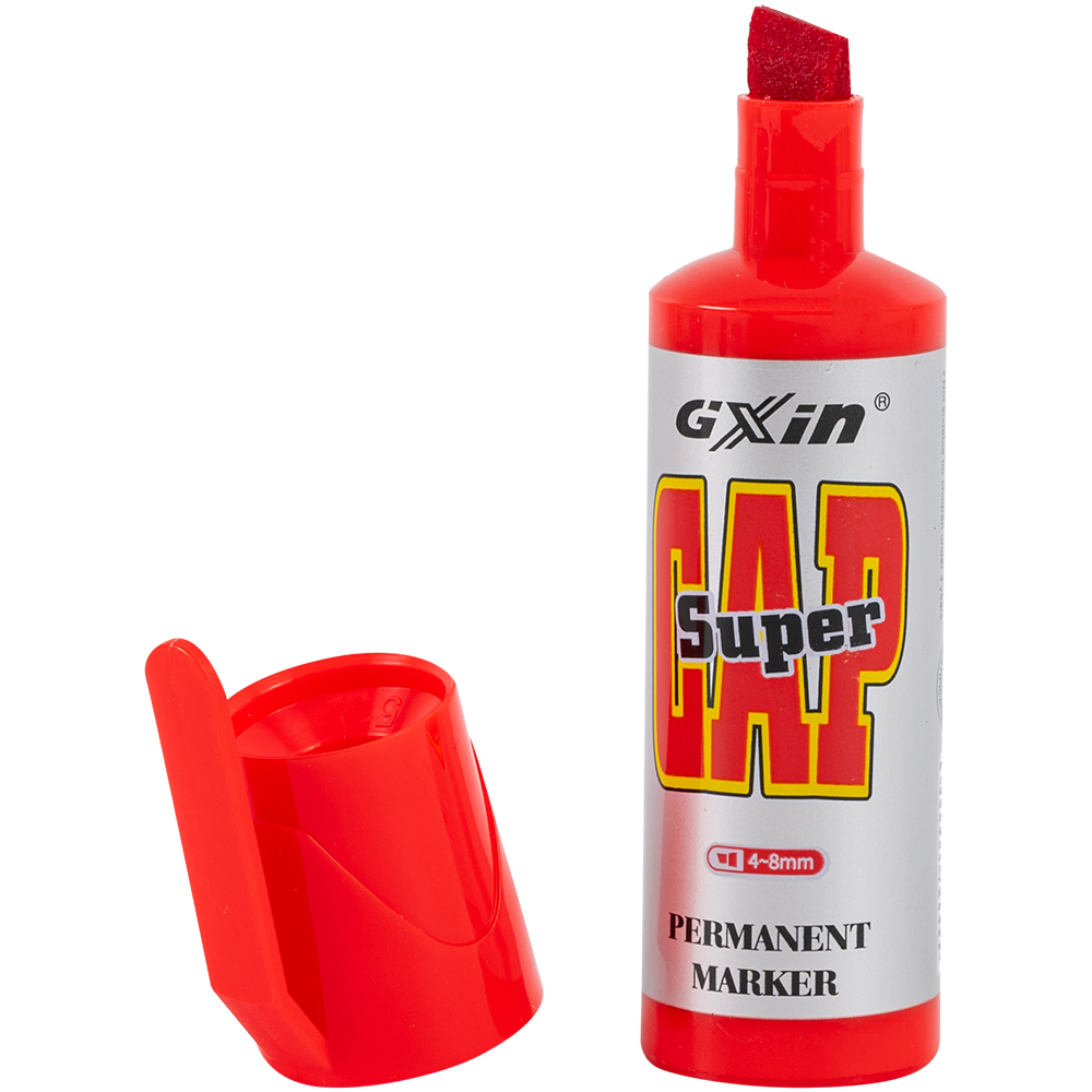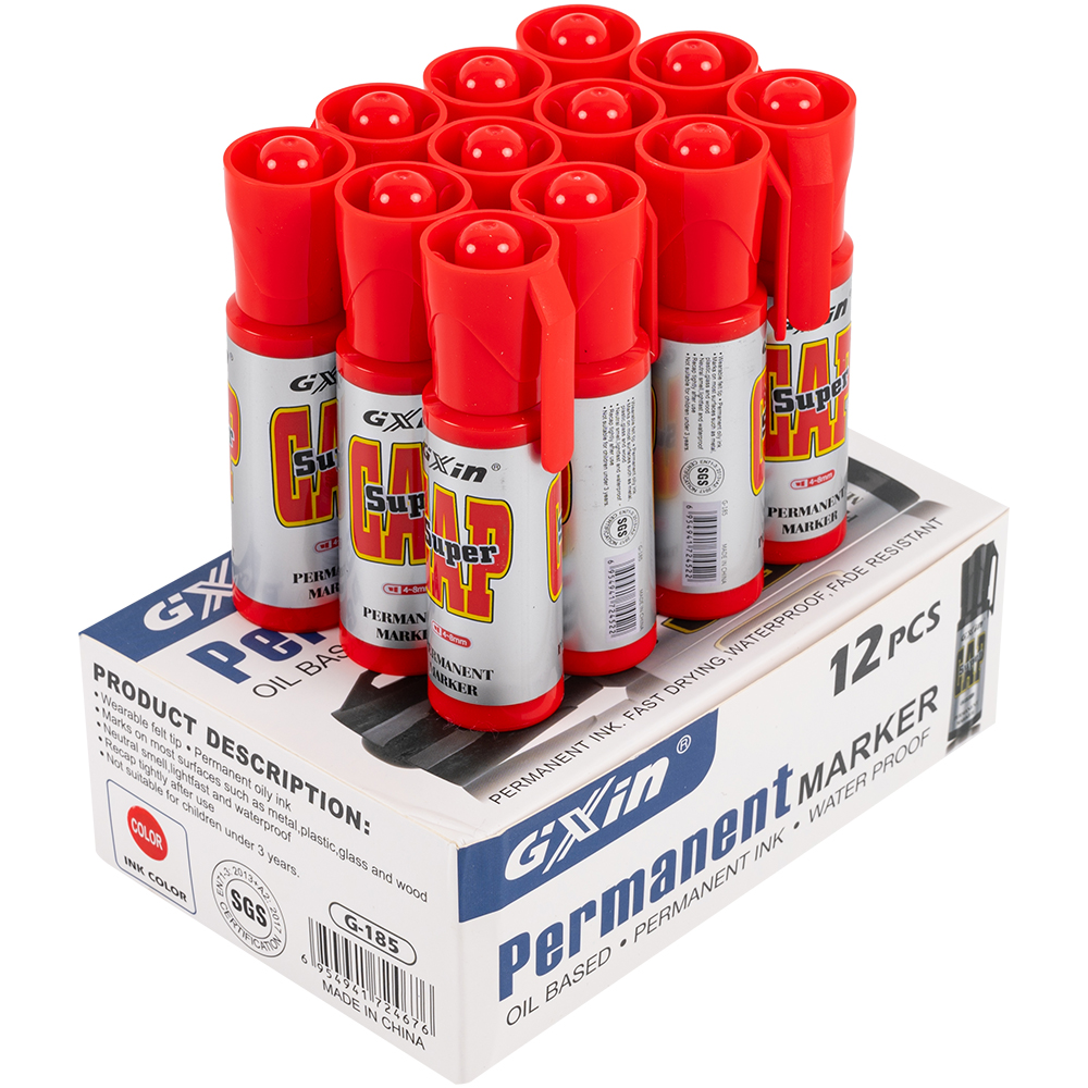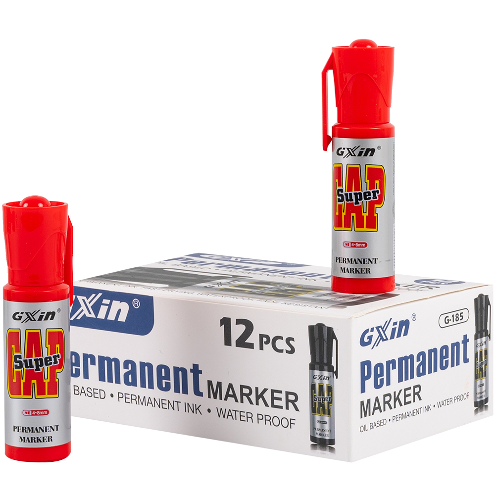 Маркер перманентный Gxin «Super cap» G-185, на масляной основе, толщиной пера от 4 до 8 мм, красного цвета, скошенный наконечник. Продается упаковками, упаковка – картонная коробка, вложение в коробку – 12 маркеров. Производится в Китае.