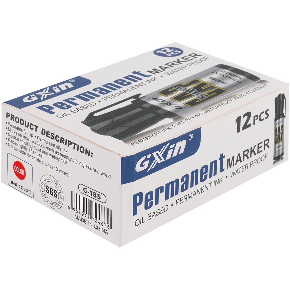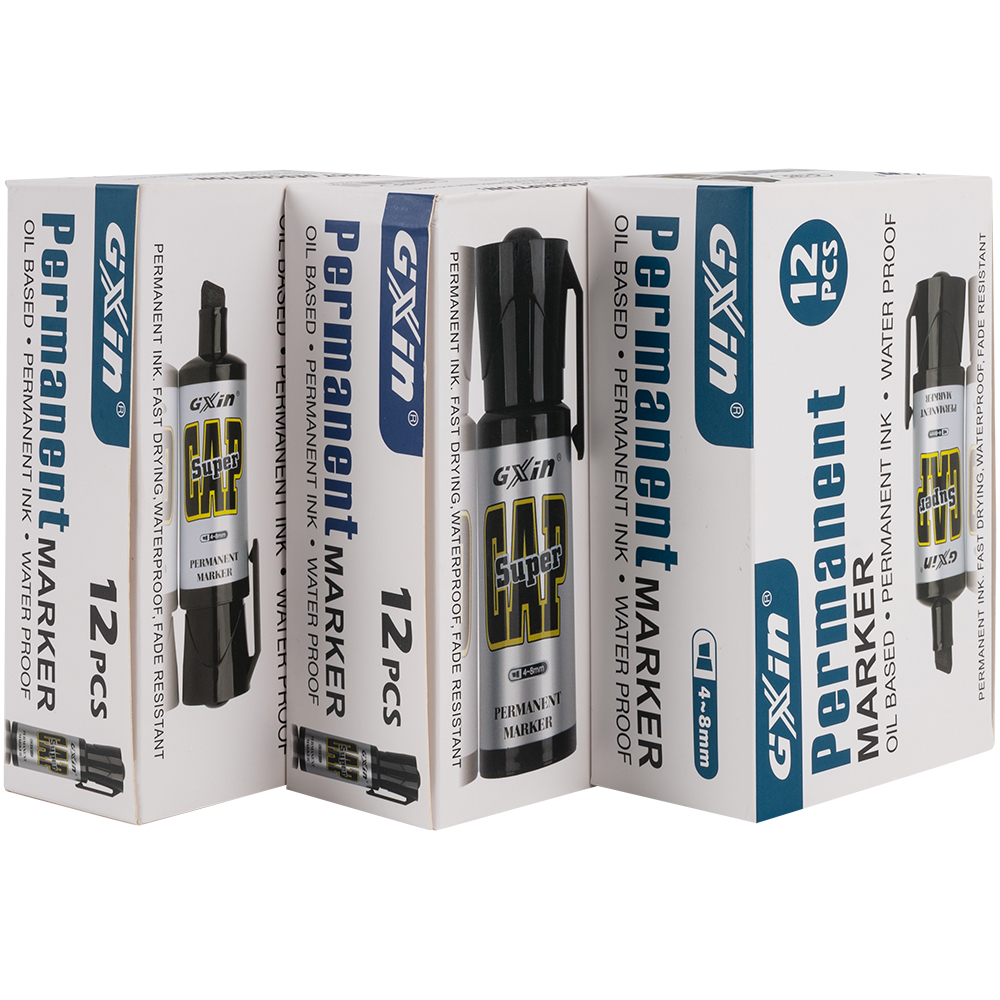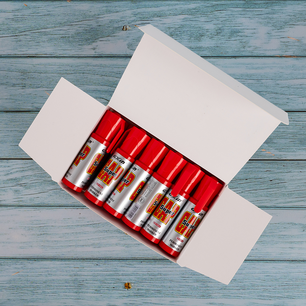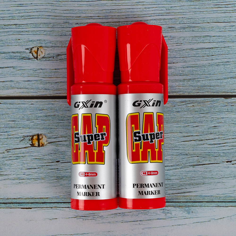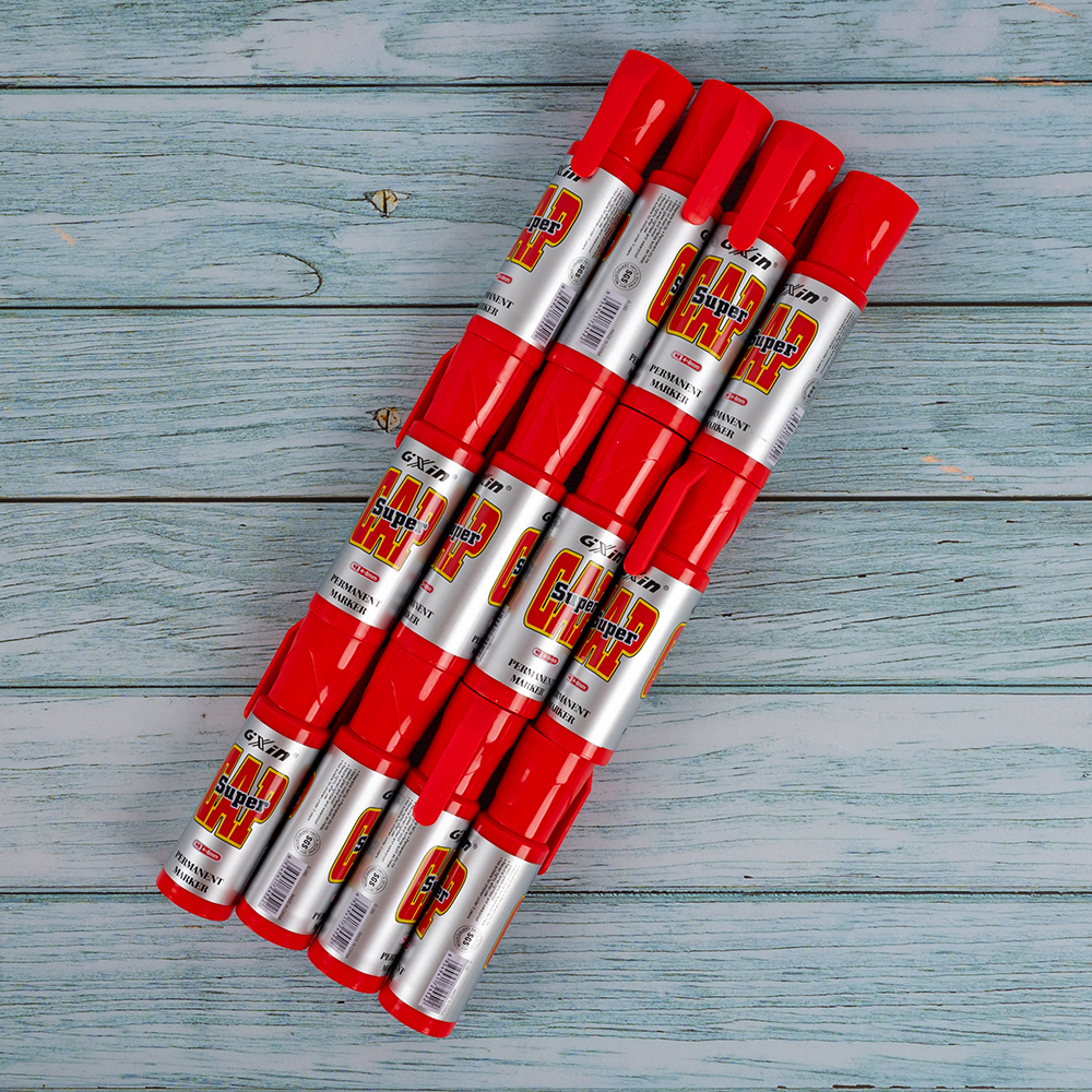 Маркер перманентный Gxin «Super cap» G-185, на масляной основе, толщиной пера от 4 до 8 мм, красного цвета, скошенный наконечник. Продается упаковками, упаковка – картонная коробка, вложение в коробку – 12 маркеров. Производится в Китае.
