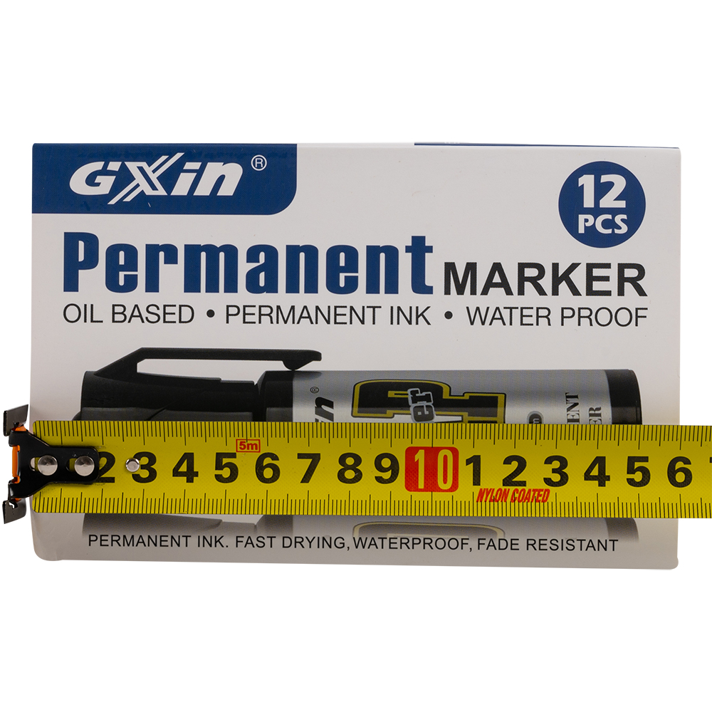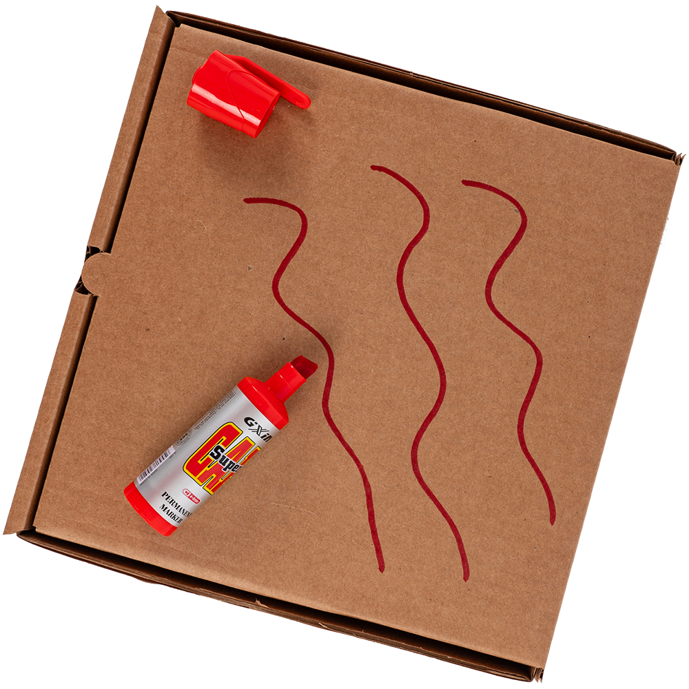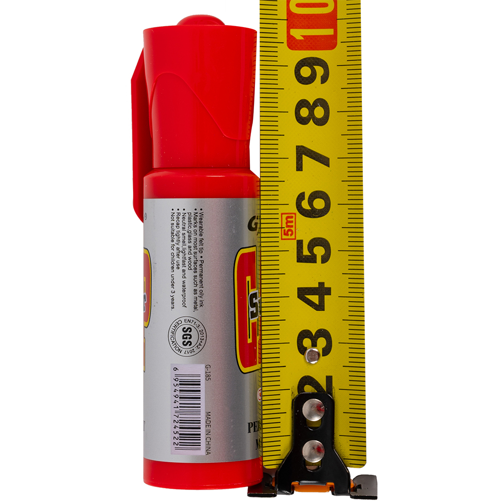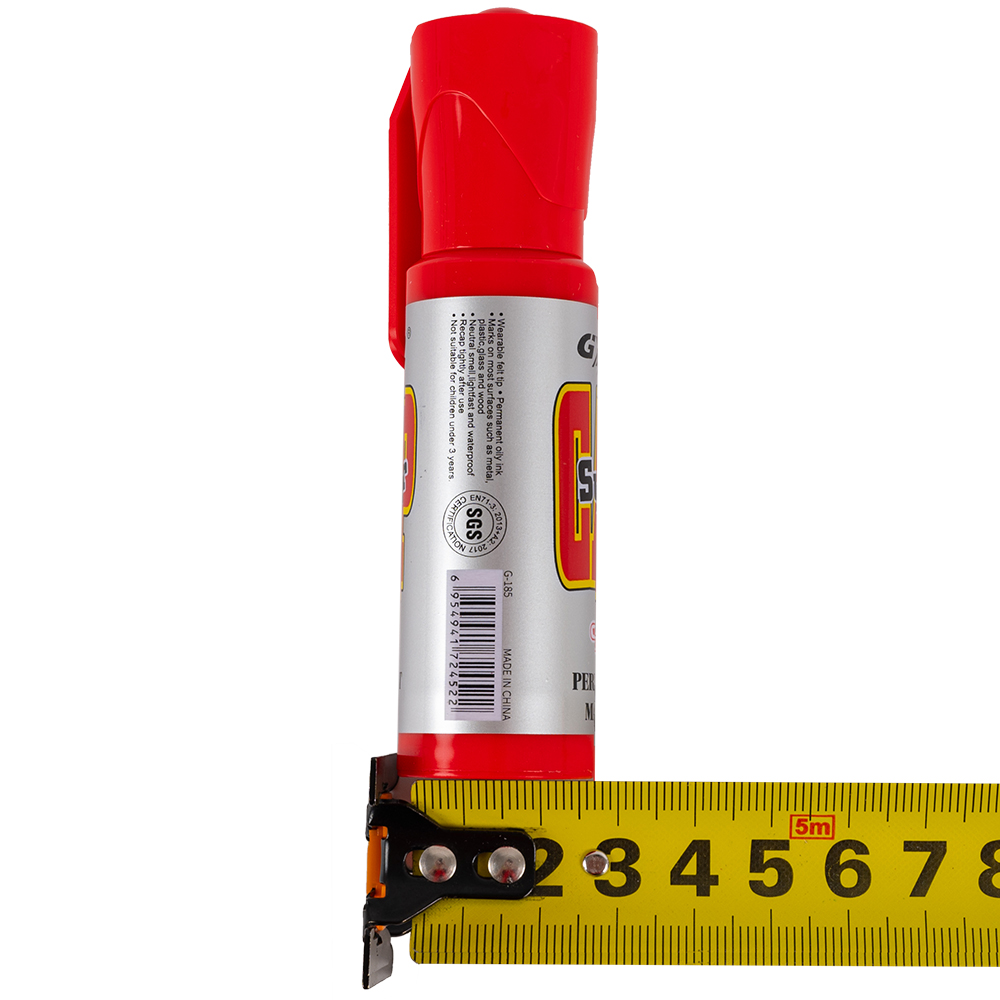 Маркер перманентный Gxin «Super cap» G-185, на масляной основе, толщиной пера от 4 до 8 мм, красного цвета, скошенный наконечник. Продается упаковками, упаковка – картонная коробка, вложение в коробку – 12 маркеров. Производится в Китае.