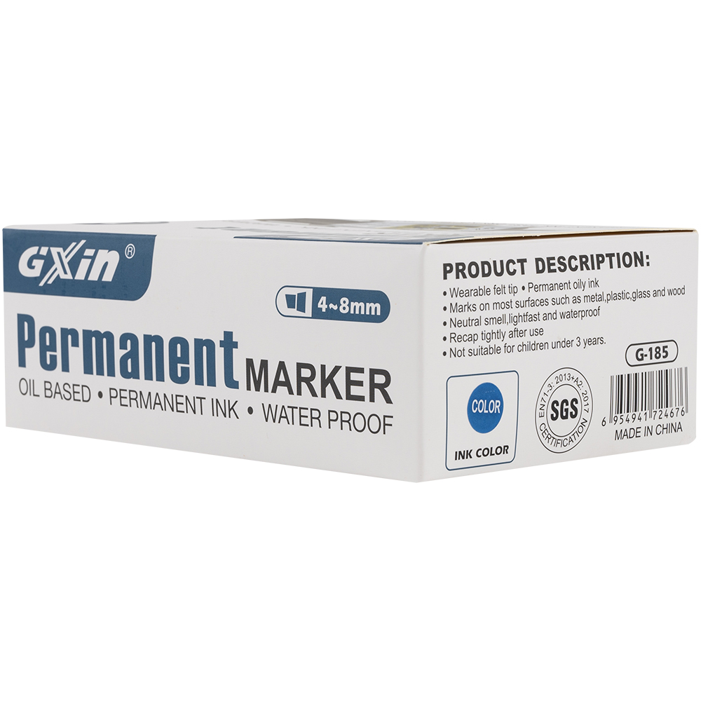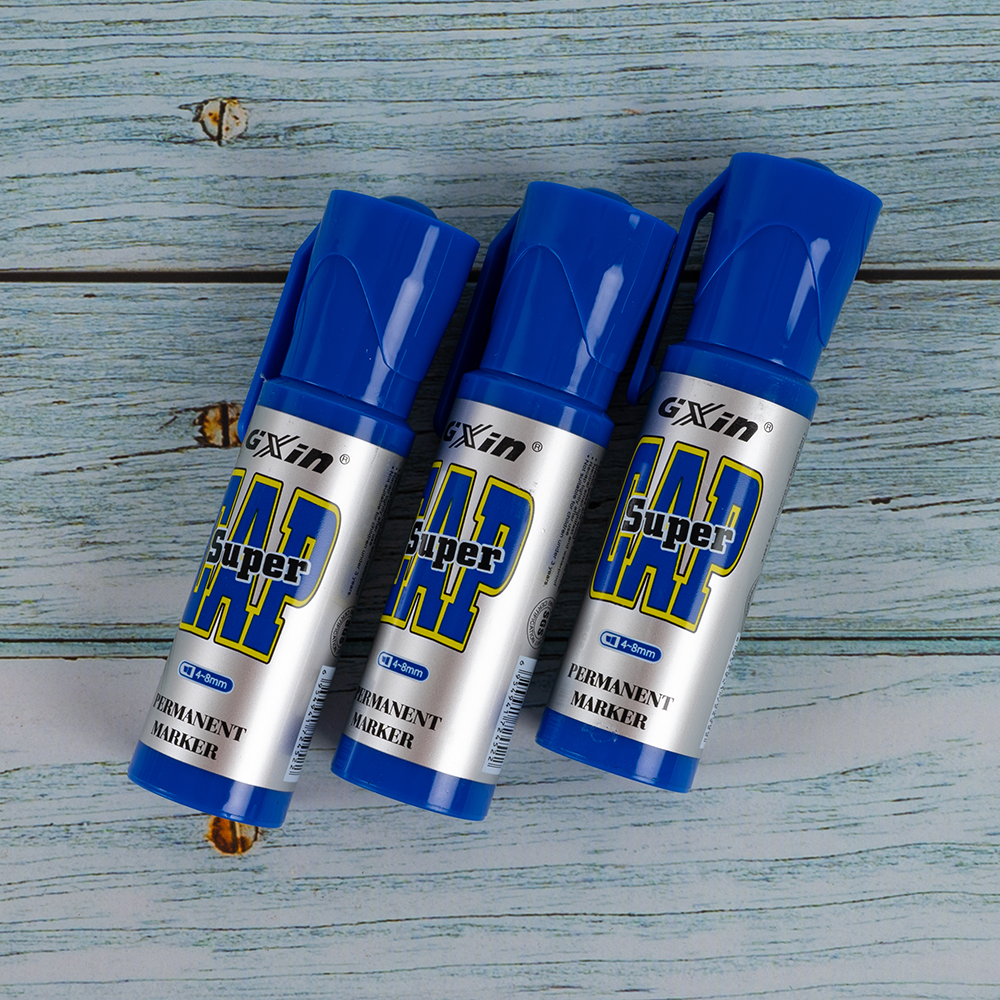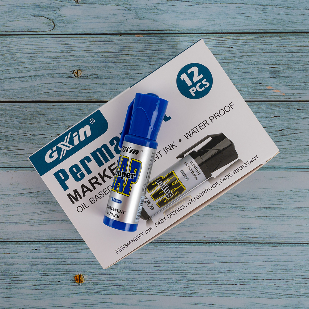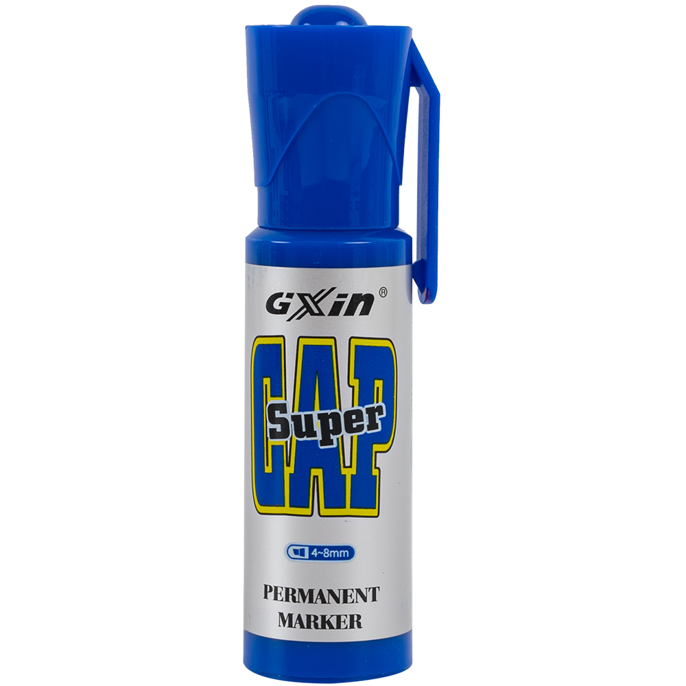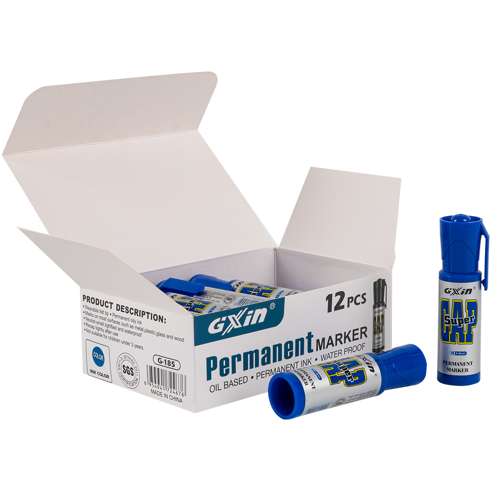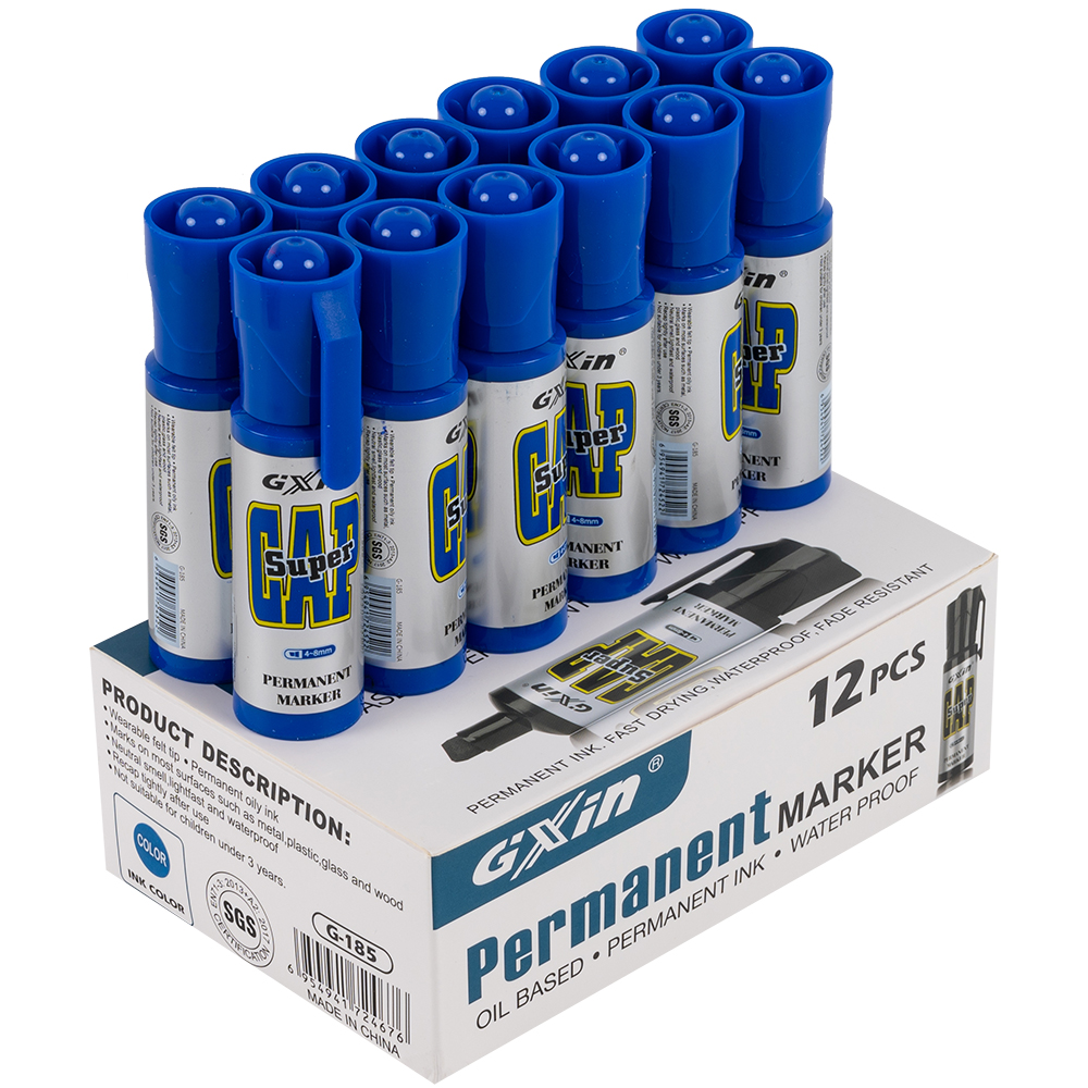 Маркер перманентный Gxin «Super cap» G-185, на масляной основе, толщиной пера от 4 до 8 мм, синего цвета, скошенный наконечник. Продается упаковками, упаковка – картонная коробка, вложение в коробку – 12 маркеров. Производится в Китае.