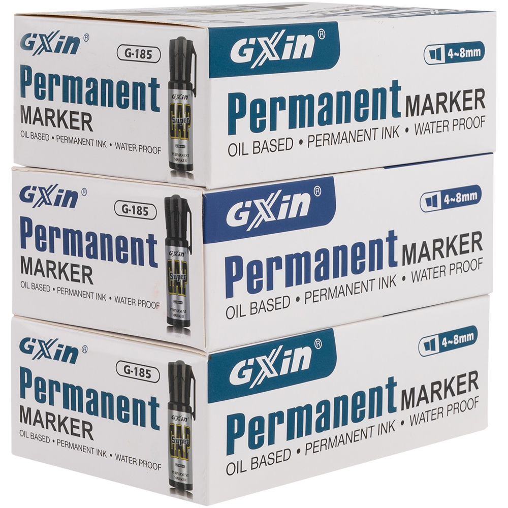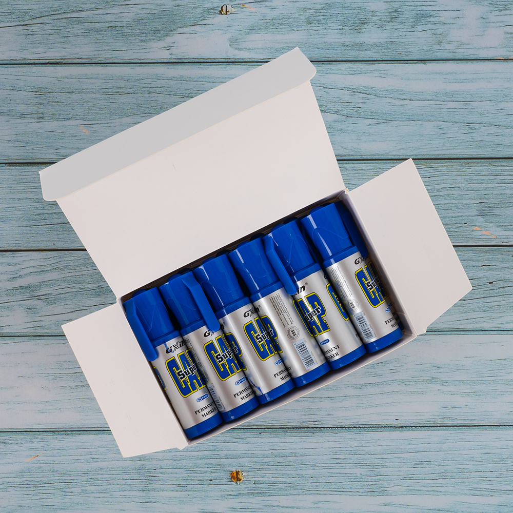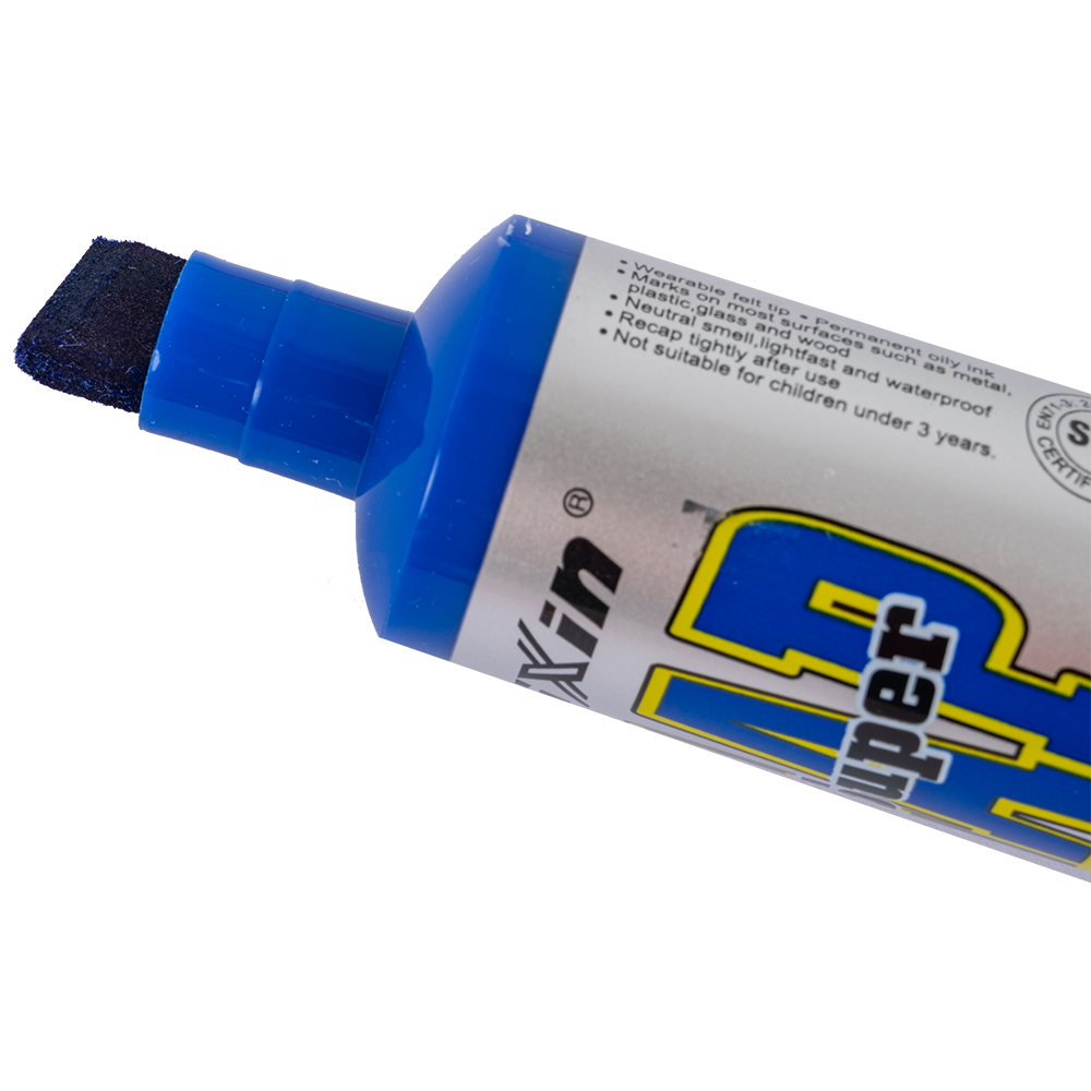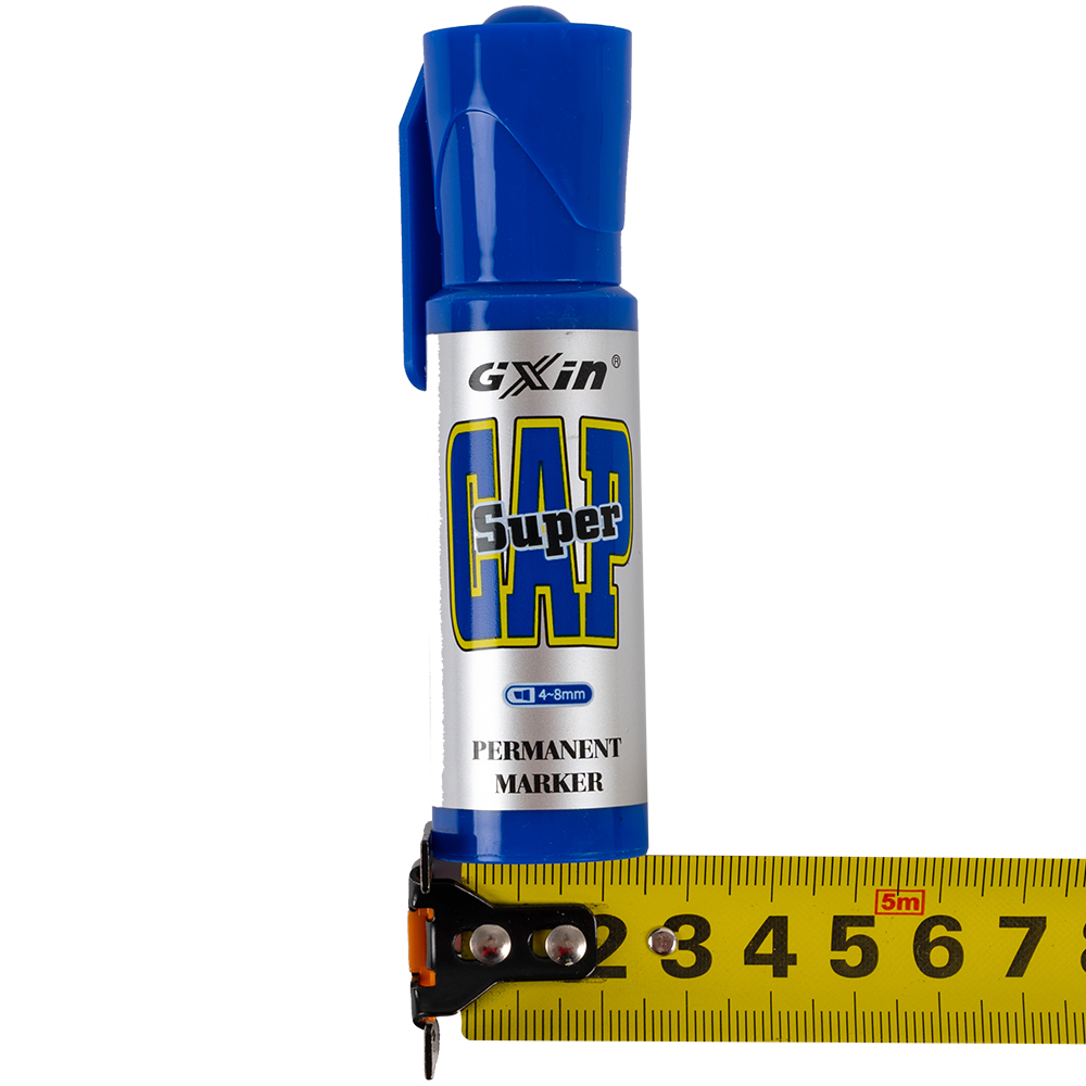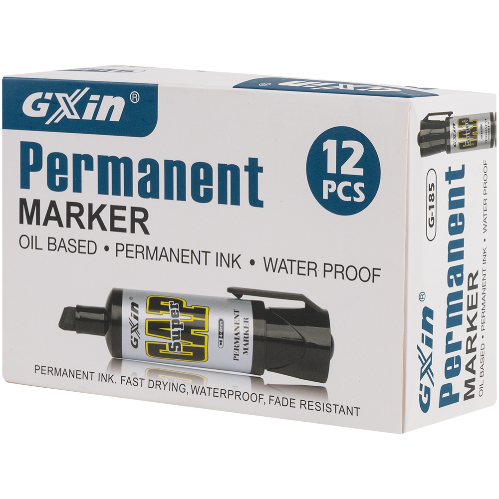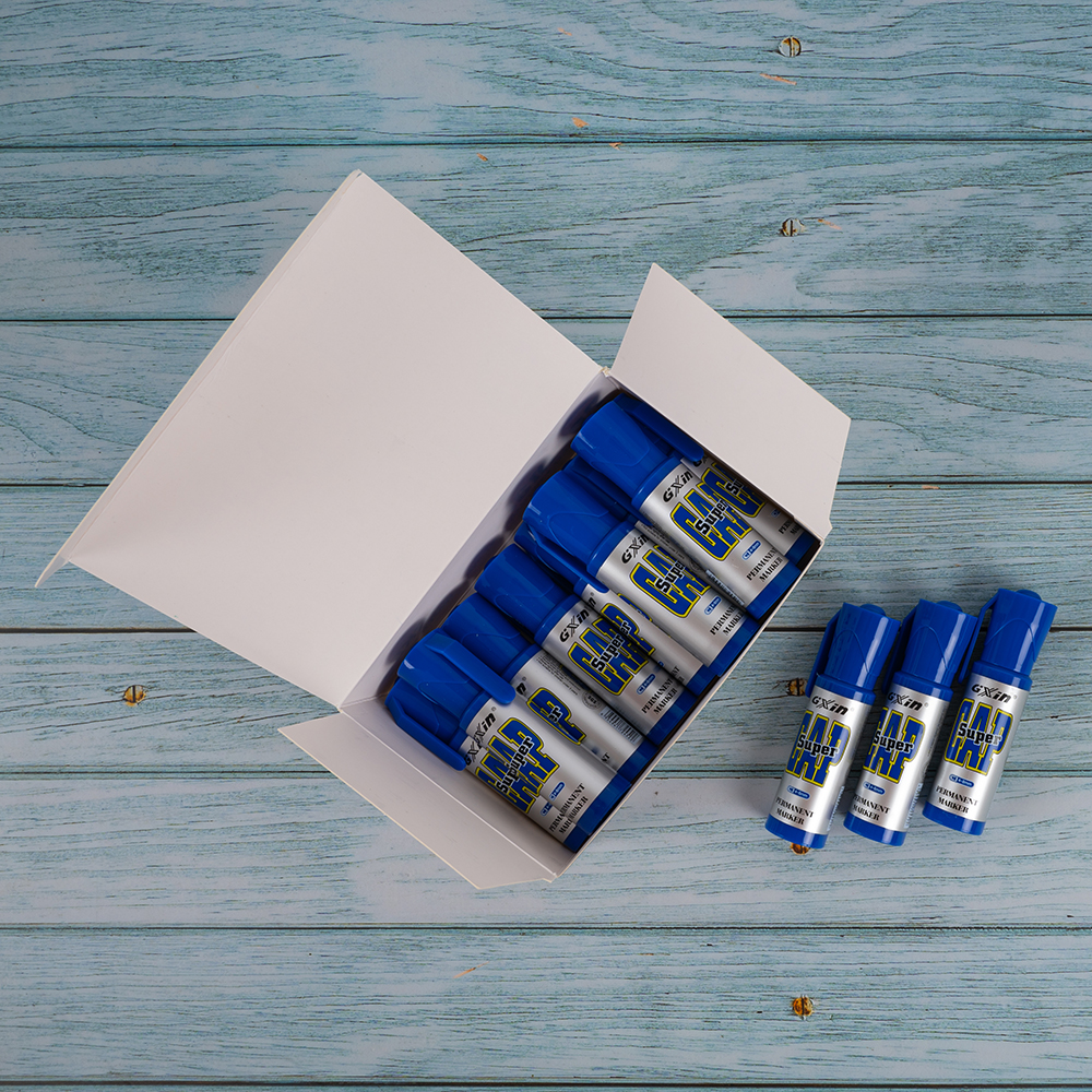 Маркер перманентный Gxin «Super cap» G-185, на масляной основе, толщиной пера от 4 до 8 мм, синего цвета, скошенный наконечник. Продается упаковками, упаковка – картонная коробка, вложение в коробку – 12 маркеров. Производится в Китае.