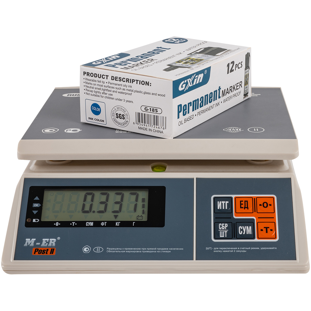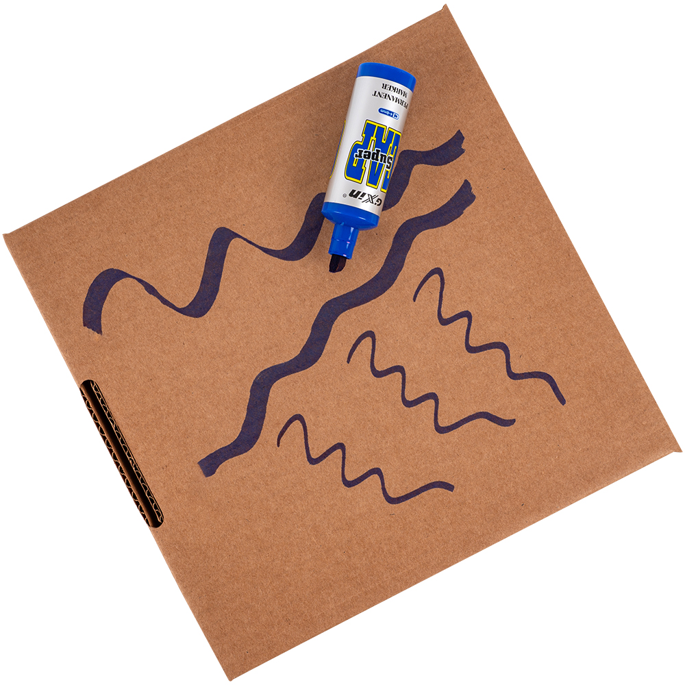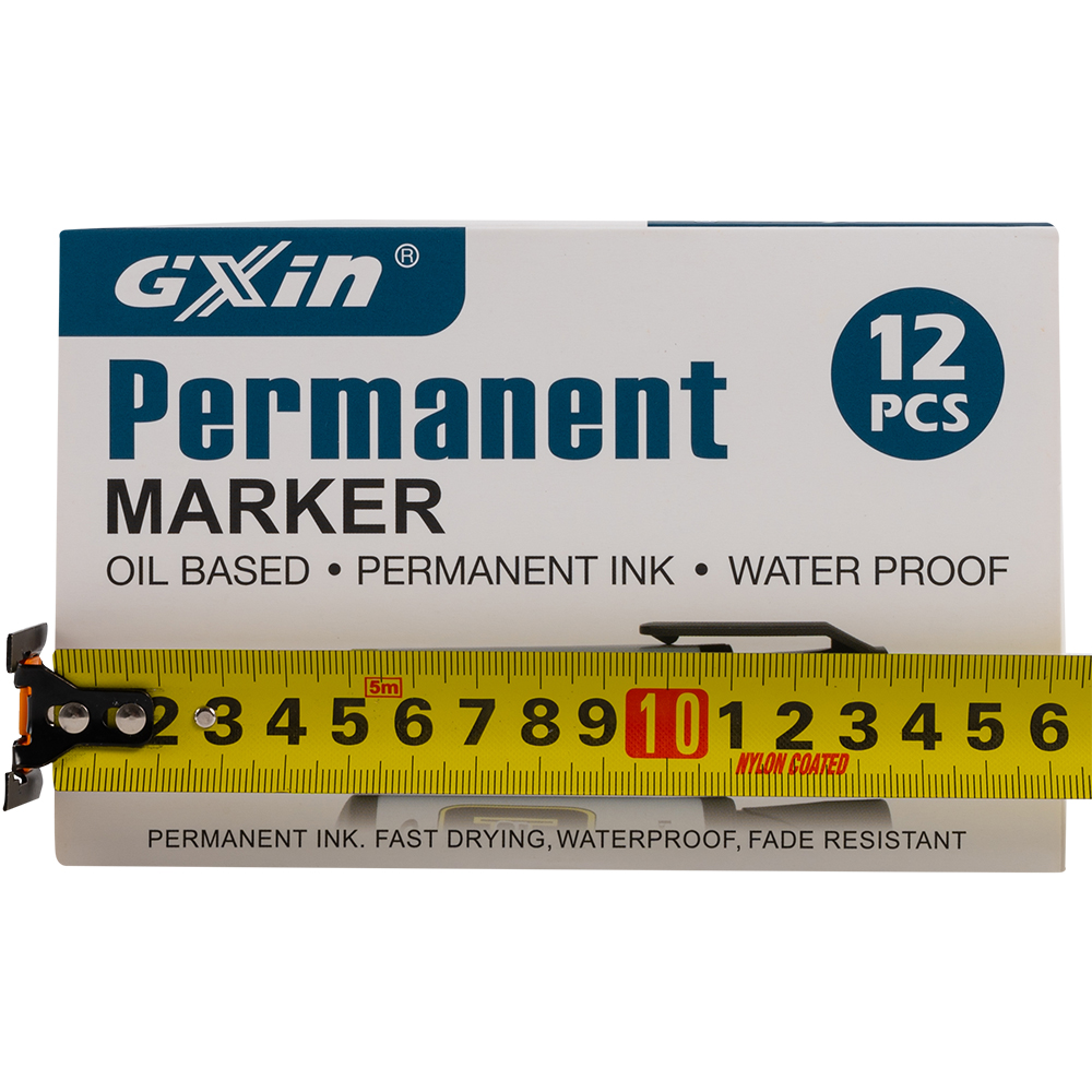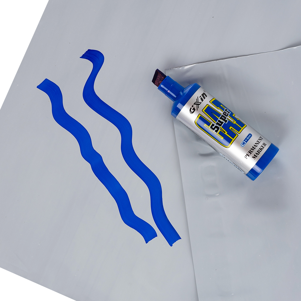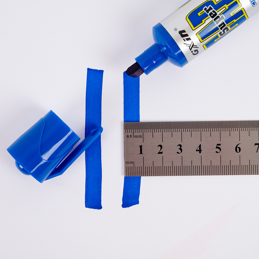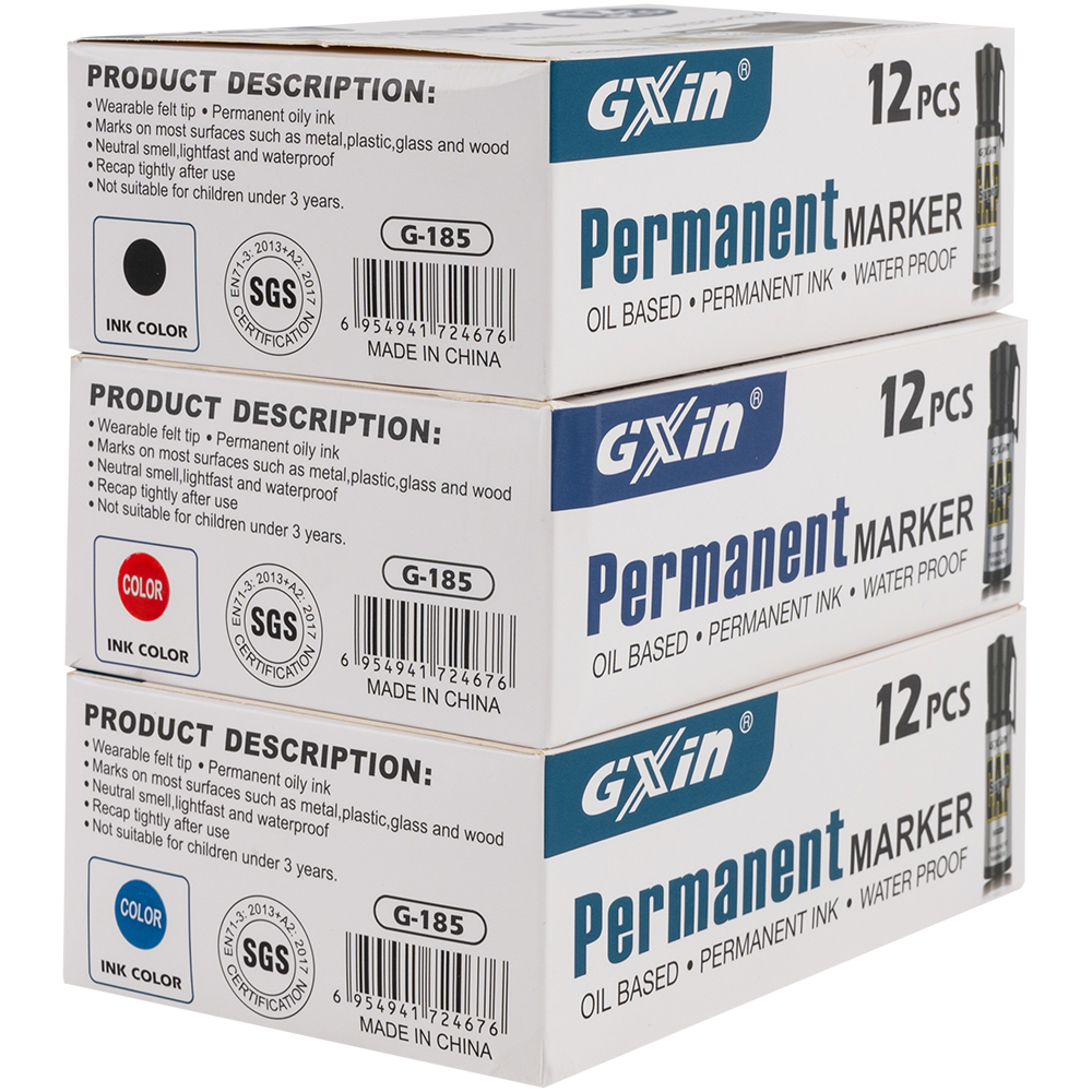 Маркер перманентный Gxin «Super cap» G-185, на масляной основе, толщиной пера от 4 до 8 мм, синего цвета, скошенный наконечник. Продается упаковками, упаковка – картонная коробка, вложение в коробку – 12 маркеров. Производится в Китае.