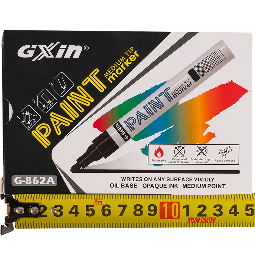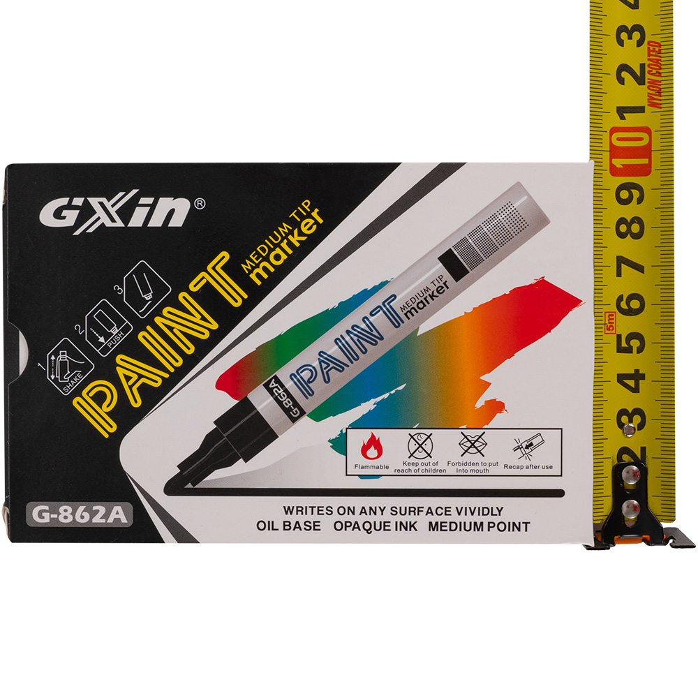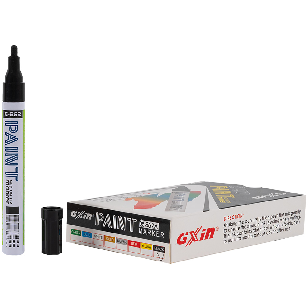 Маркер-краска Gxin G-862A – профессиональный лаковый перманентный маркер на масляной основе, толщиной пера 4 мм, черного цвета, круглый наконечник. Продается упаковками, упаковка – картонная коробка, вложение в коробку – 12 маркеров. Производится в Китае.