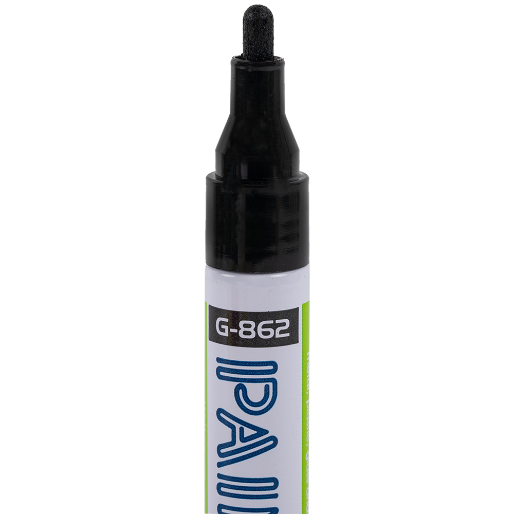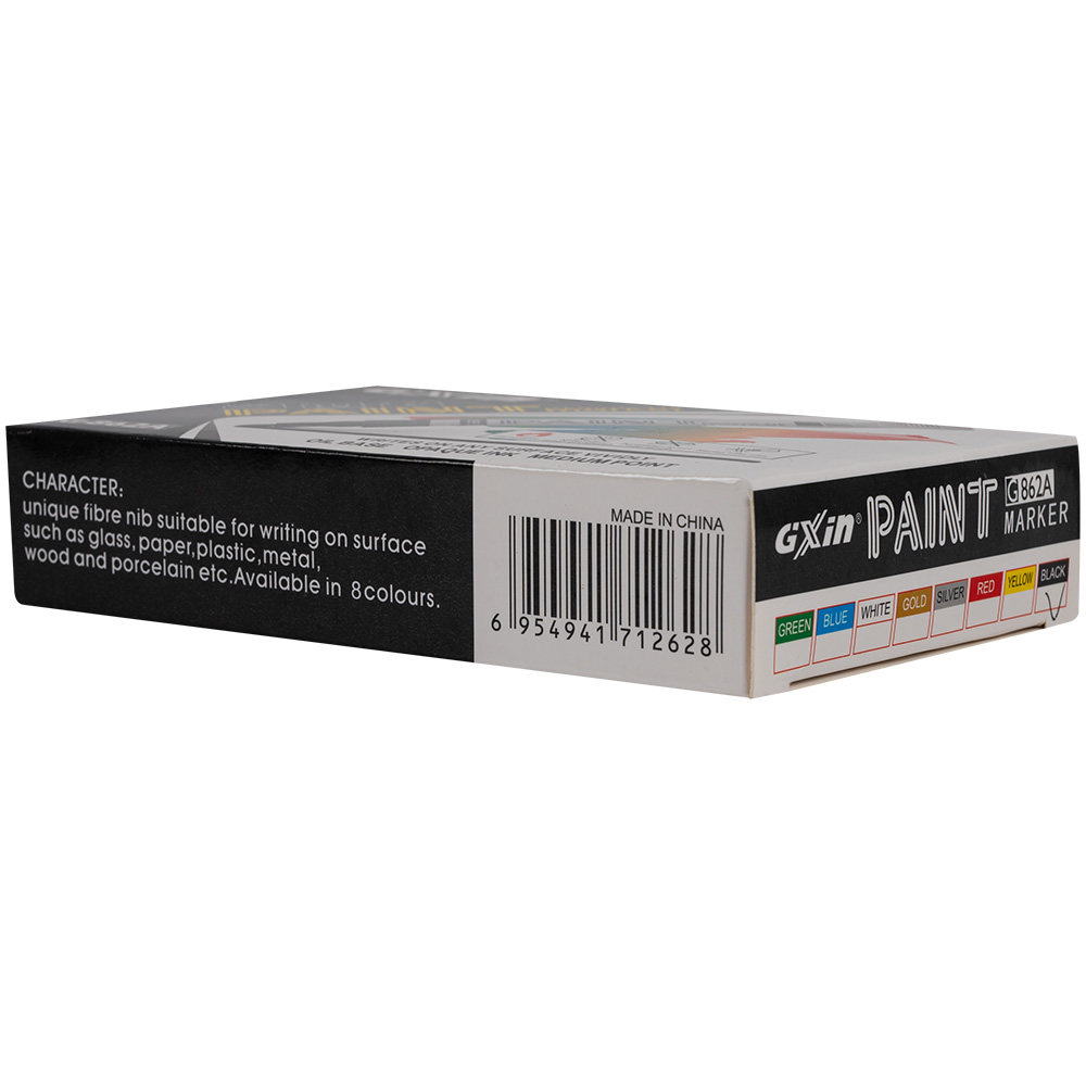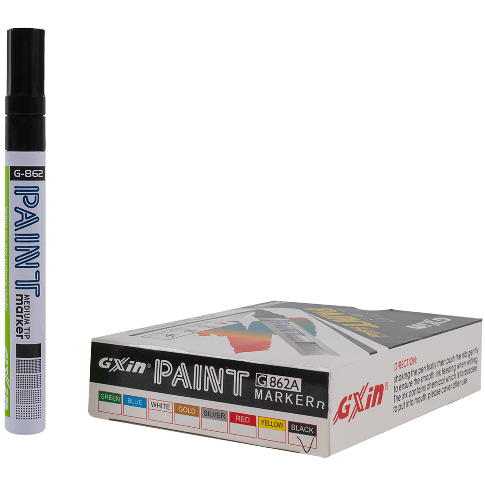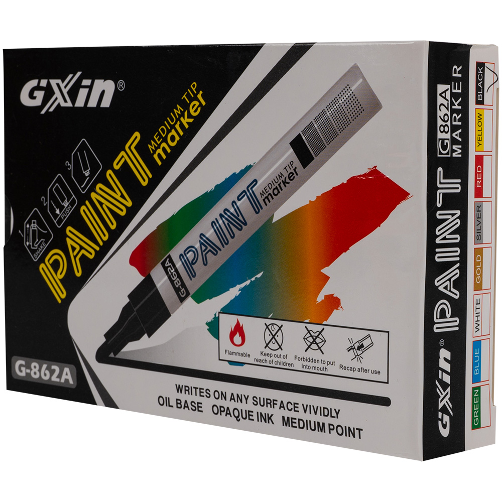 Маркер-краска Gxin G-862A – профессиональный лаковый перманентный маркер на масляной основе, толщиной пера 4 мм, черного цвета, круглый наконечник. Продается упаковками, упаковка – картонная коробка, вложение в коробку – 12 маркеров. Производится в Китае.