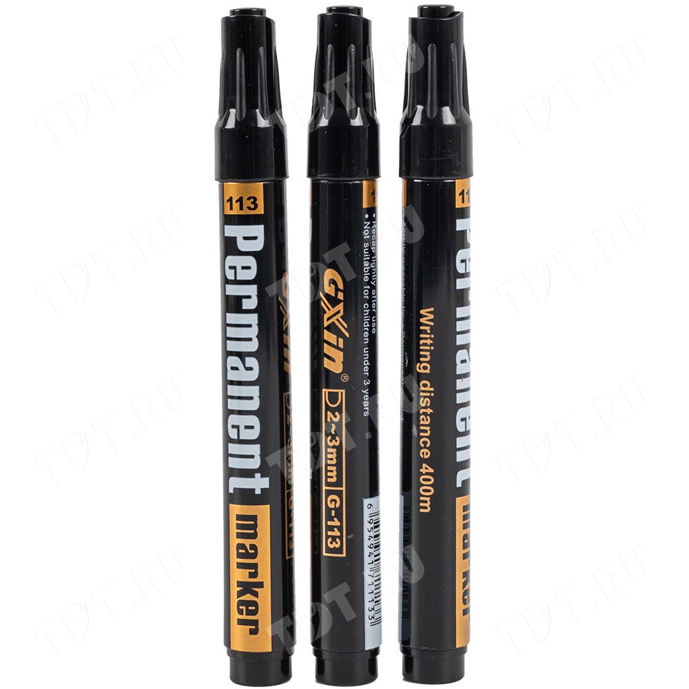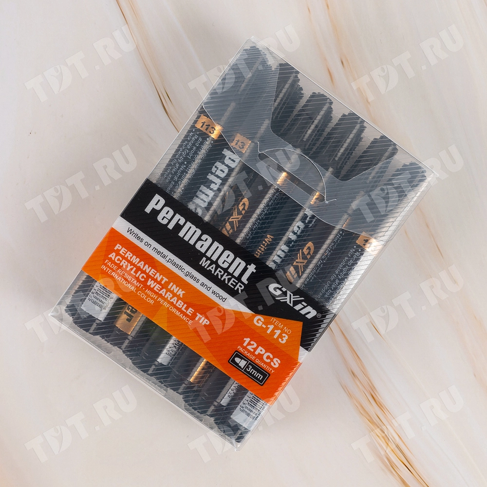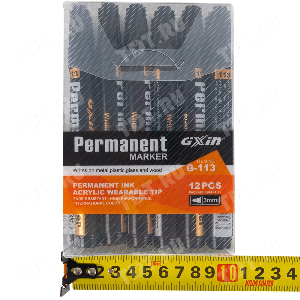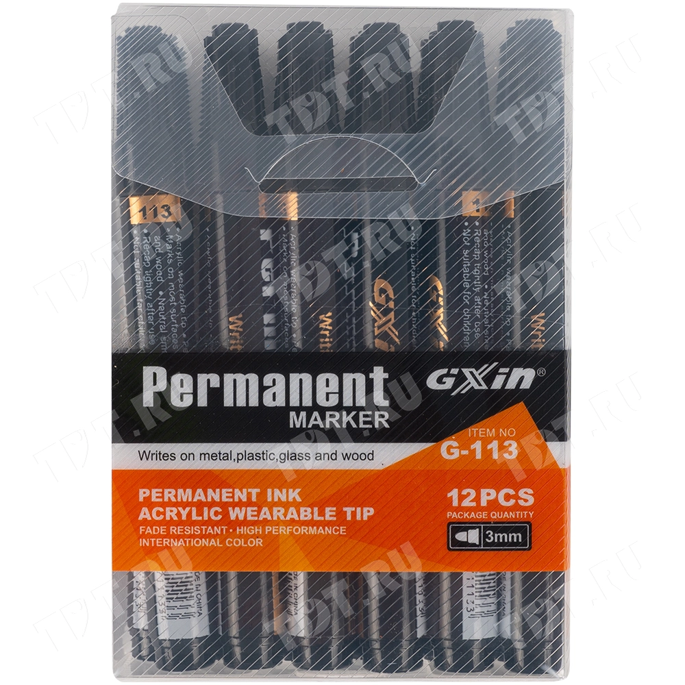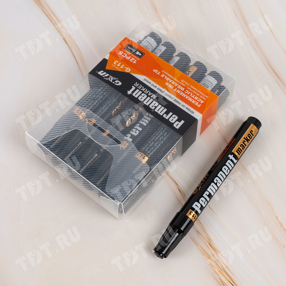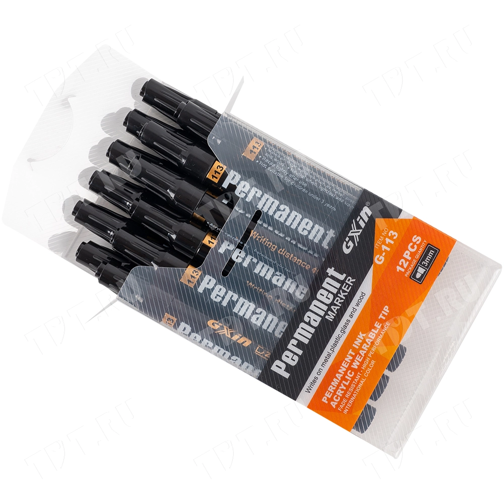 Маркер перманентный Gxin G-113, на спиртовой основе, толщиной пера 3 мм, черного цвета, пулевидный наконечник. Продается упаковками, упаковка – пластиковый бокс с европодвесом, вложение в бокс – 12 маркеров. Производится в Китае.