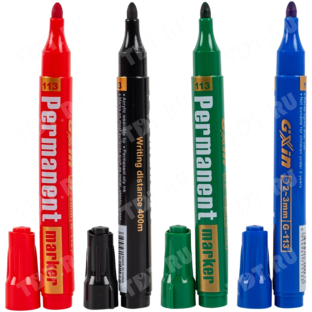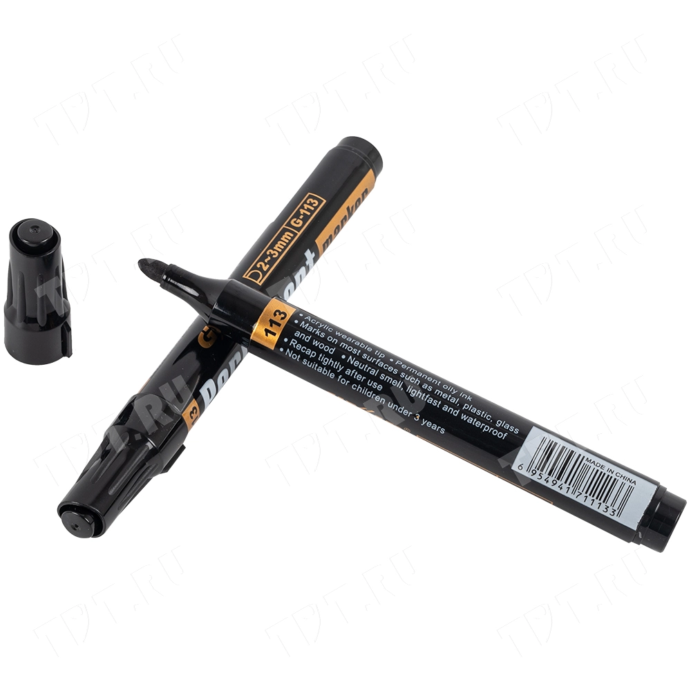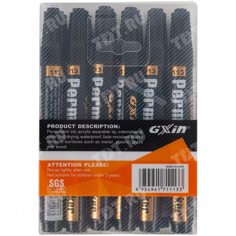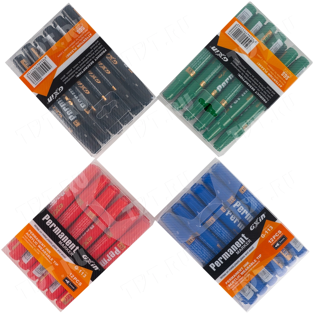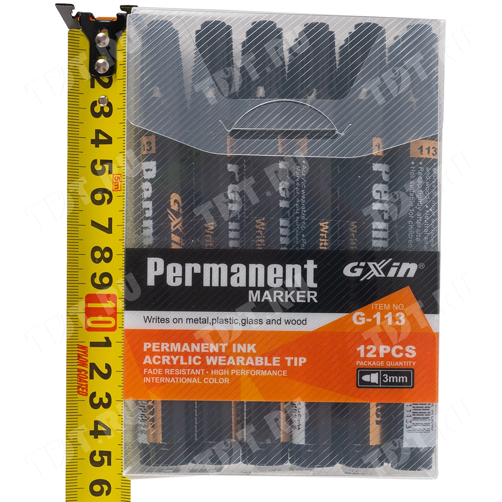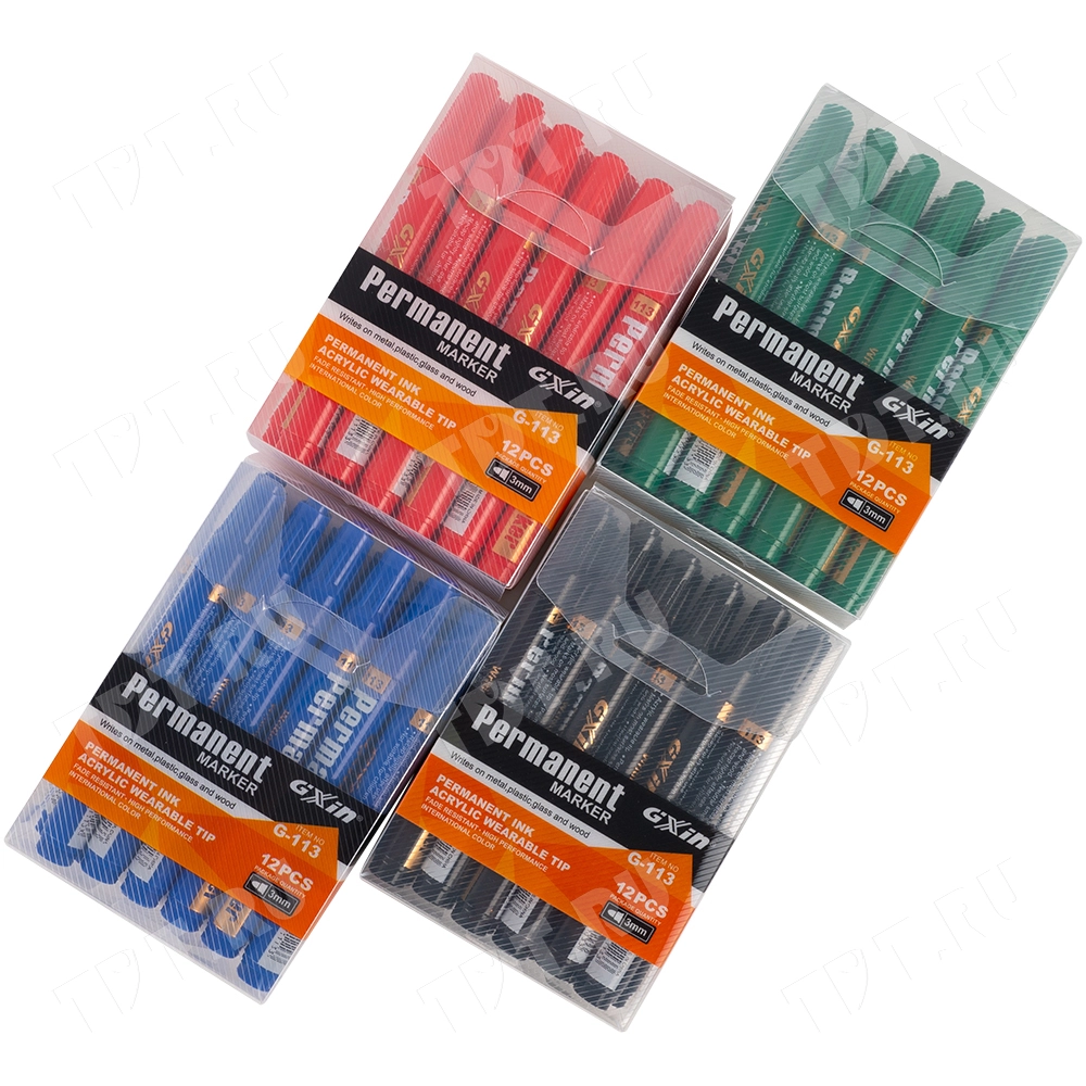 Маркер перманентный Gxin G-113, на спиртовой основе, толщиной пера 3 мм, черного цвета, пулевидный наконечник. Продается упаковками, упаковка – пластиковый бокс с европодвесом, вложение в бокс – 12 маркеров. Производится в Китае.