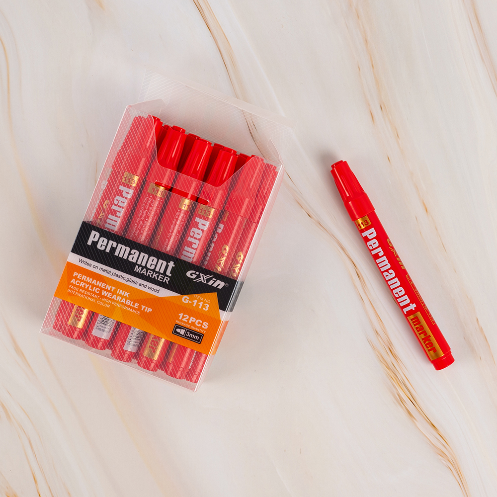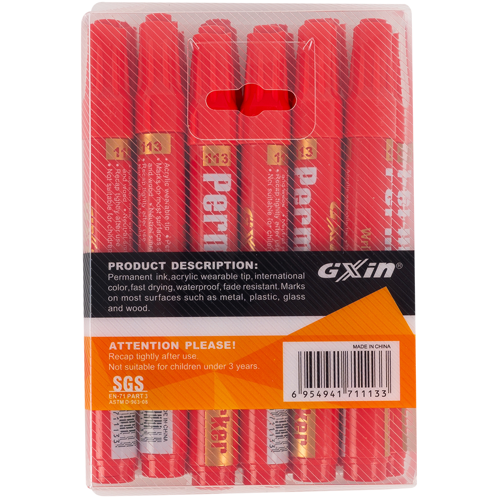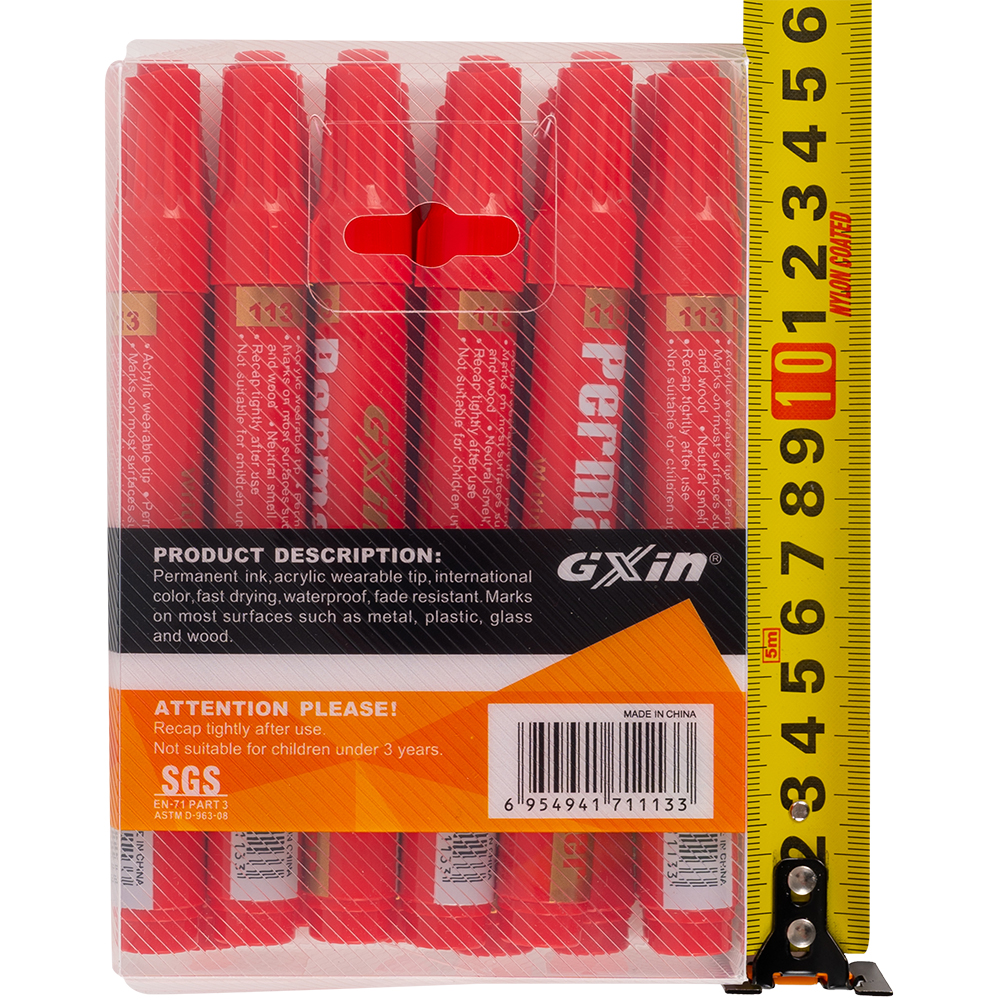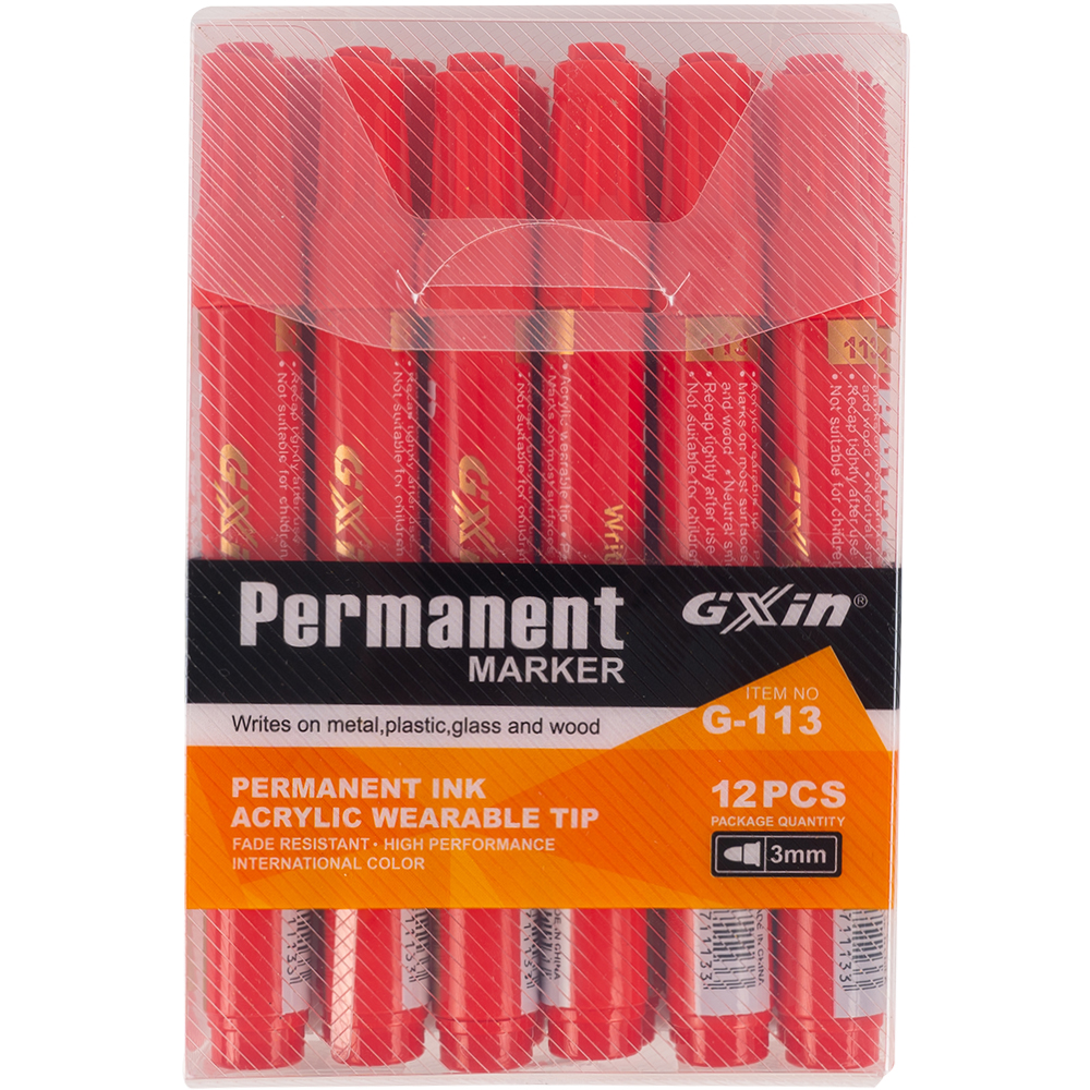 Маркер перманентный Gxin G-113, на спиртовой основе, толщиной пера 3 мм, красного цвета, пулевидный наконечник. Продается упаковками, упаковка – пластиковый бокс с европодвесом, вложение в бокс – 12 маркеров. Производится в Китае.