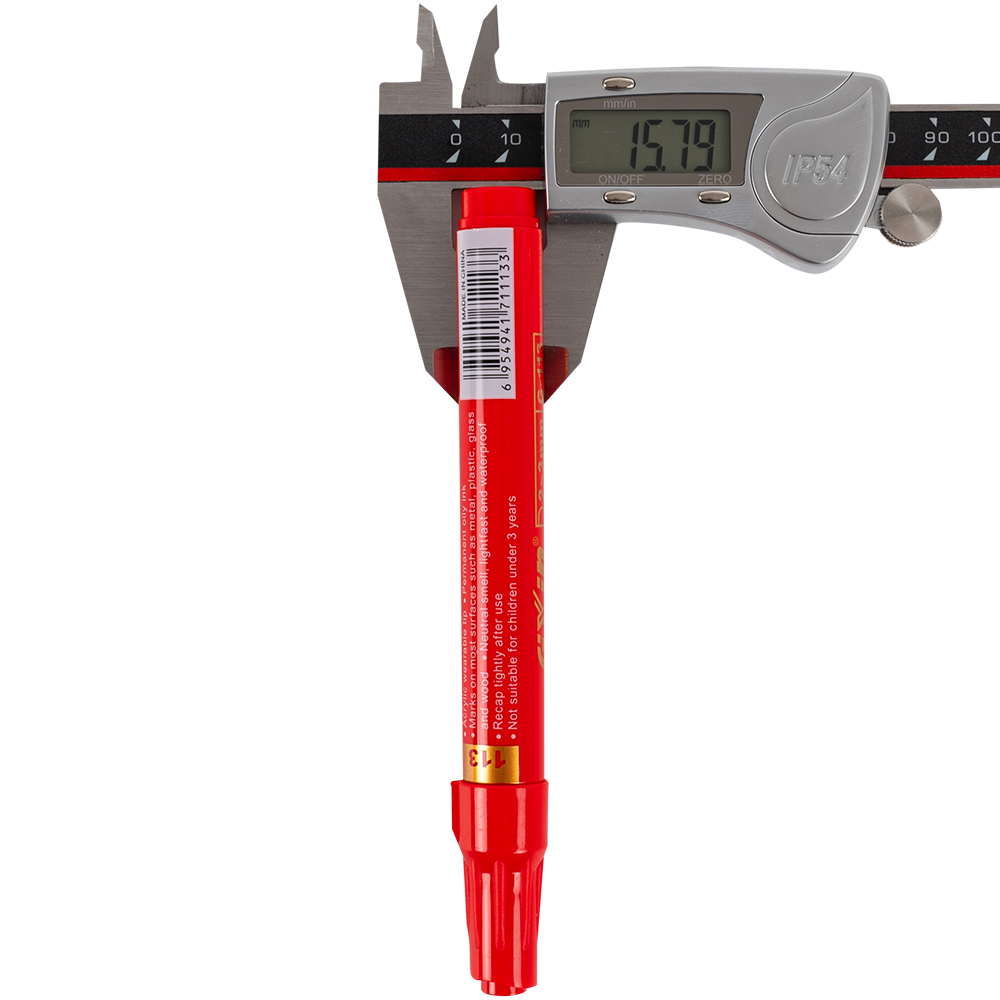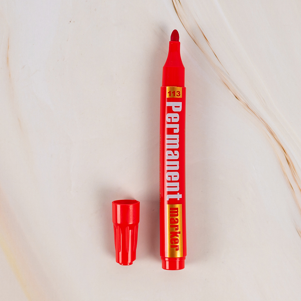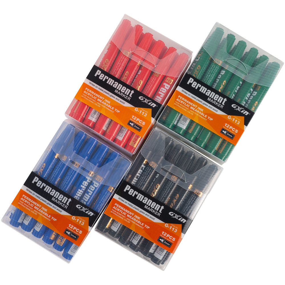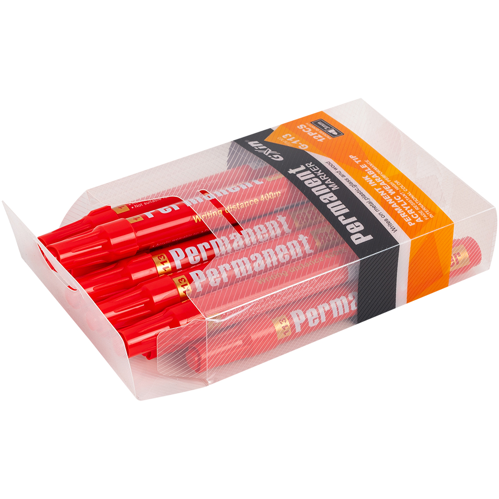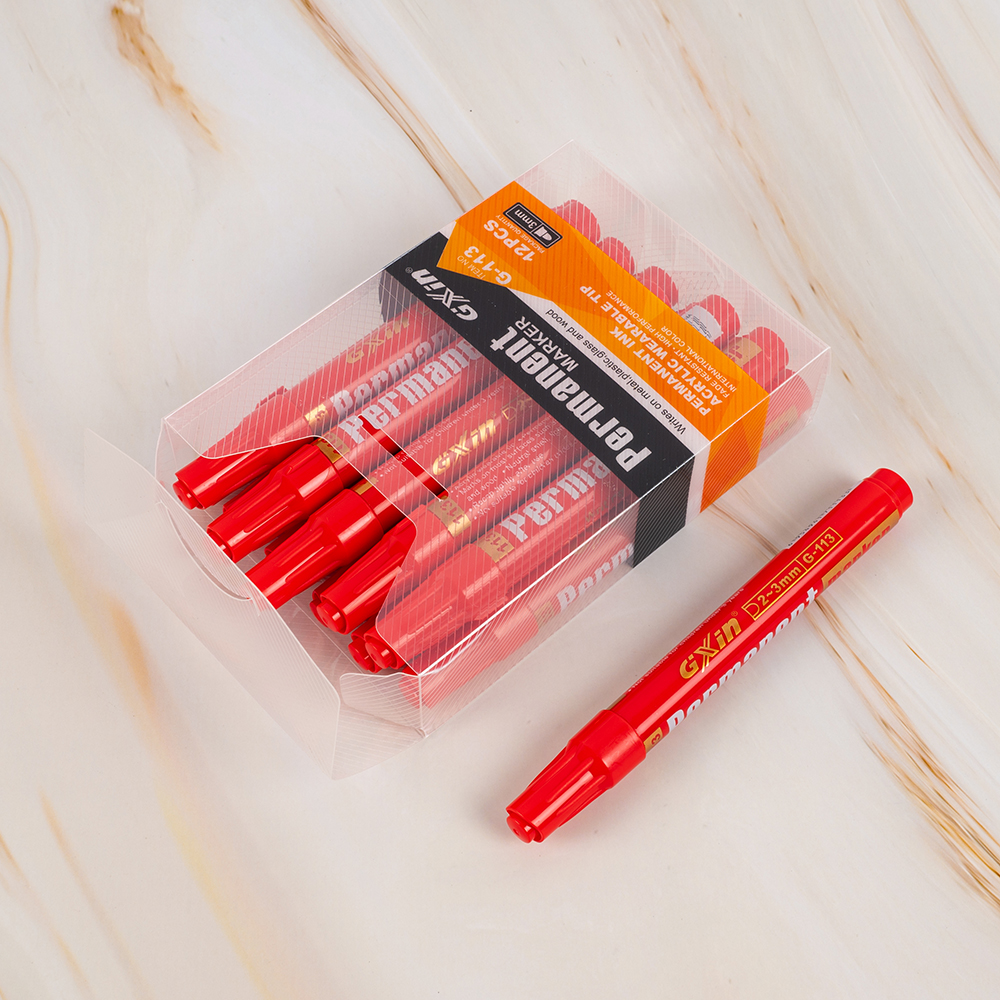 Маркер перманентный Gxin G-113, на спиртовой основе, толщиной пера 3 мм, красного цвета, пулевидный наконечник. Продается упаковками, упаковка – пластиковый бокс с европодвесом, вложение в бокс – 12 маркеров. Производится в Китае.