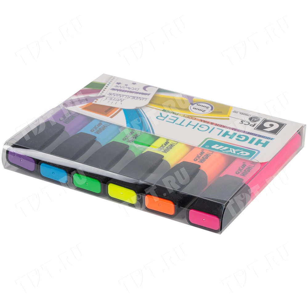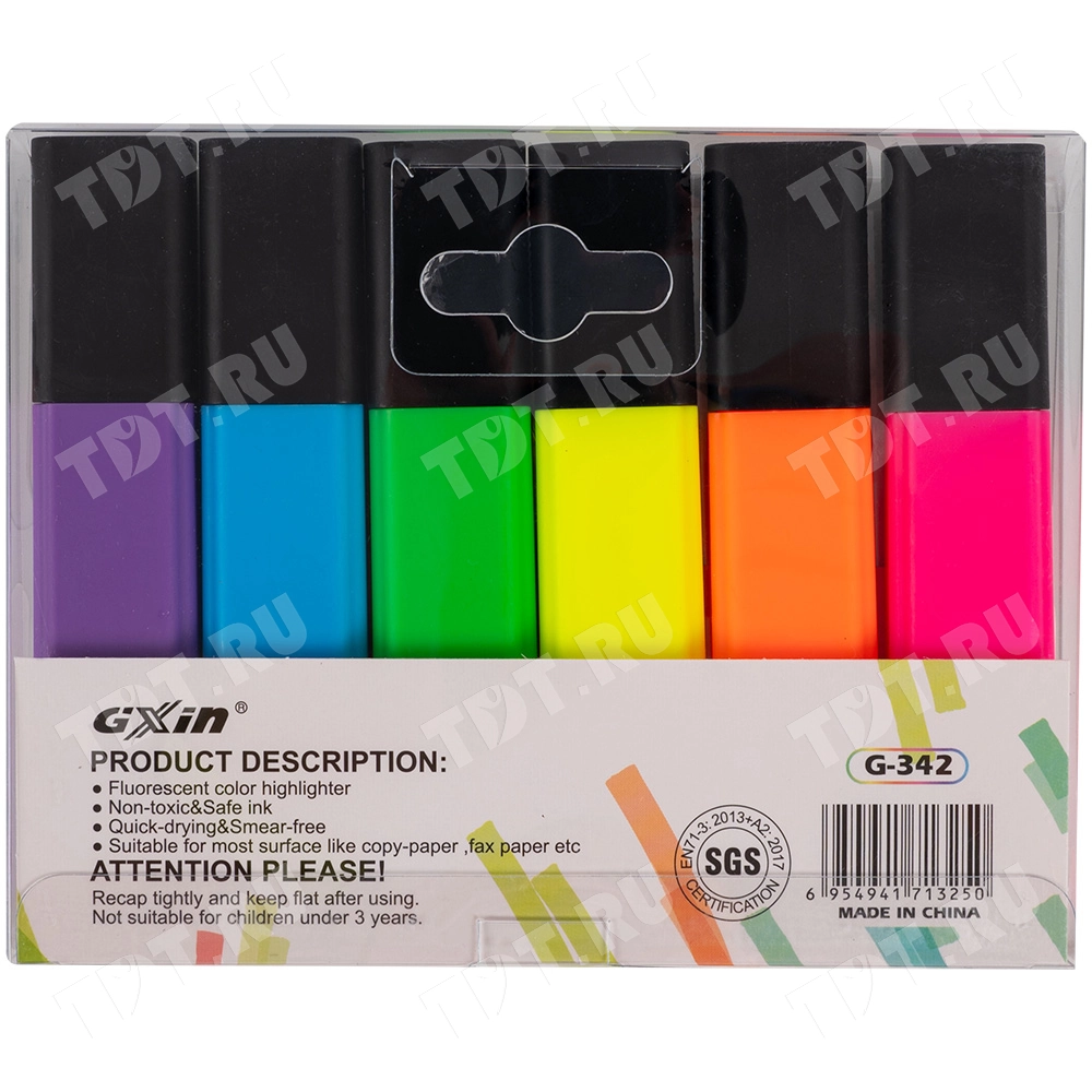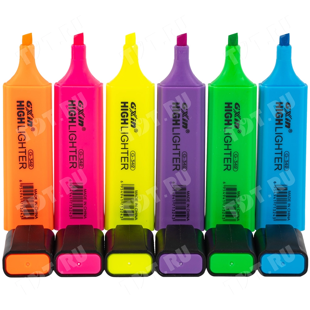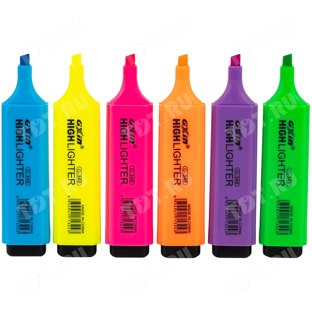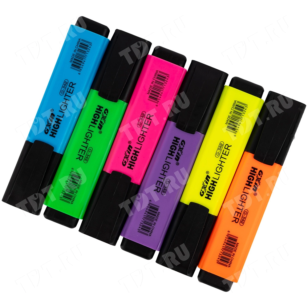 Текстовыделитель Gxin Highlighter G-342, на водной основе, толщиной пера 2-5 мм, скошенный наконечник. Набор из шести неоновых цветов – желтый, оранжевый, салатовый, розовый, голубой, фиолетовый. Продается упаковками, упаковка – пластиковый бокс с европодвесом, вложение в бокс – 6 маркеров разного цвета. Производятся в Китае.
