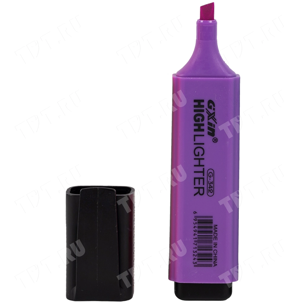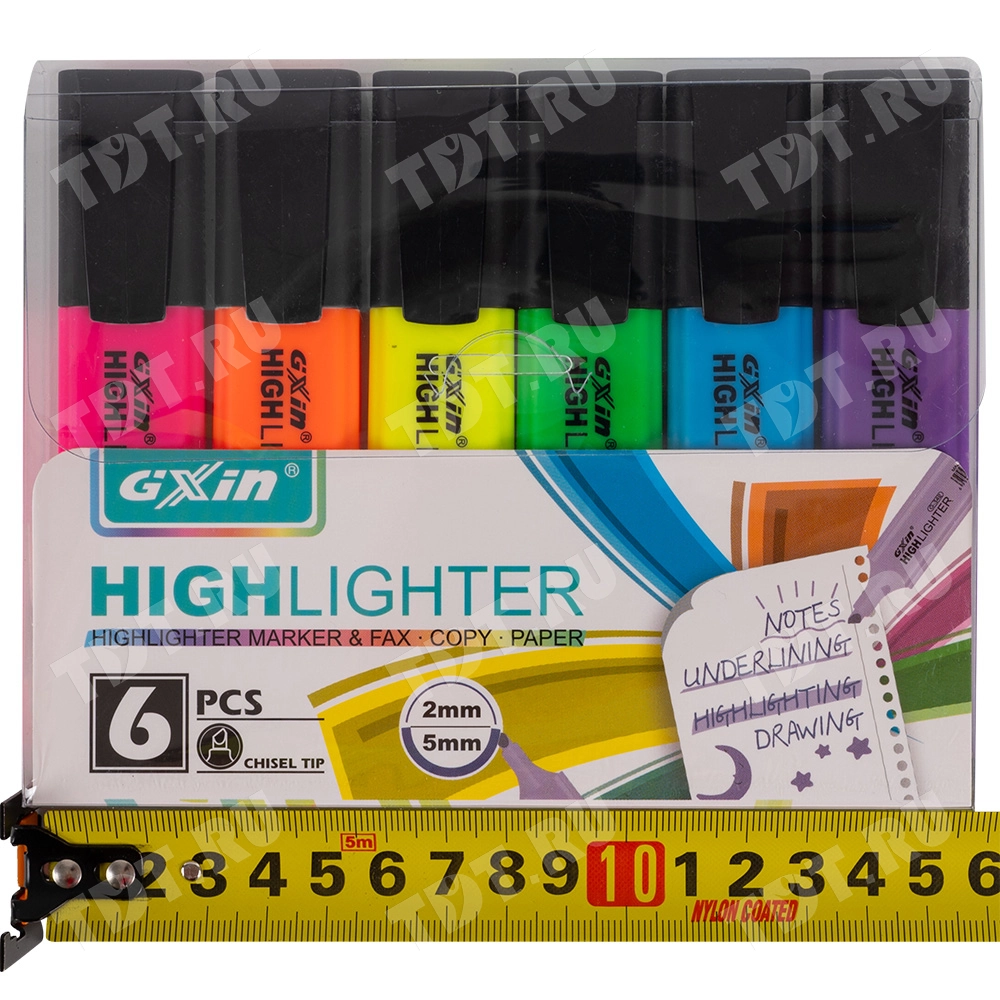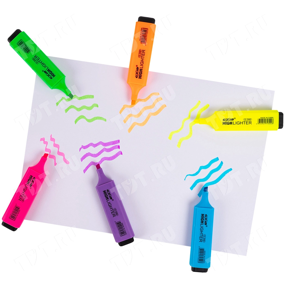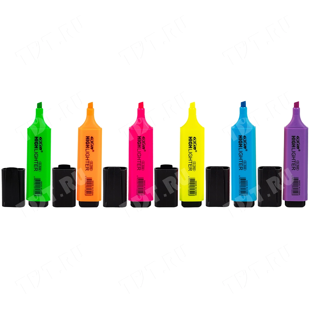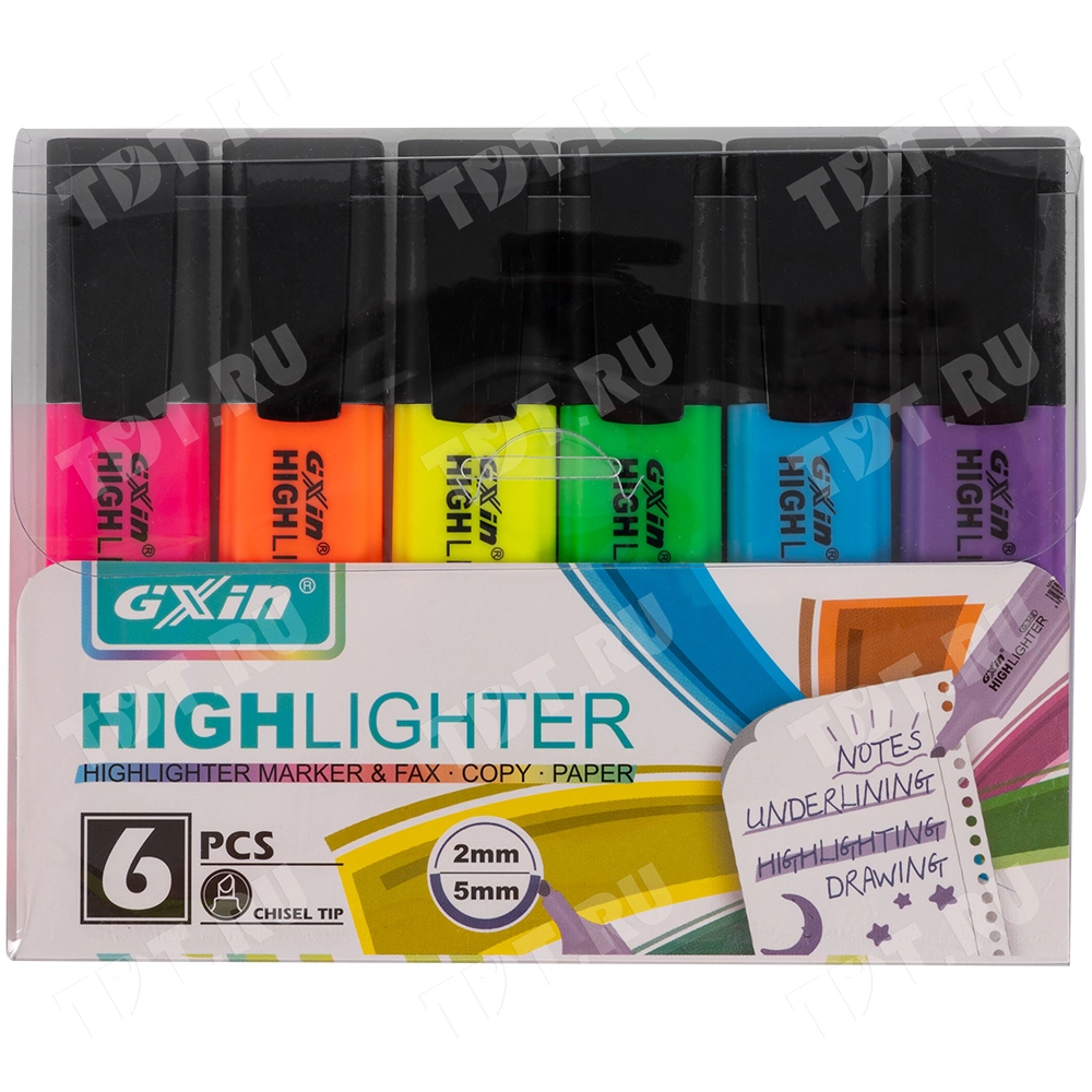 Текстовыделитель Gxin Highlighter G-342, на водной основе, толщиной пера 2-5 мм, скошенный наконечник. Набор из шести неоновых цветов – желтый, оранжевый, салатовый, розовый, голубой, фиолетовый. Продается упаковками, упаковка – пластиковый бокс с европодвесом, вложение в бокс – 6 маркеров разного цвета. Производятся в Китае.