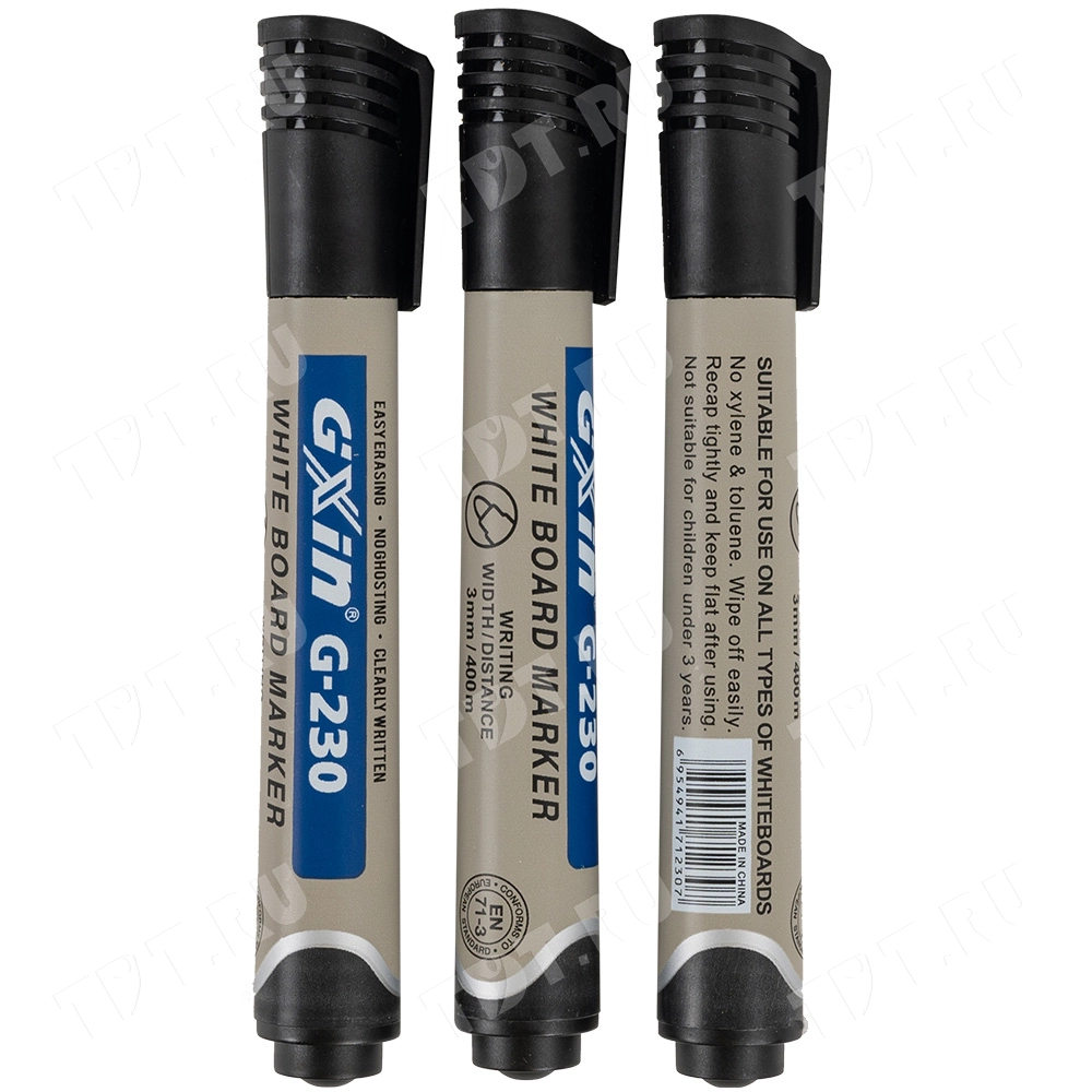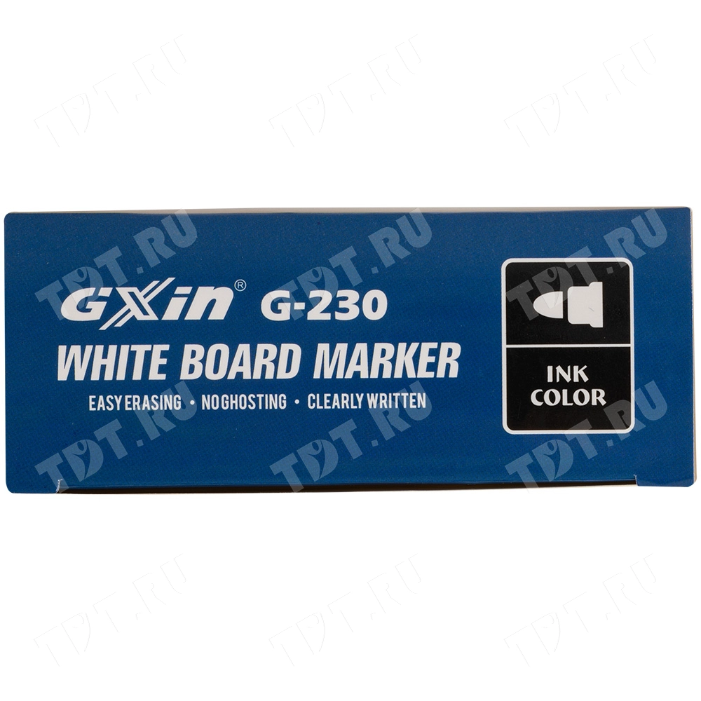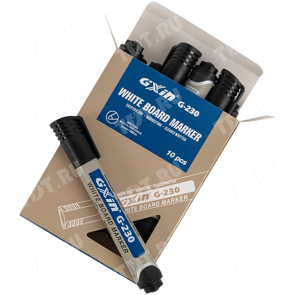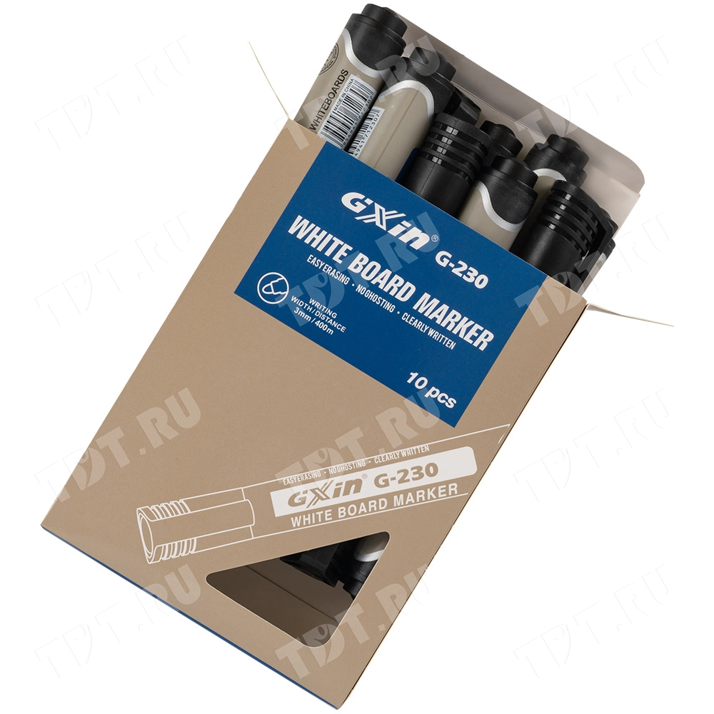 Маркеры Gxin G-230 для любых магнитных досок, на спиртовой основе, толщиной пера 3 мм, черного цвета, пулевидный наконечник. Продаются упаковками, упаковка – картонная коробка, вложение в коробку – 10 маркеров. Производится в Китае.