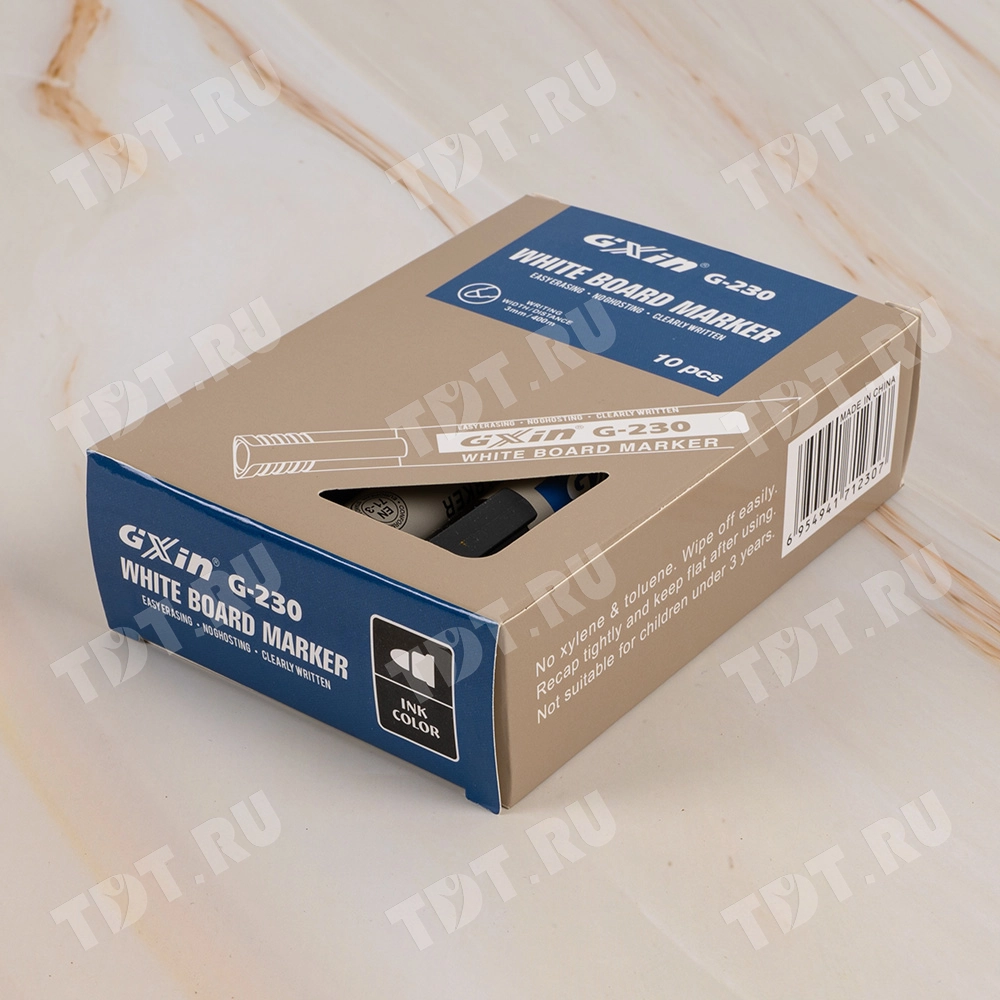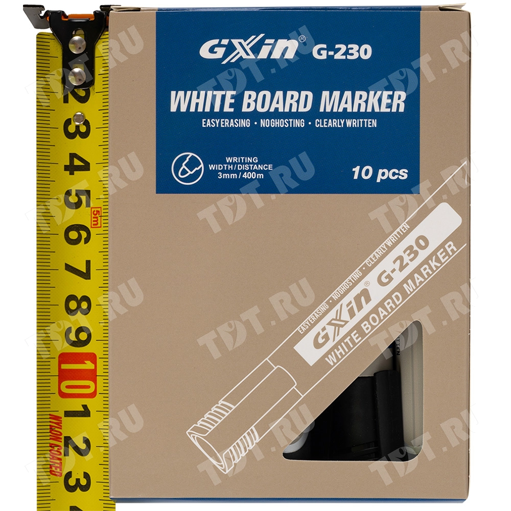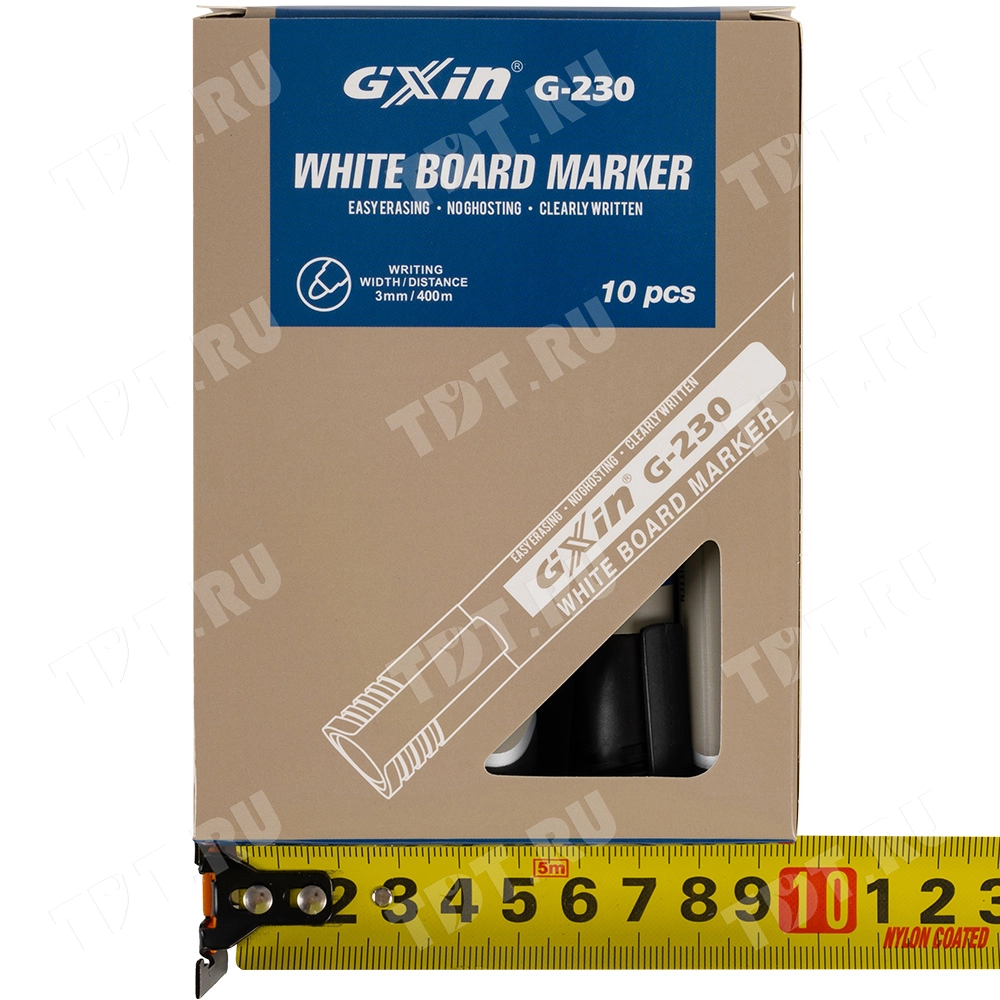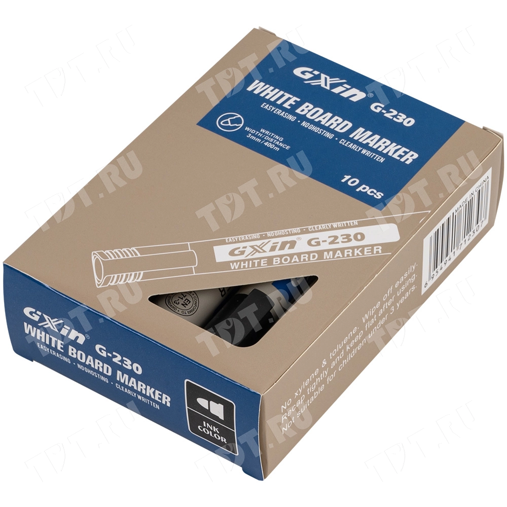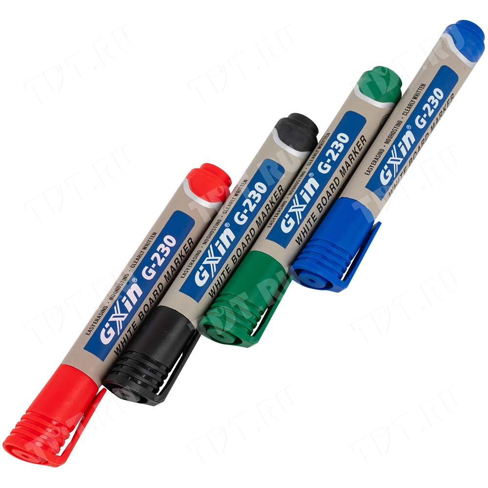 Маркеры Gxin G-230 для любых магнитных досок, на спиртовой основе, толщиной пера 3 мм, черного цвета, пулевидный наконечник. Продаются упаковками, упаковка – картонная коробка, вложение в коробку – 10 маркеров. Производится в Китае.