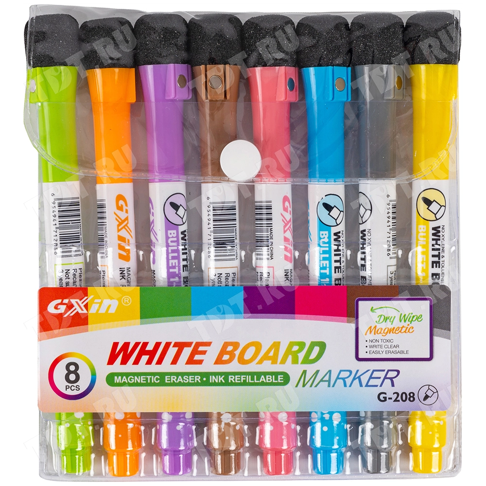 Маркеры с магнитом и ластиком Gxin G-208CL/8 для любых магнитных досок, на спиртовой основе, толщиной пера 1-2 мм, пулевидный наконечник. Набор из восьми цветов – черный, красный, синий, зеленый, желтый, оранжевый, фиолетовый, коричневый. Продаются упаковками, упаковка – ОПП бокс с европодвесом, вложение в бокс – 8 маркеров. Производится в Китае.