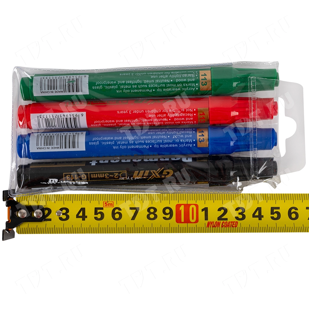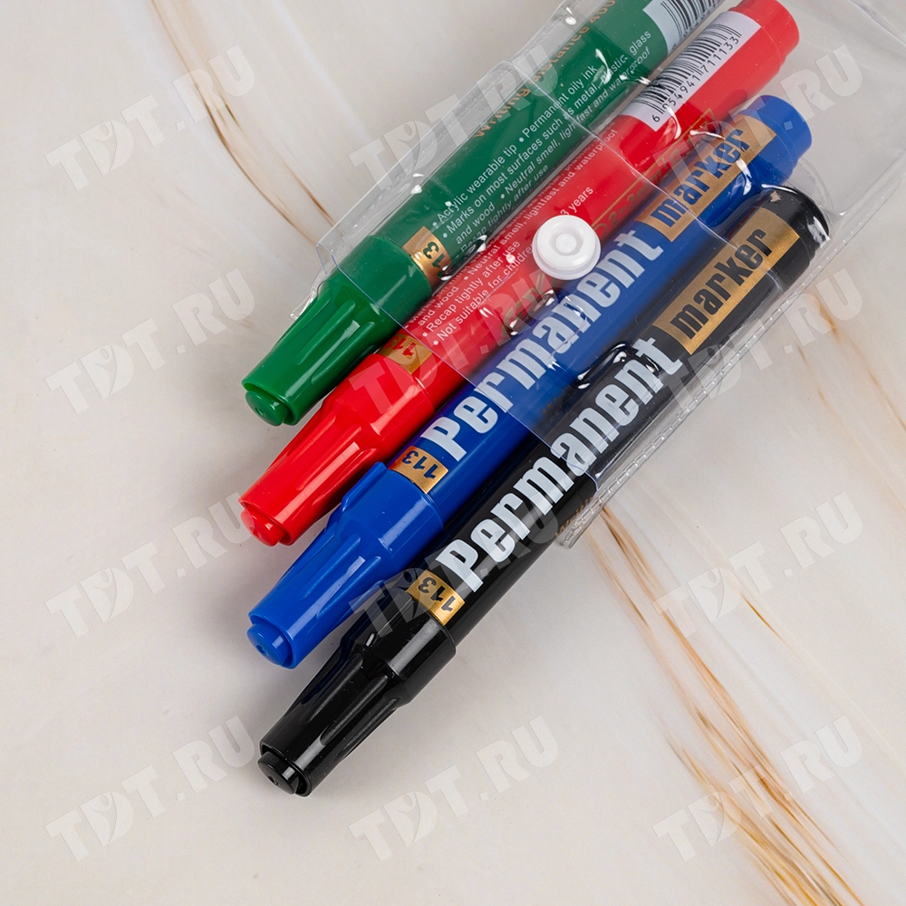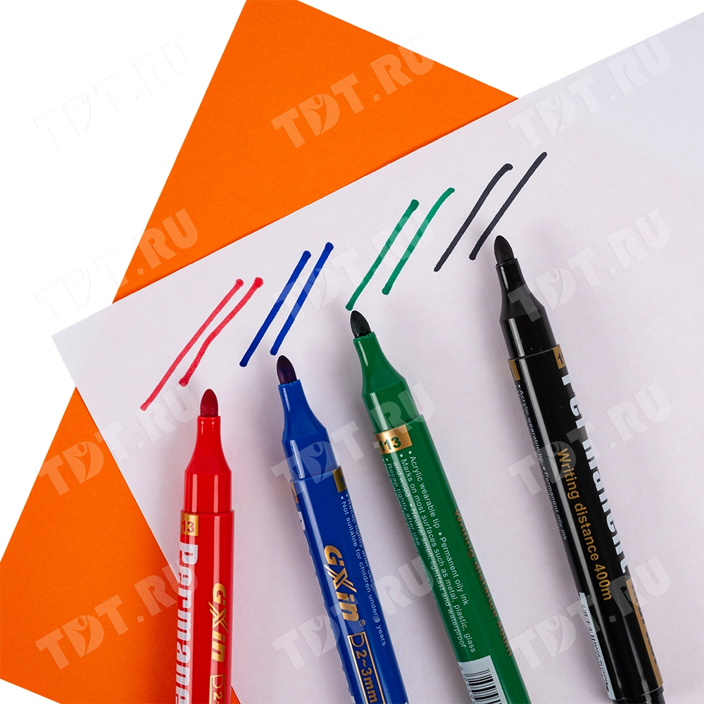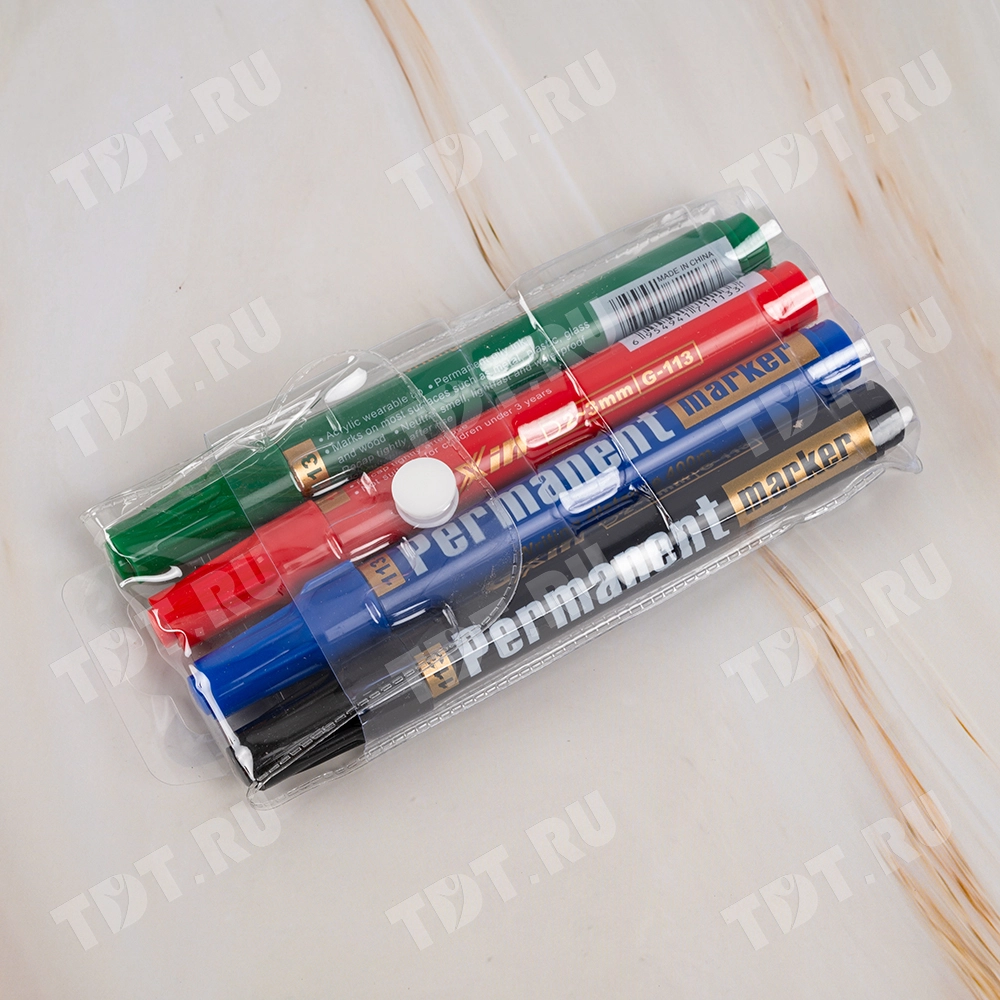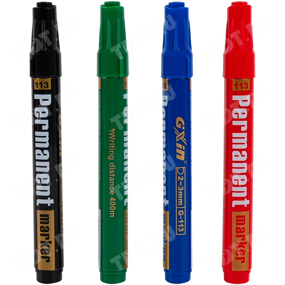 Маркер перманентный Gxin G-113-4, на спиртовой основе, толщиной пера 3 мм, пулевидный наконечник. Набор из четырех цветов – черный, красный, синий, зеленый. Продаются упаковками, упаковка – ОПП бокс с европодвесом, вложение в бокс – 4 маркера. Производится в Китае.
