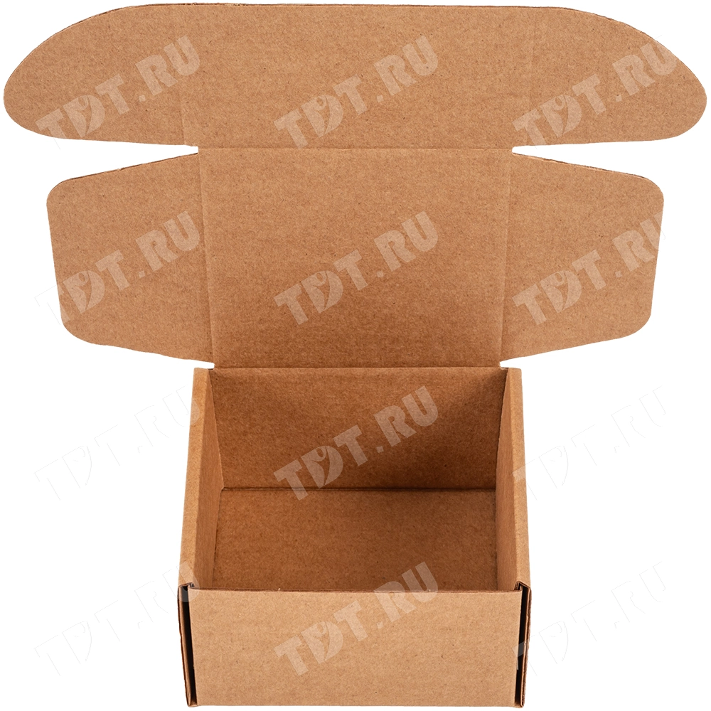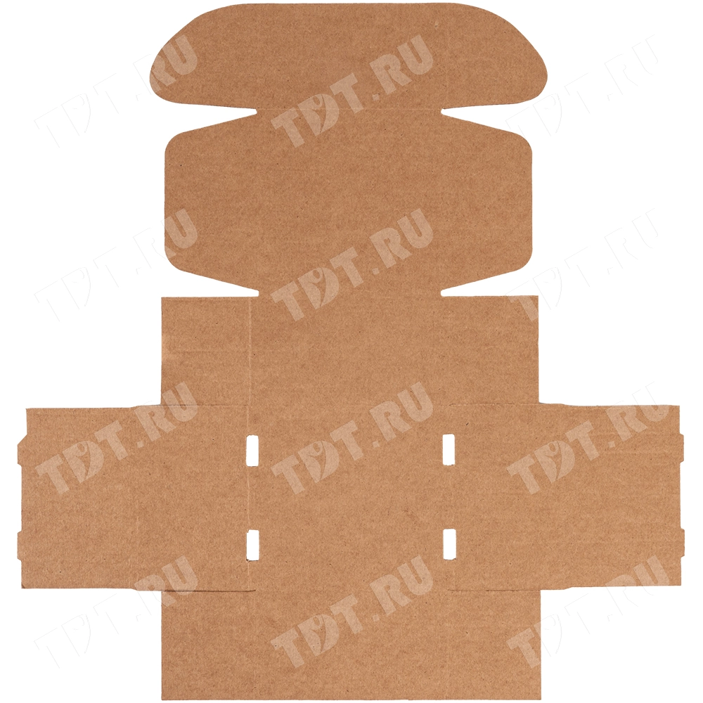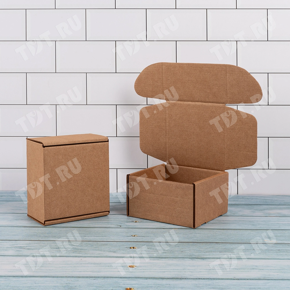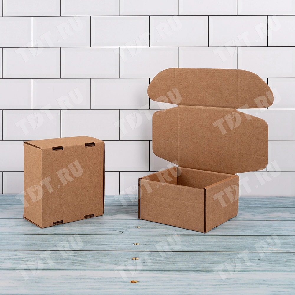 Самосборный короб №124 бурого цвета, длиной 100 мм, шириной 100 мм и высотой 60 мм. Изготовлен из гофрокартона Т-23 Е. Полезный объём — 0.6 л.