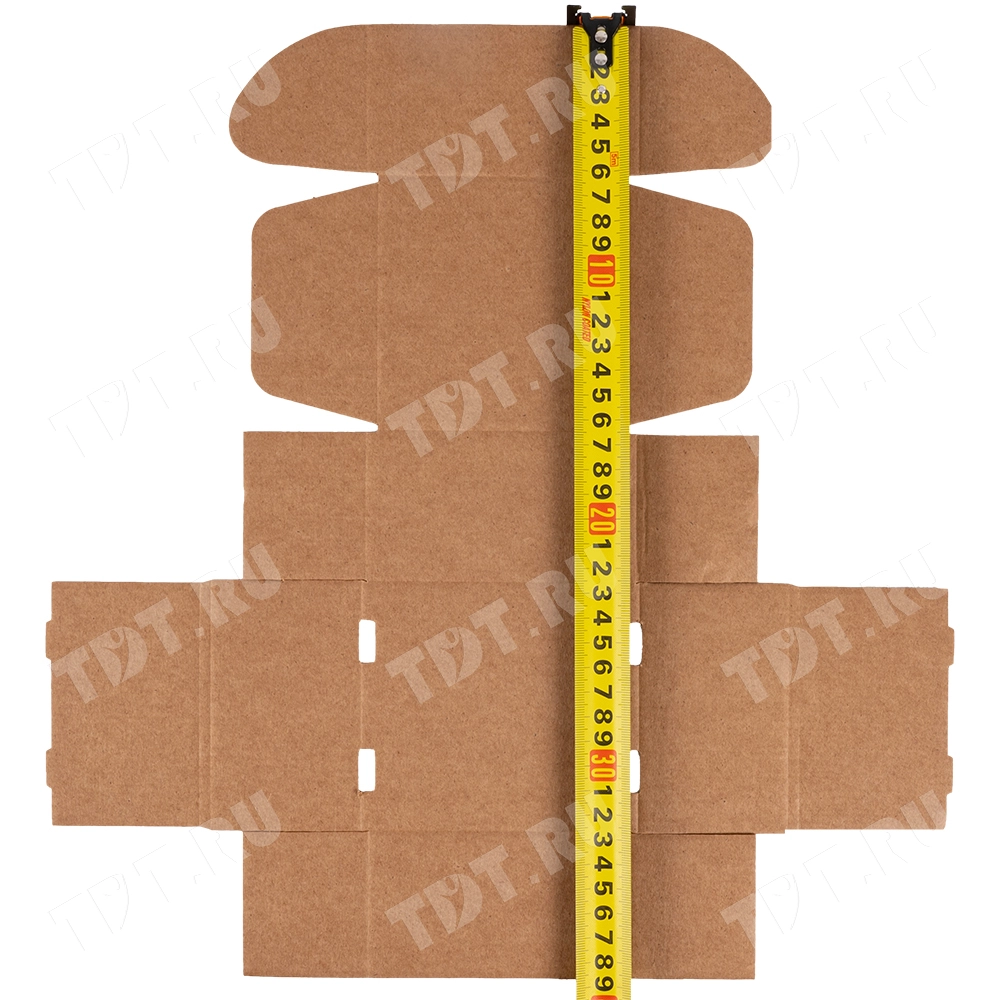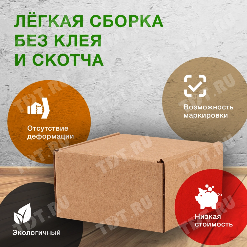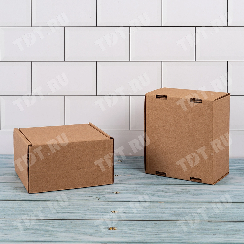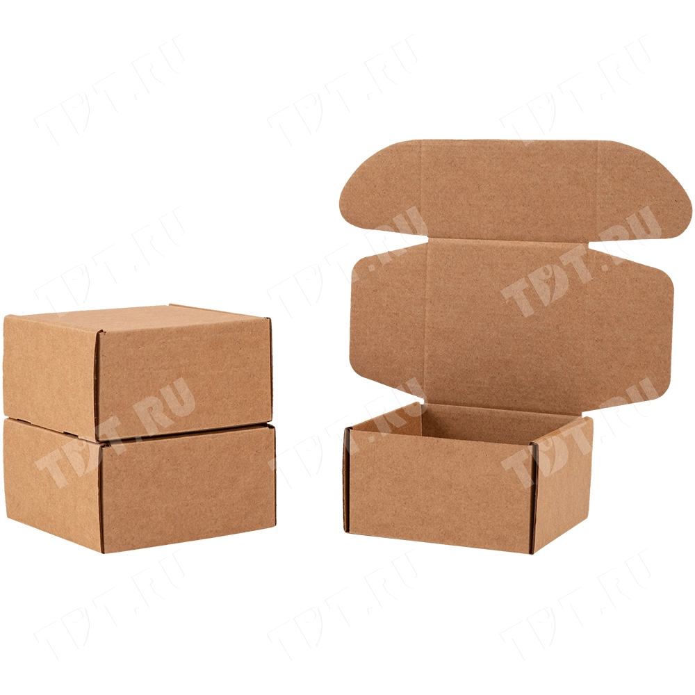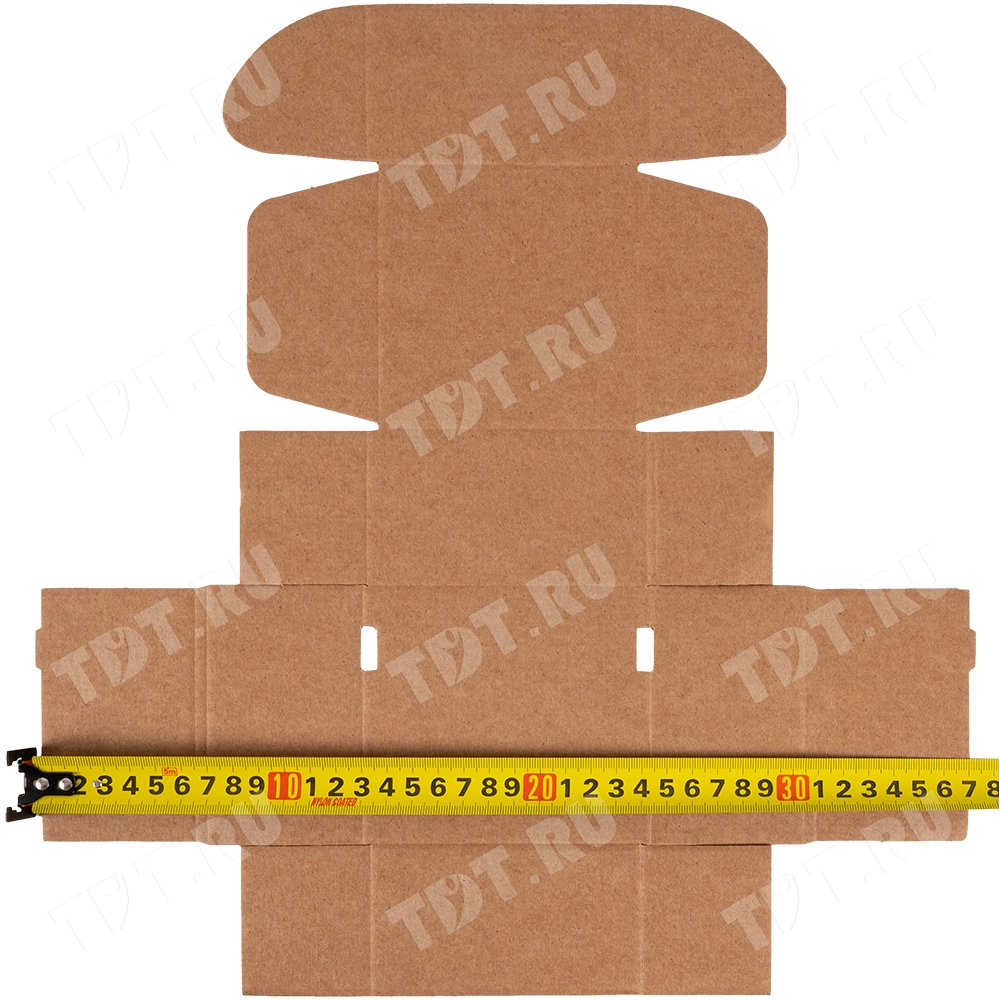 Самосборный короб №124 бурого цвета, длиной 100 мм, шириной 100 мм и высотой 60 мм. Изготовлен из гофрокартона Т-23 Е. Полезный объём — 0.6 л.