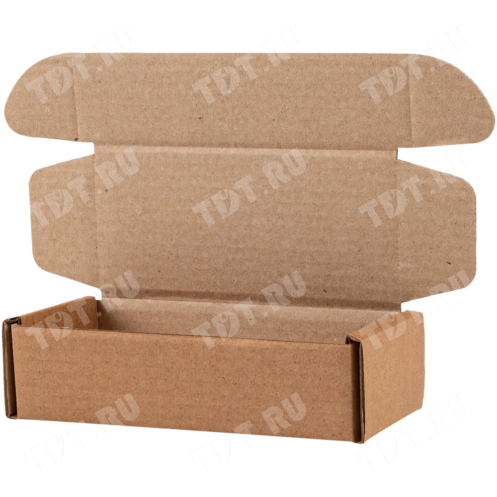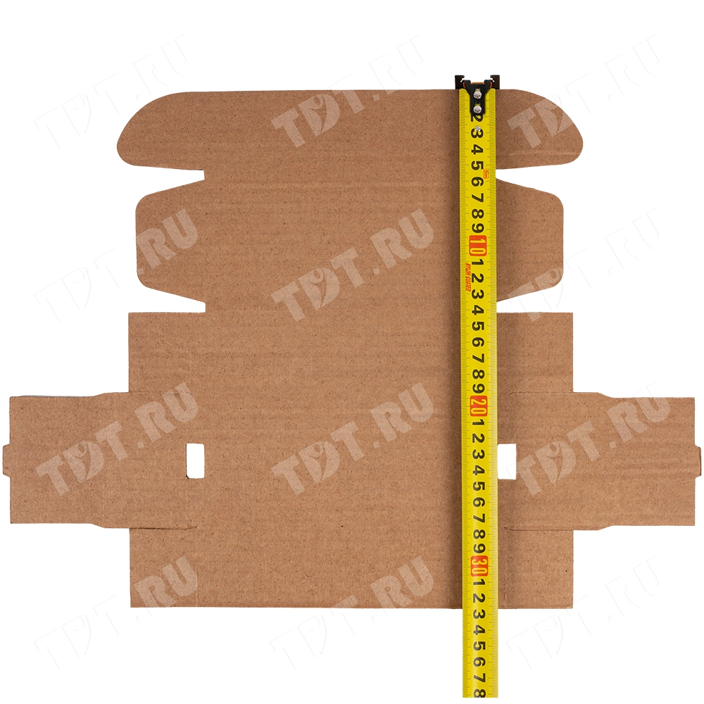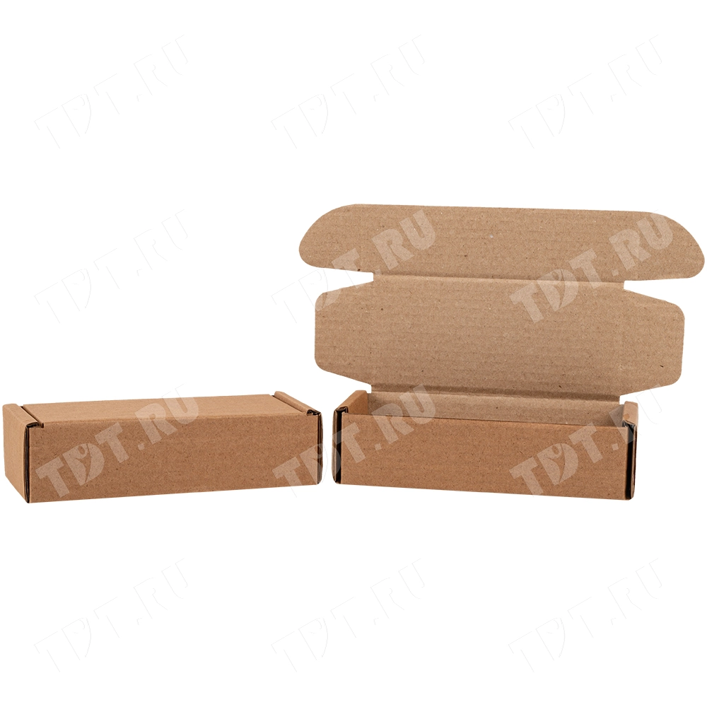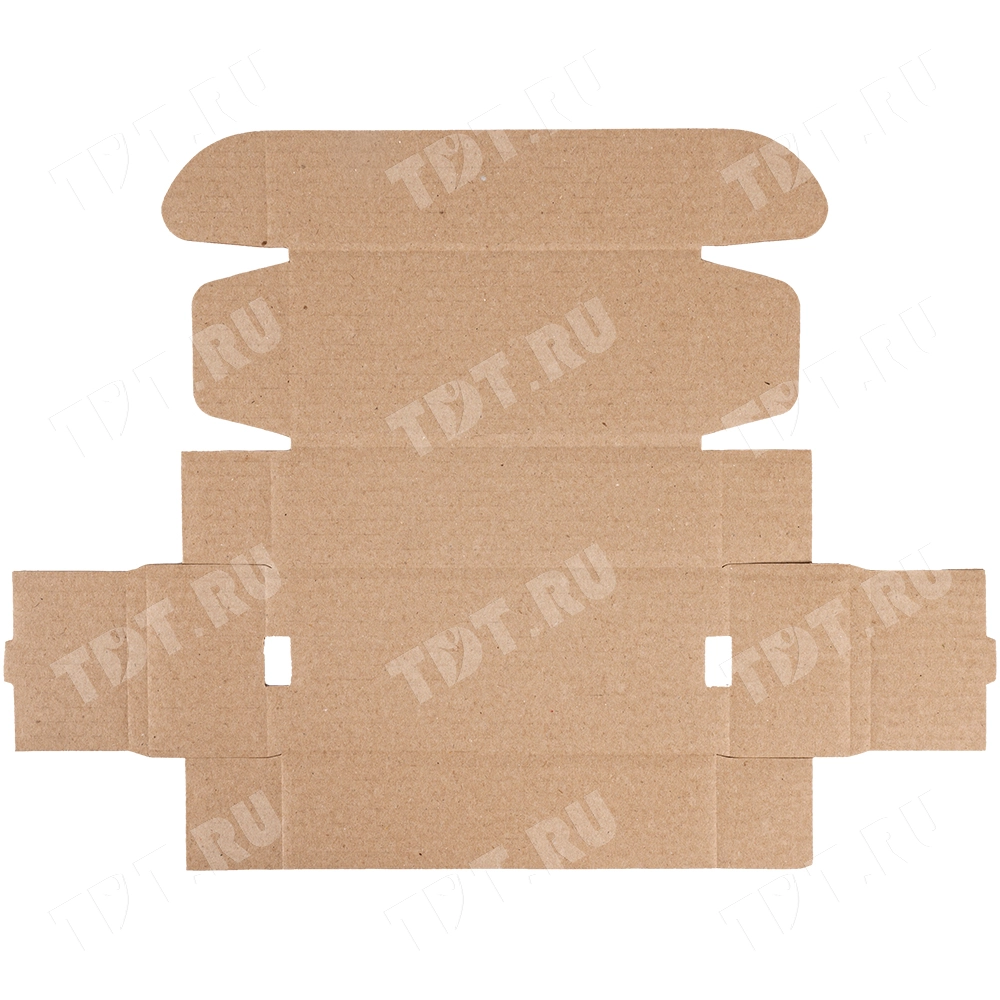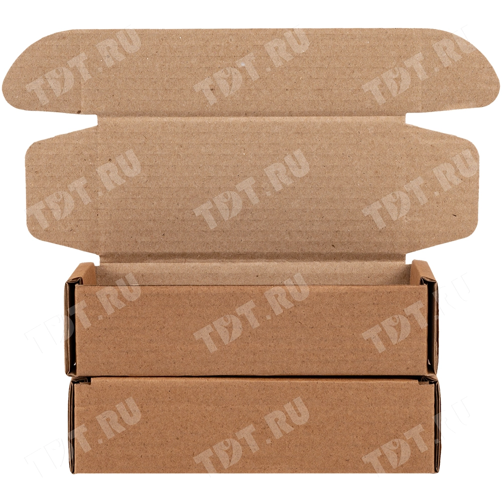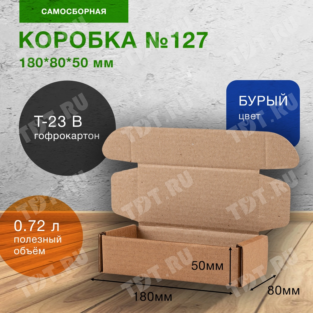 Самосборный короб №127 бурого цвета, длиной 180 мм, шириной 80 мм и высотой 50 мм. Изготовлен из гофрокартона Т-23 В. Полезный объём — 0.72 л.