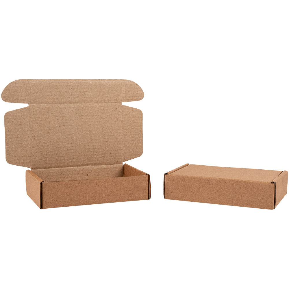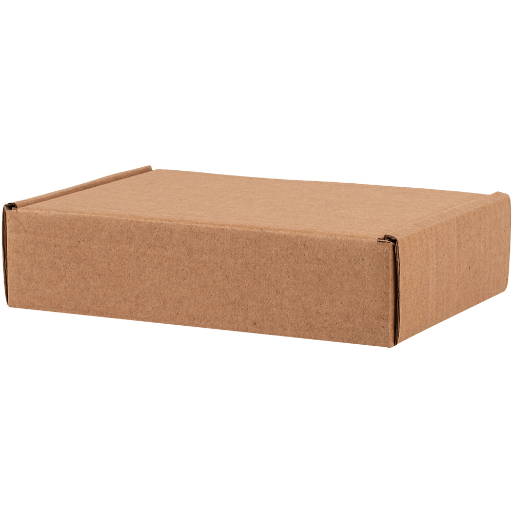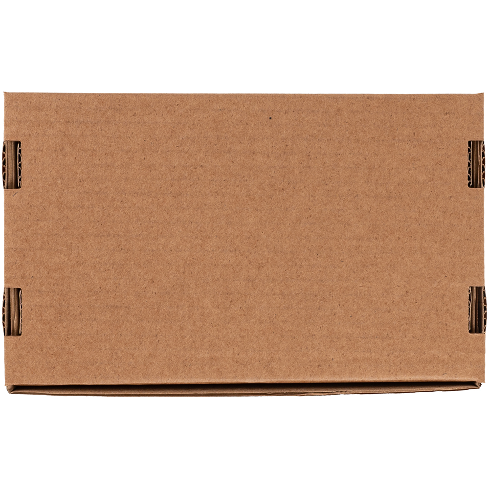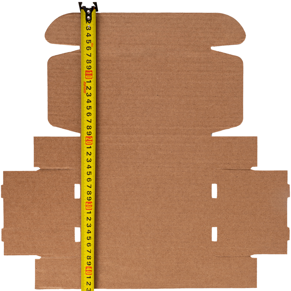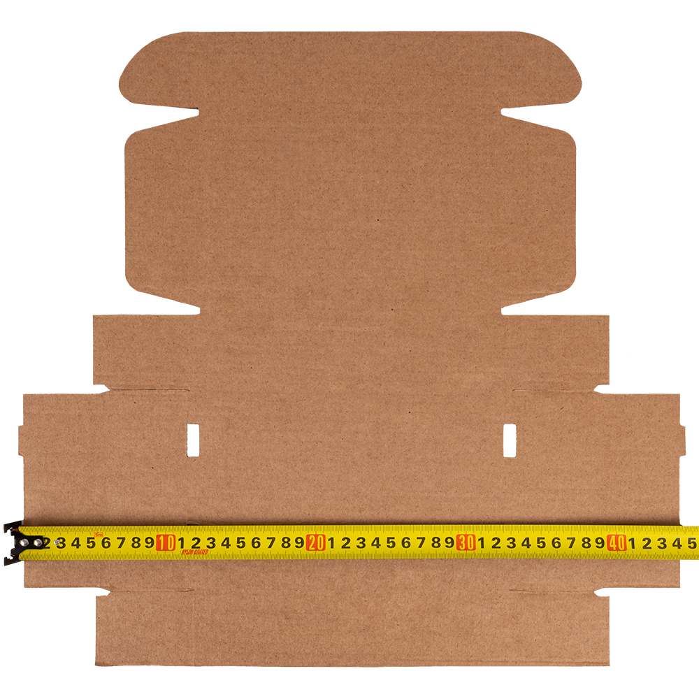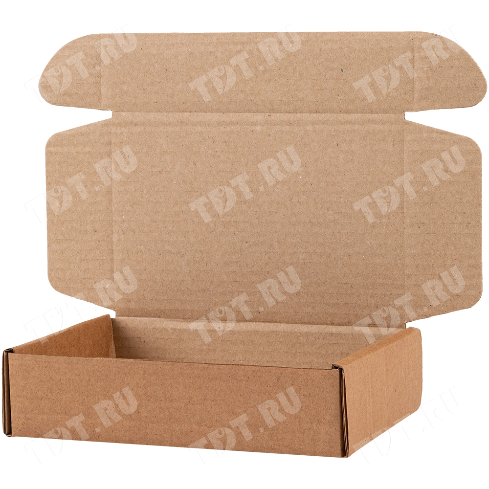 Самосборный короб №128 бурого цвета, длиной 200 мм, шириной 130 мм и высотой 50 мм. Изготовлен из гофрокартона Т-23 В. Полезный объём — 1.3 л.