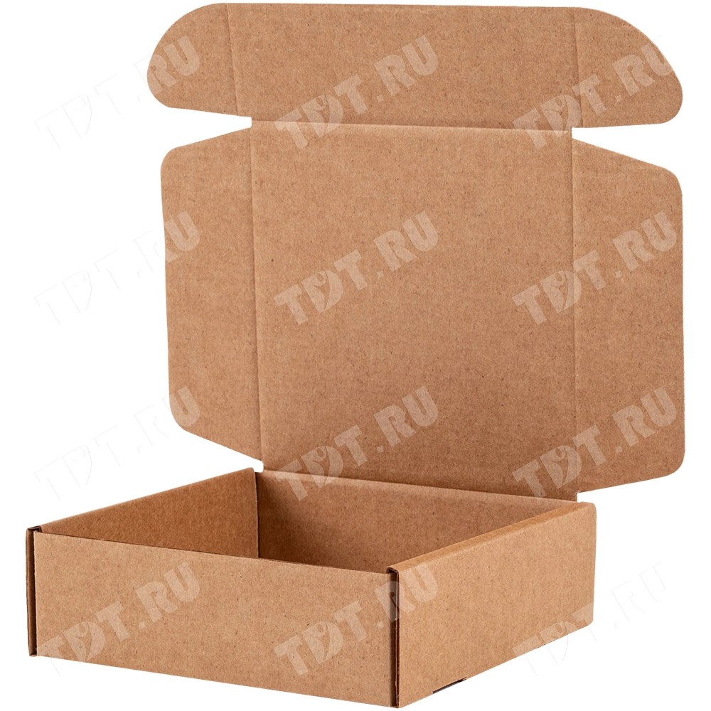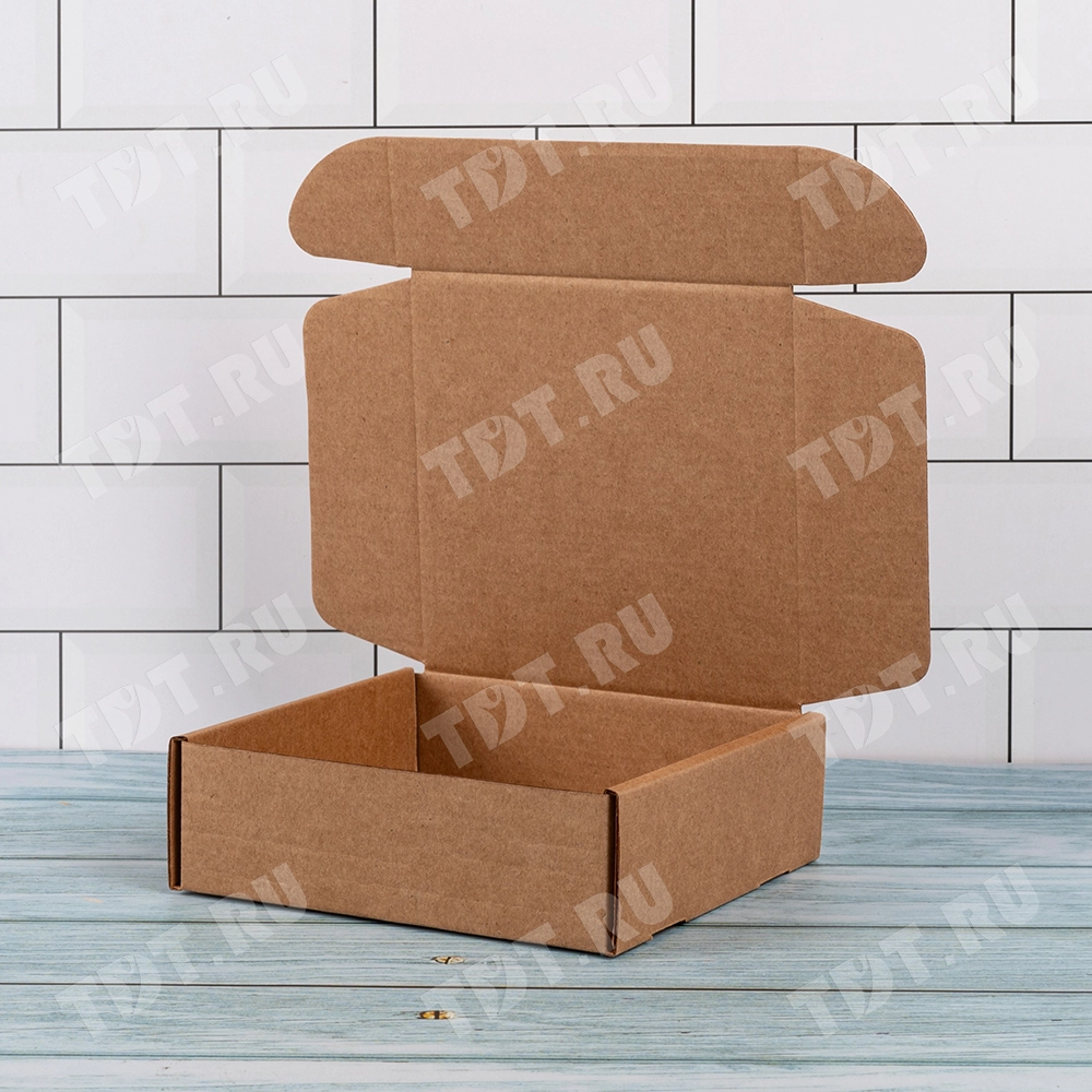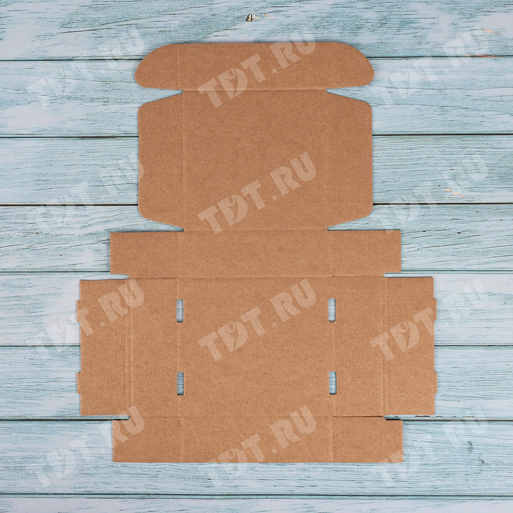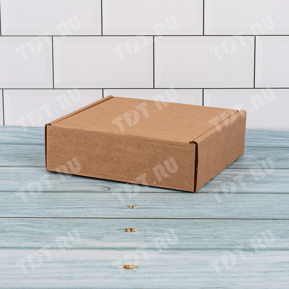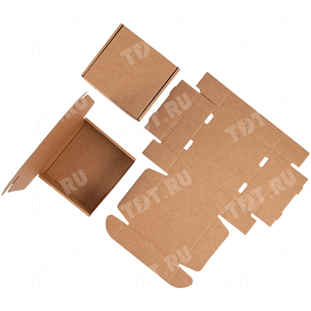 Самосборный короб №129 бурого цвета, длиной 125 мм, шириной 120 мм и высотой 40 мм. Изготовлен из гофрокартона Т-23 Е. Полезный объём — 0.6 л.