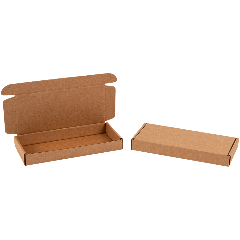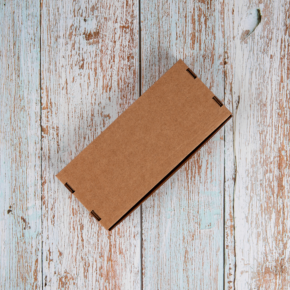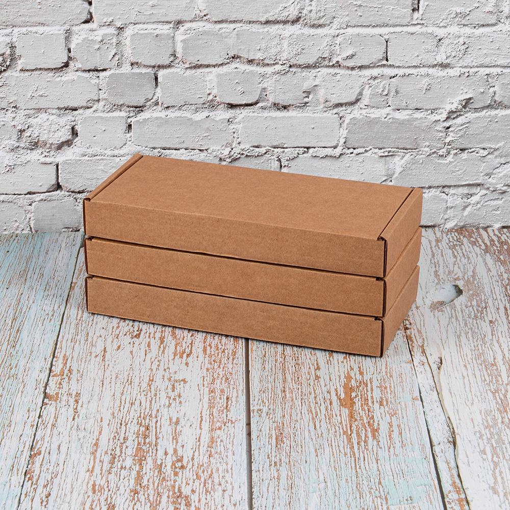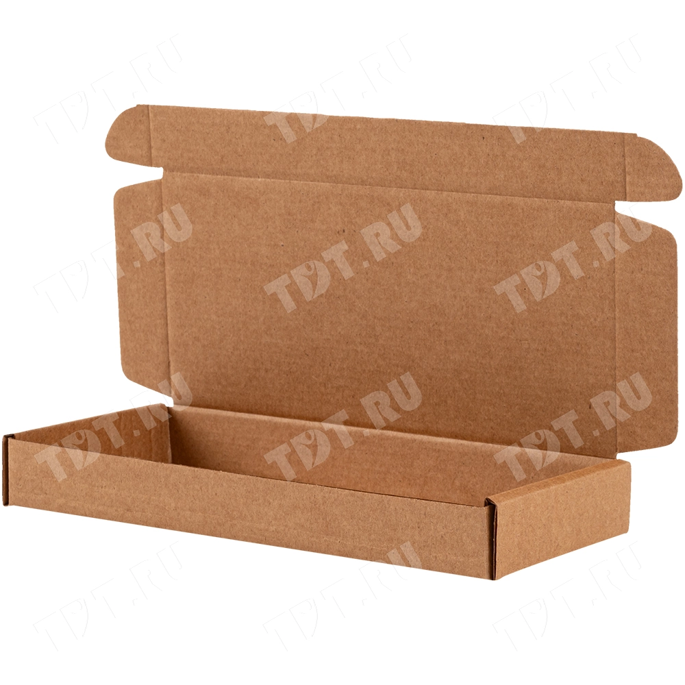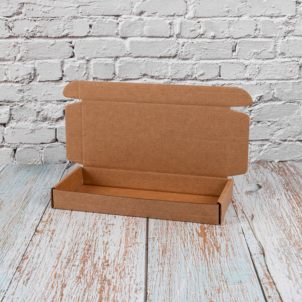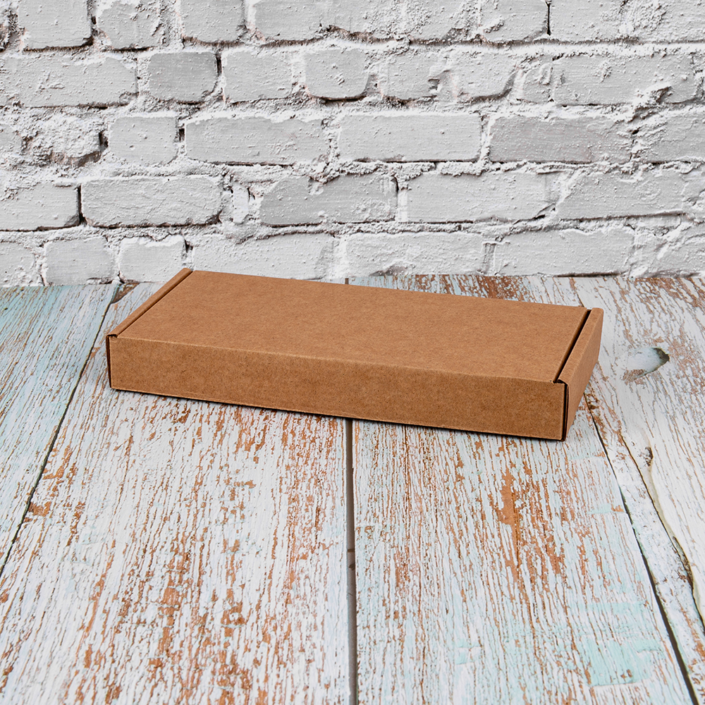 Самосборный короб №132 бурого цвета, длиной 200 мм, шириной 90 мм и высотой 25 мм. Изготовлен из гофрокартона Т-23 Е. Полезный объём — 0.45 л.