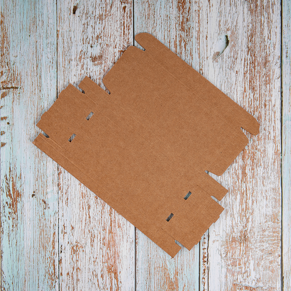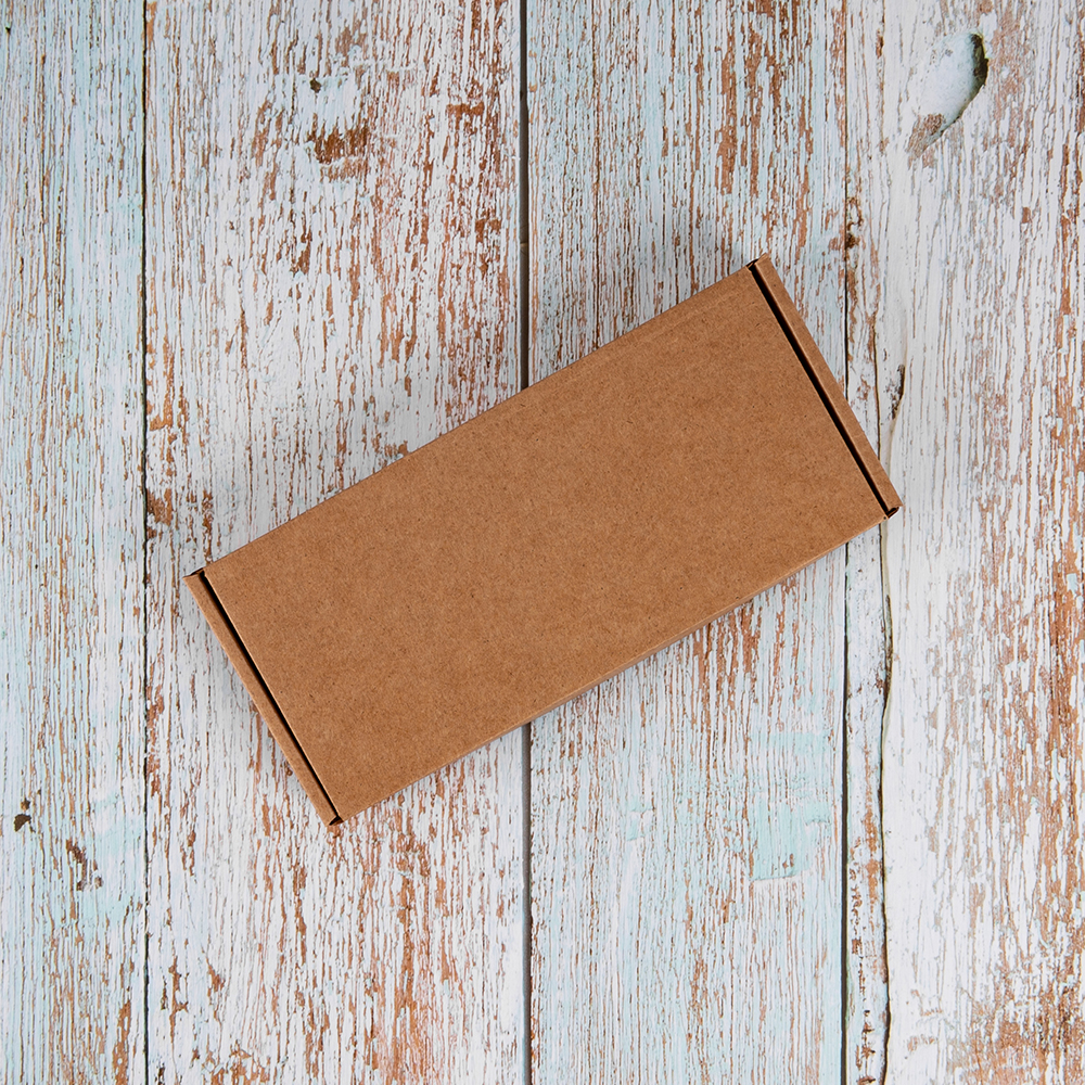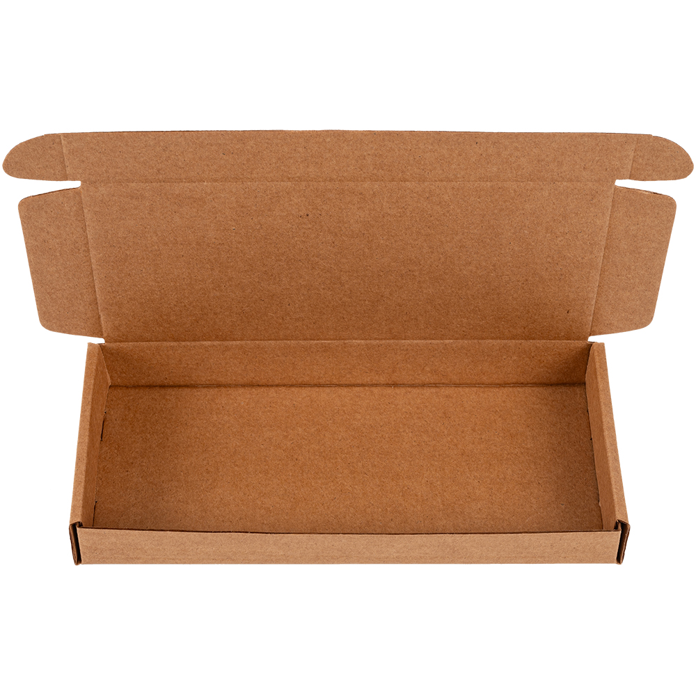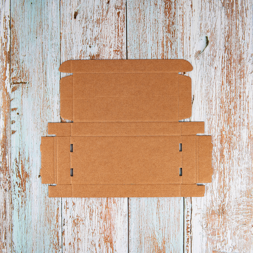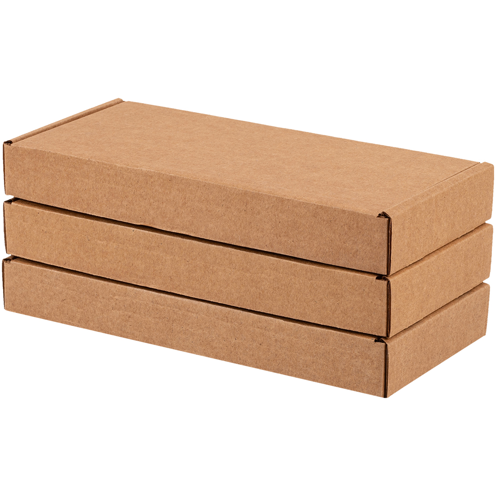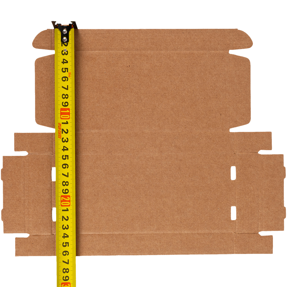Самосборный короб №132 бурого цвета, длиной 200 мм, шириной 90 мм и высотой 25 мм. Изготовлен из гофрокартона Т-23 Е. Полезный объём — 0.45 л.