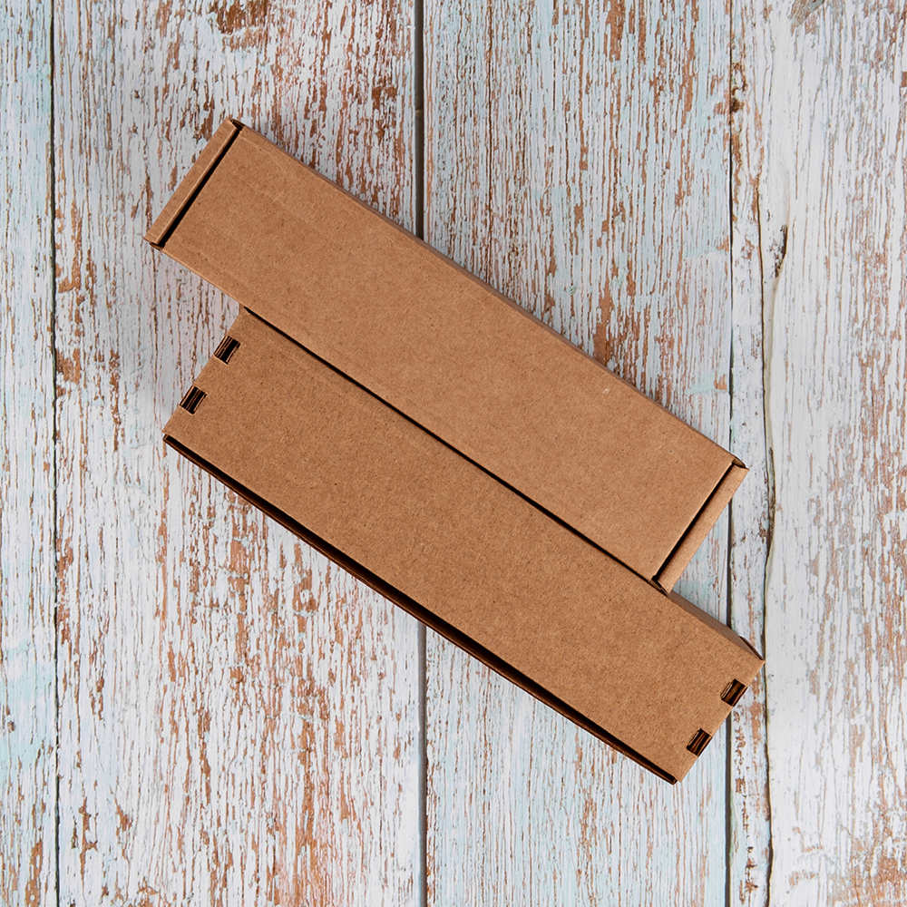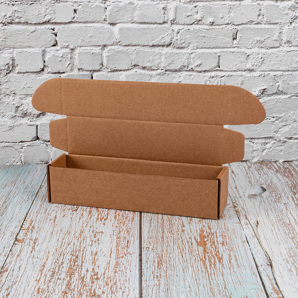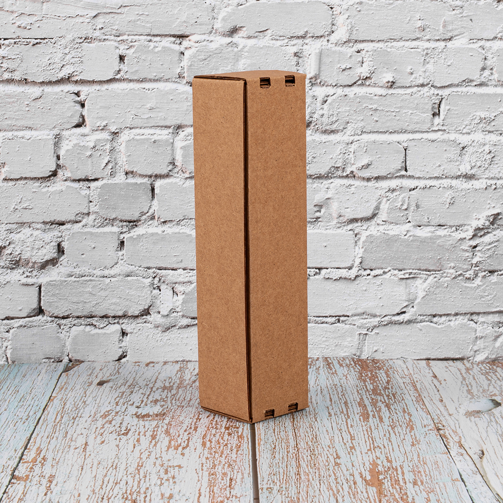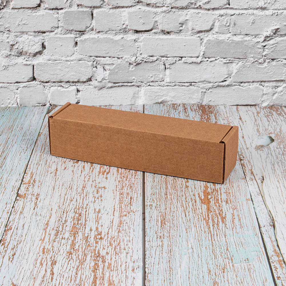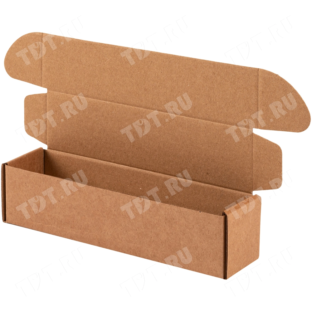 Самосборный короб №136 бурого цвета, длиной 190 мм, шириной 45 мм и высотой 45 мм. Изготовлен из гофрокартона Т-23 Е. Полезный объём — 0.38 л.