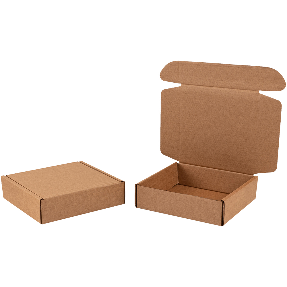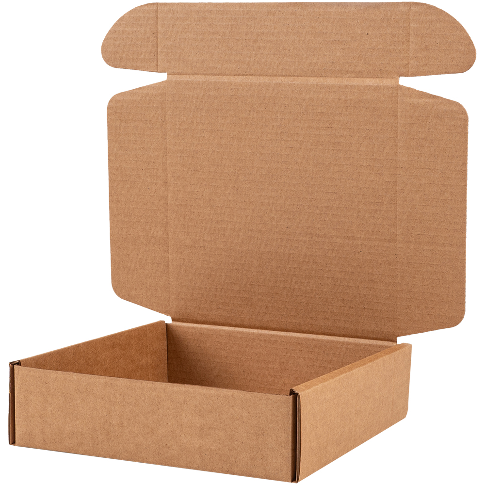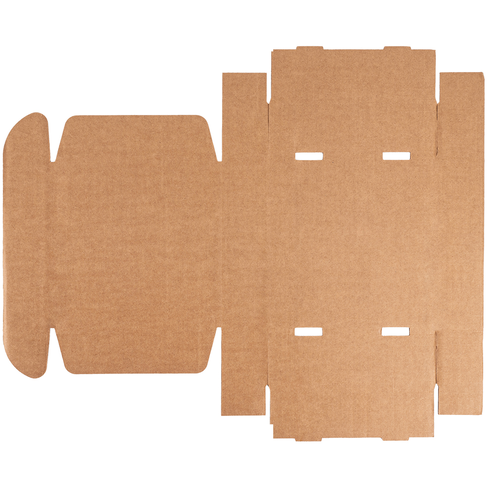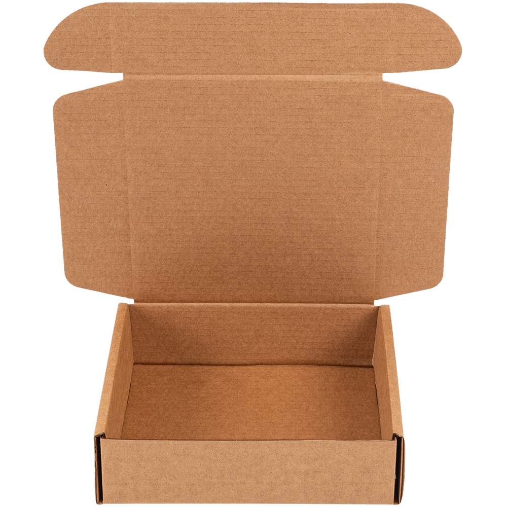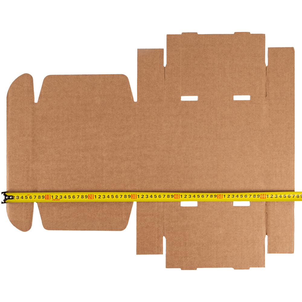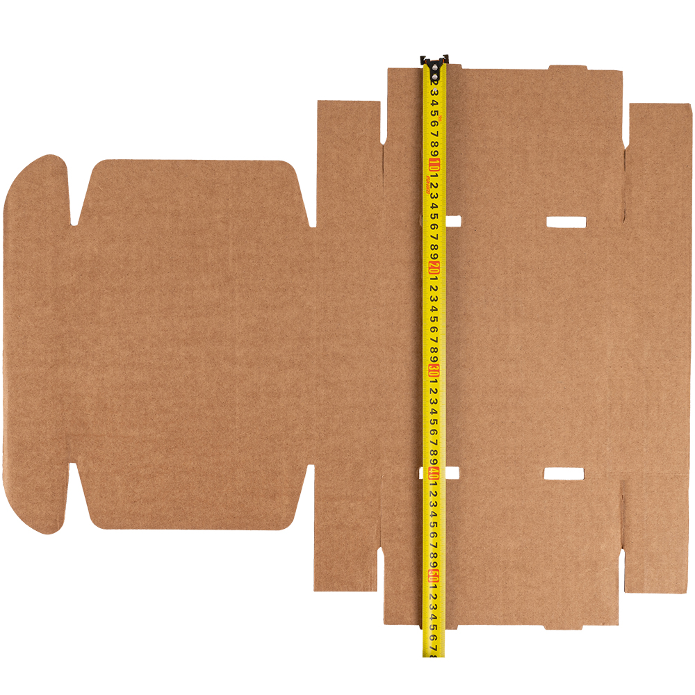 Самосборный короб №137 бурого цвета, длиной 230 мм, шириной 230 мм и высотой 65 мм. Изготовлен из гофрокартона Т-23 В. Полезный объём — 3.44 л.