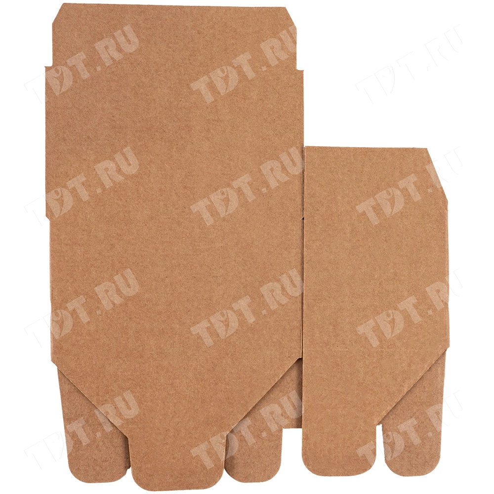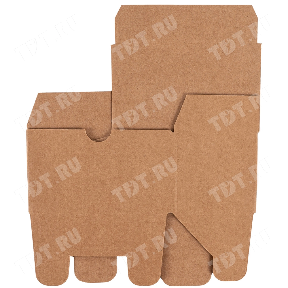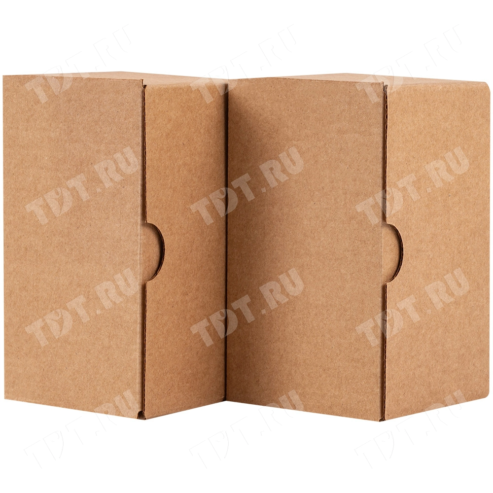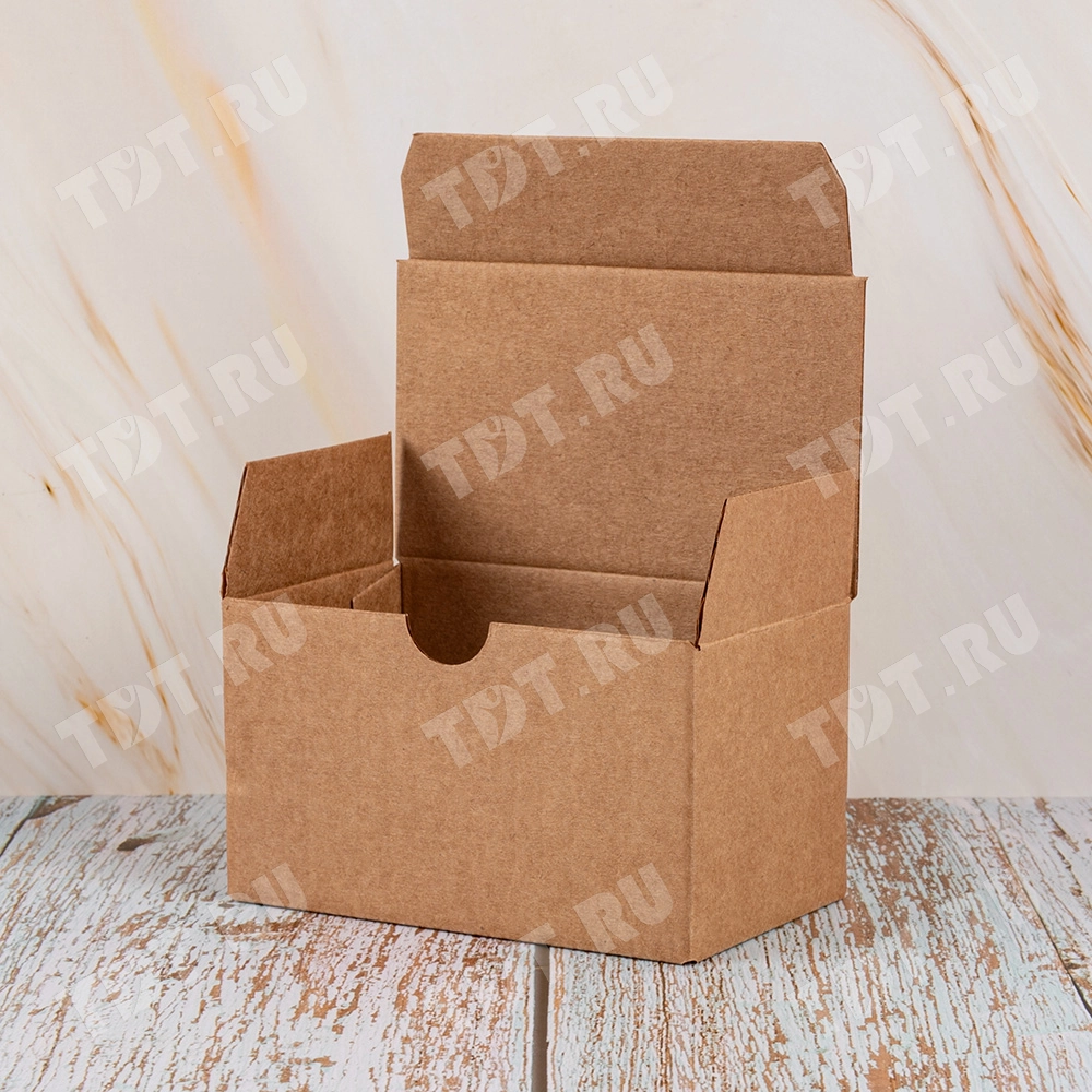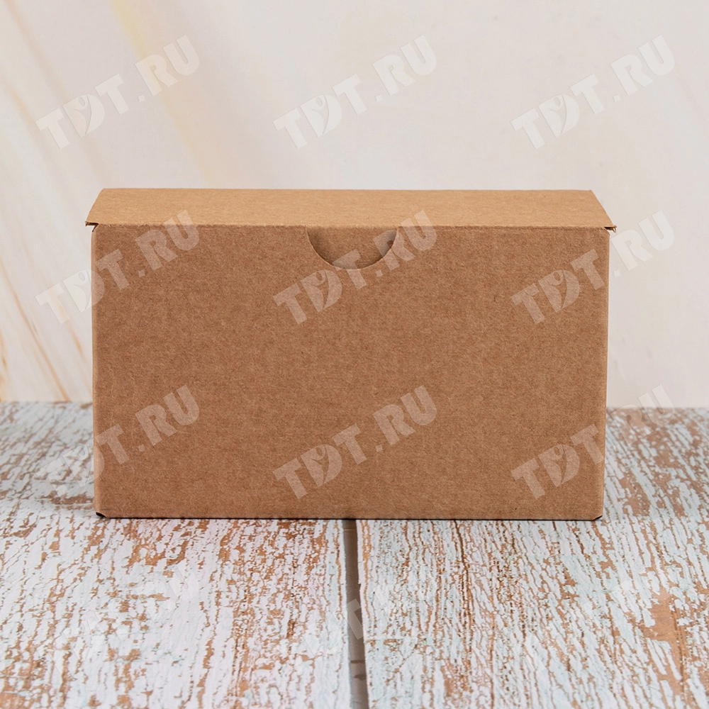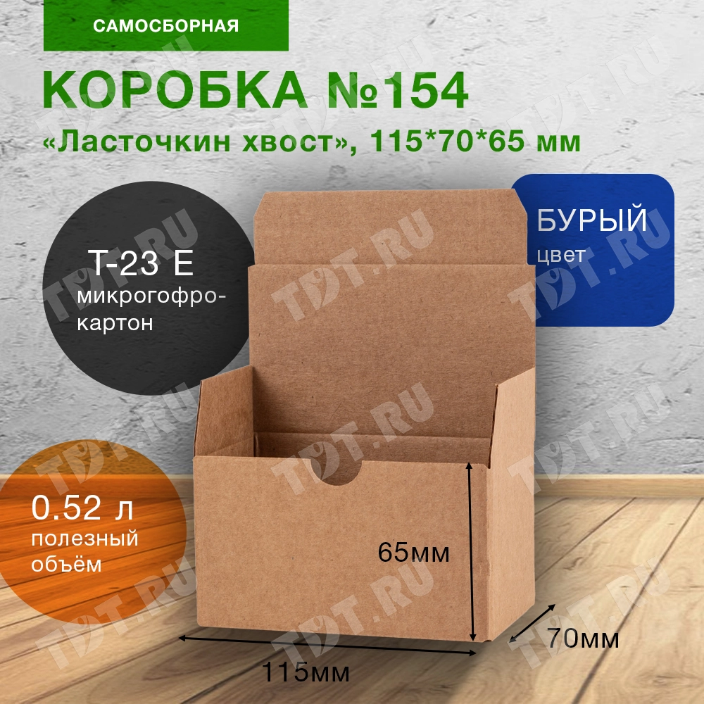 Самосборный короб №154 «Ласточкин хвост» бурого цвета, длиной 115 мм, шириной 70 мм и высотой 65 мм. Изготовлен из гофрокартона Т-23 Е. Полезный объём — 0.52 л.
