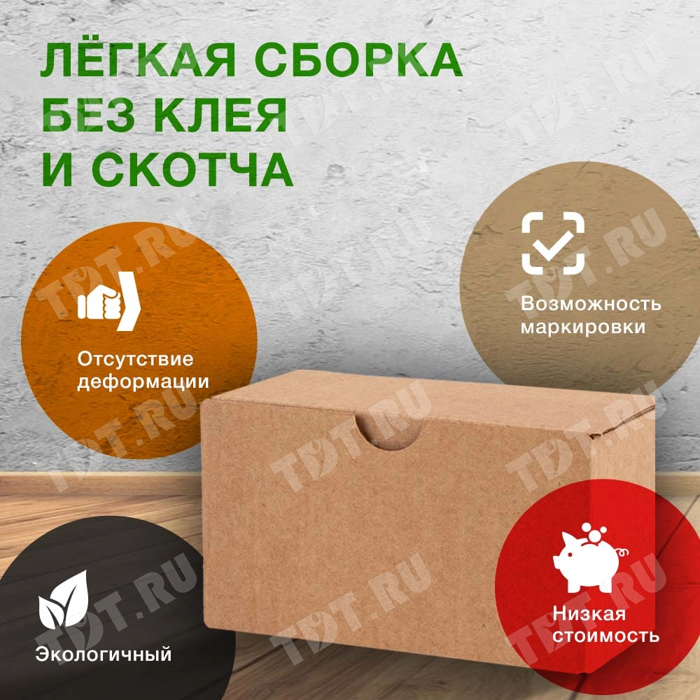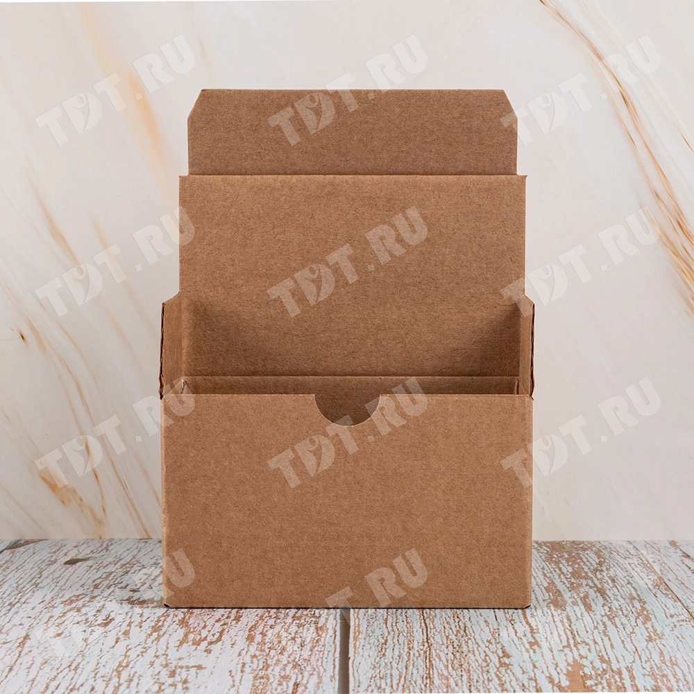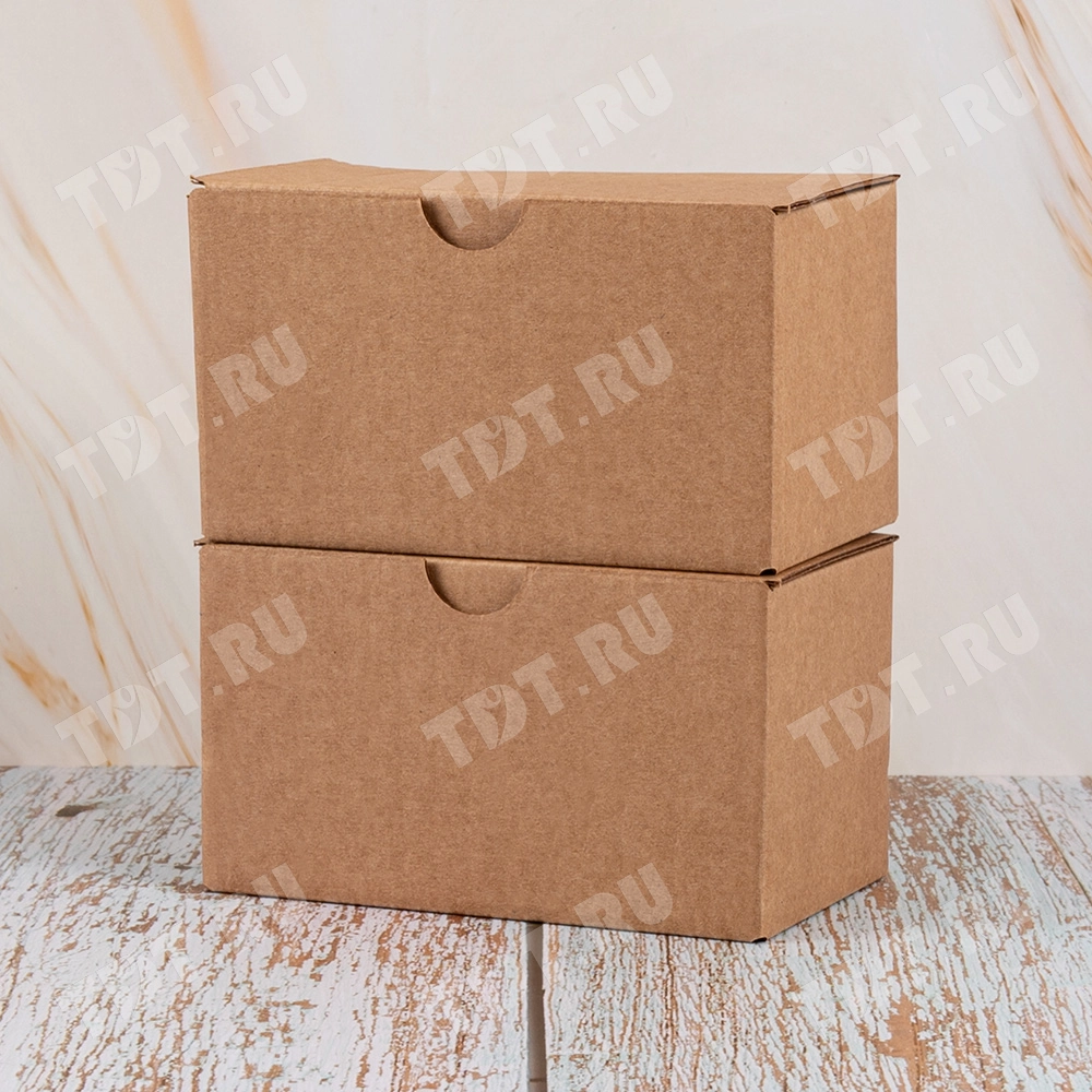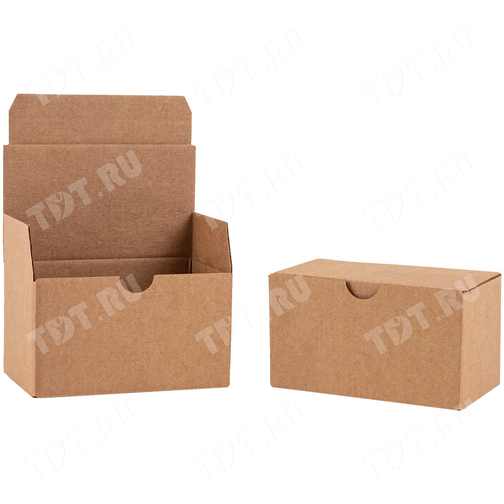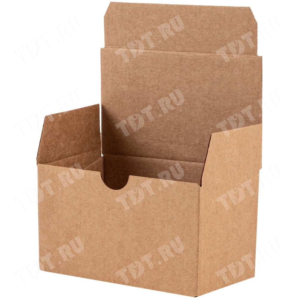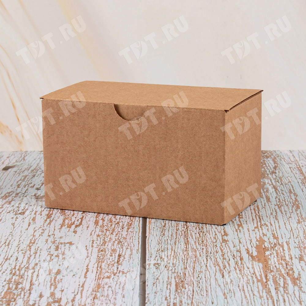 Самосборный короб №154 «Ласточкин хвост» бурого цвета, длиной 115 мм, шириной 70 мм и высотой 65 мм. Изготовлен из гофрокартона Т-23 Е. Полезный объём — 0.52 л.