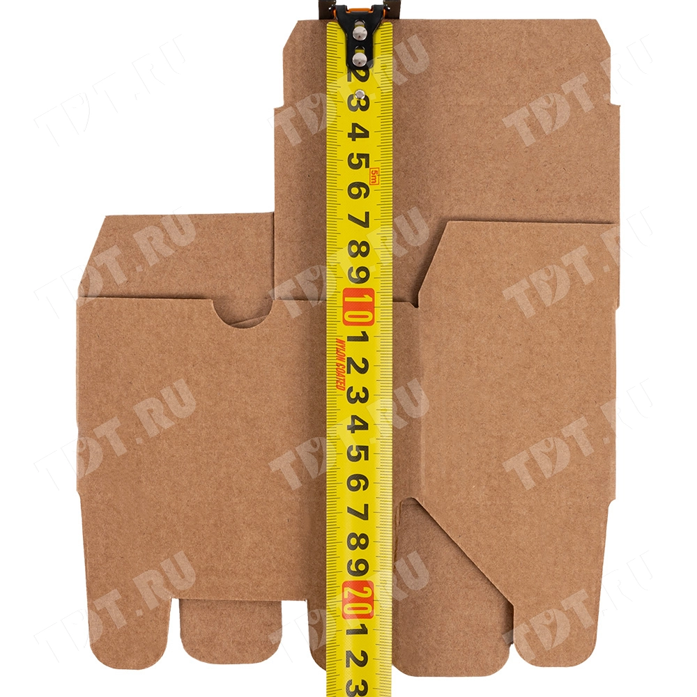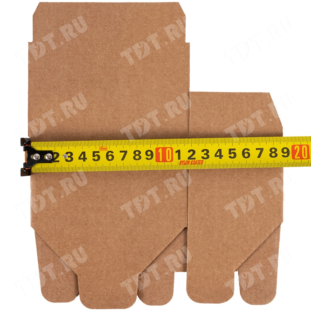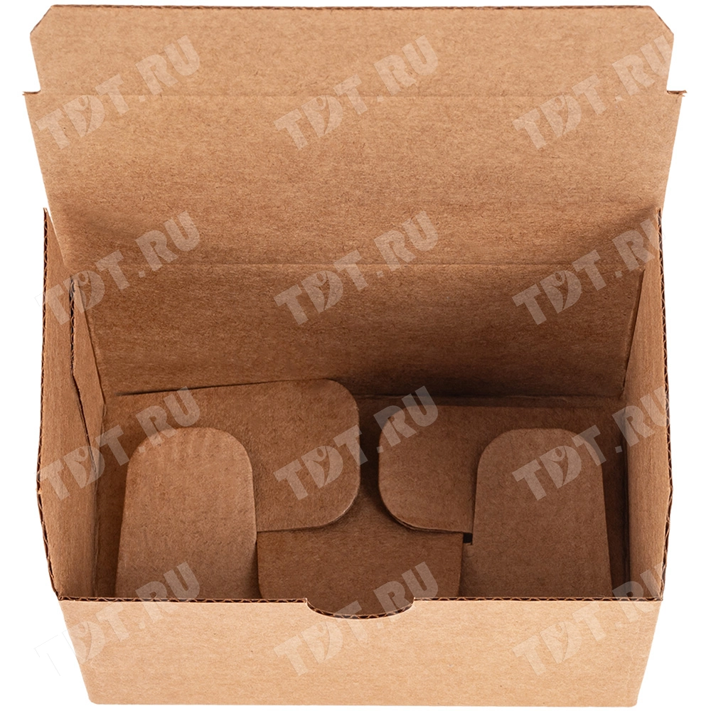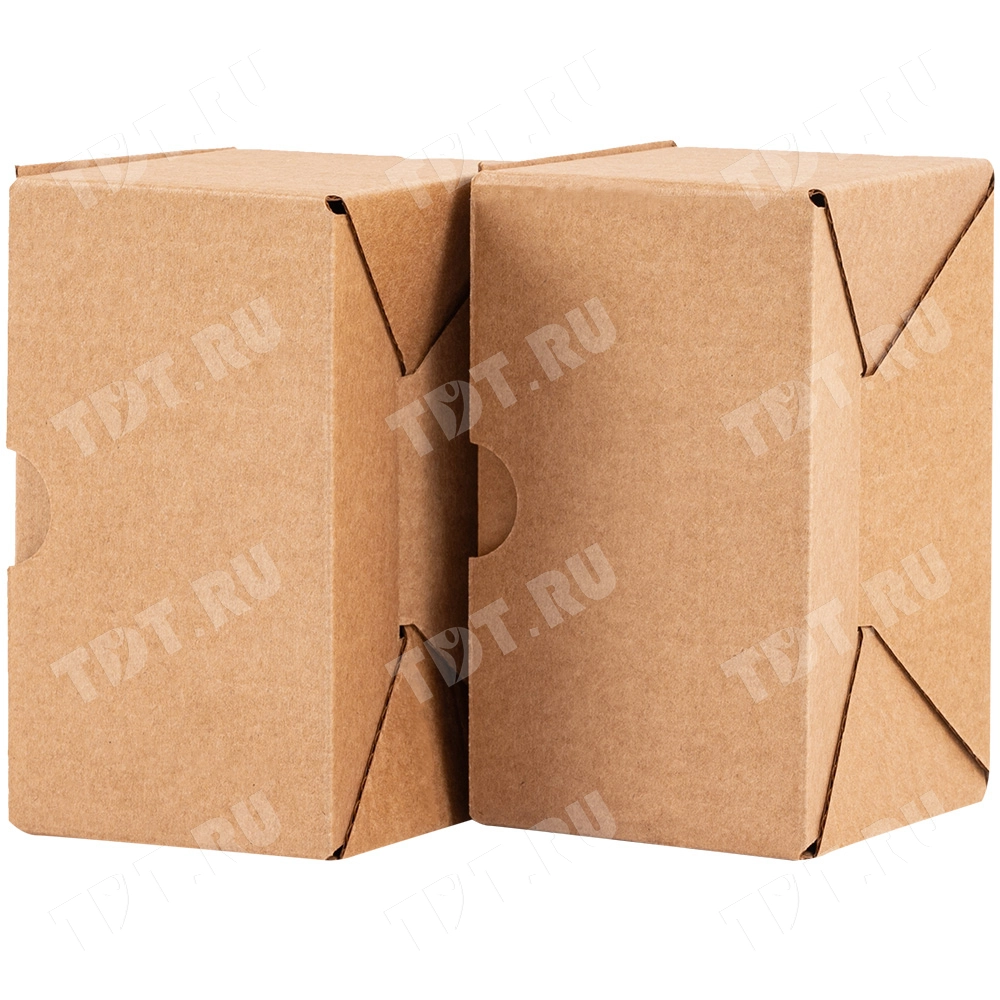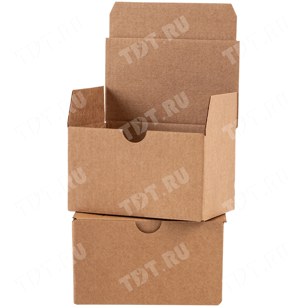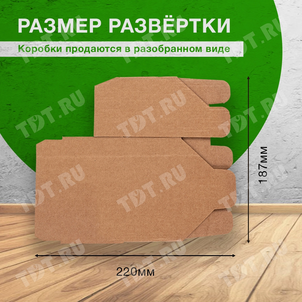Самосборный короб №154 «Ласточкин хвост» бурого цвета, длиной 115 мм, шириной 70 мм и высотой 65 мм. Изготовлен из гофрокартона Т-23 Е. Полезный объём — 0.52 л.