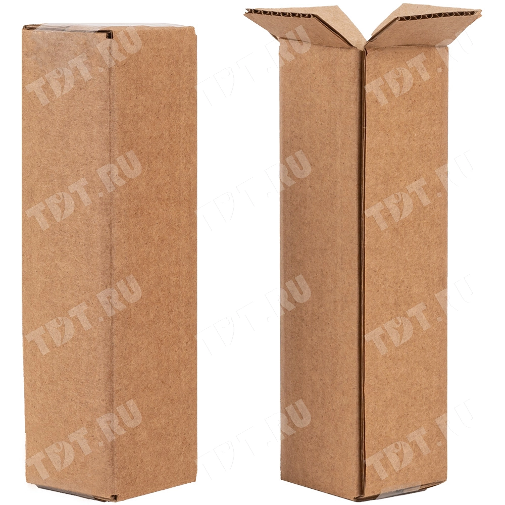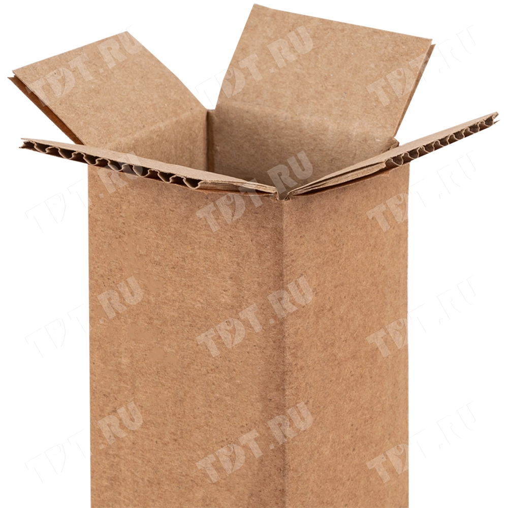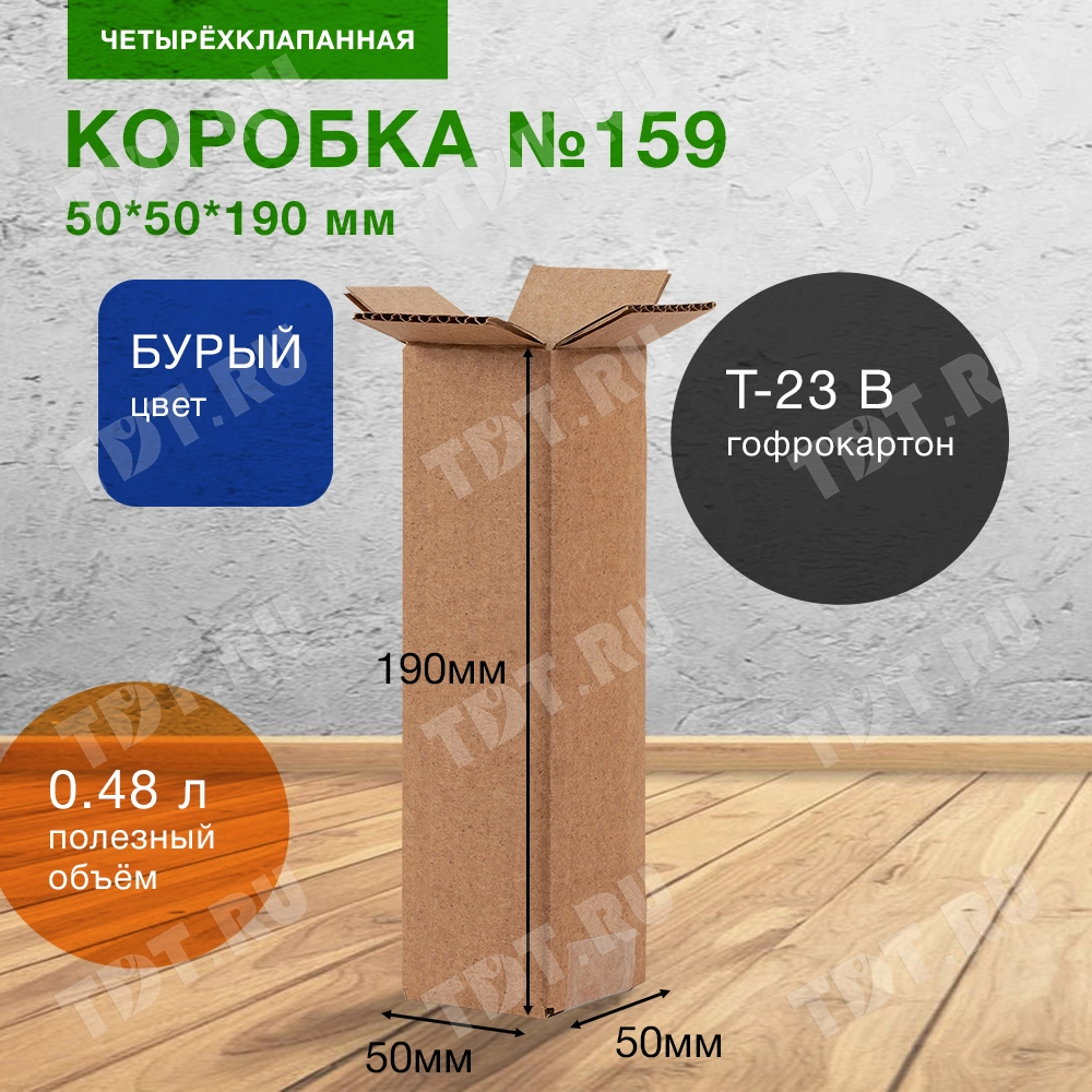 Короб №159 бурого цвета, длиной 50 мм, шириной 50 мм и высотой 190 мм. Изготовлен из трехслойного картона марки Т-23 В. Полезный объём — 0.48 л.