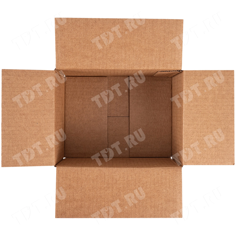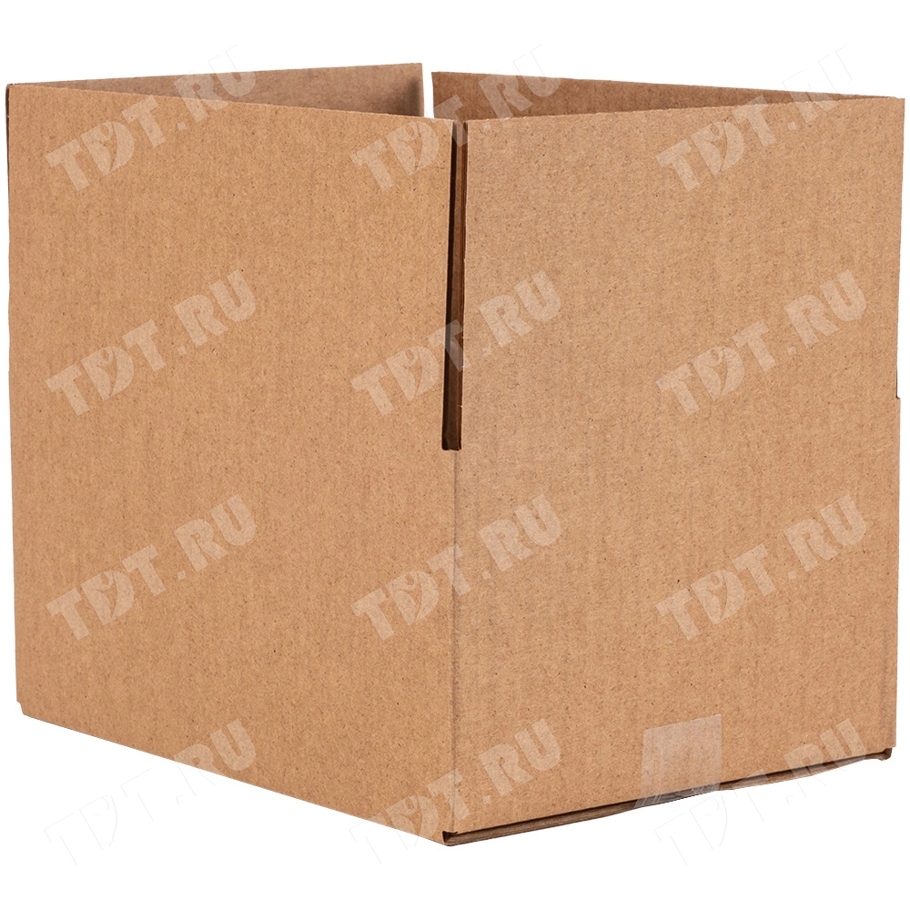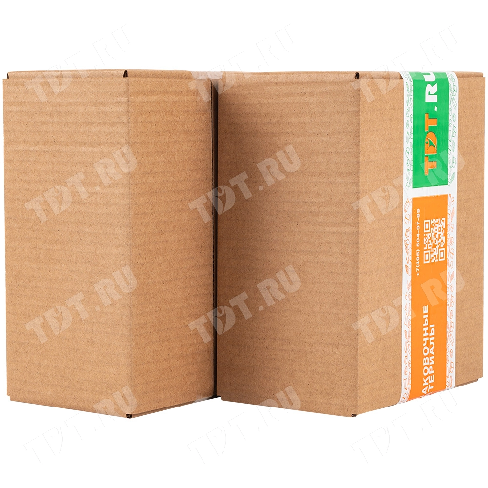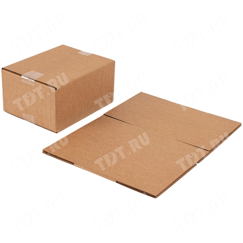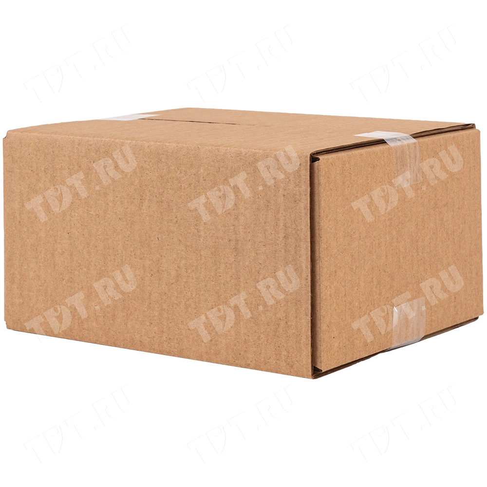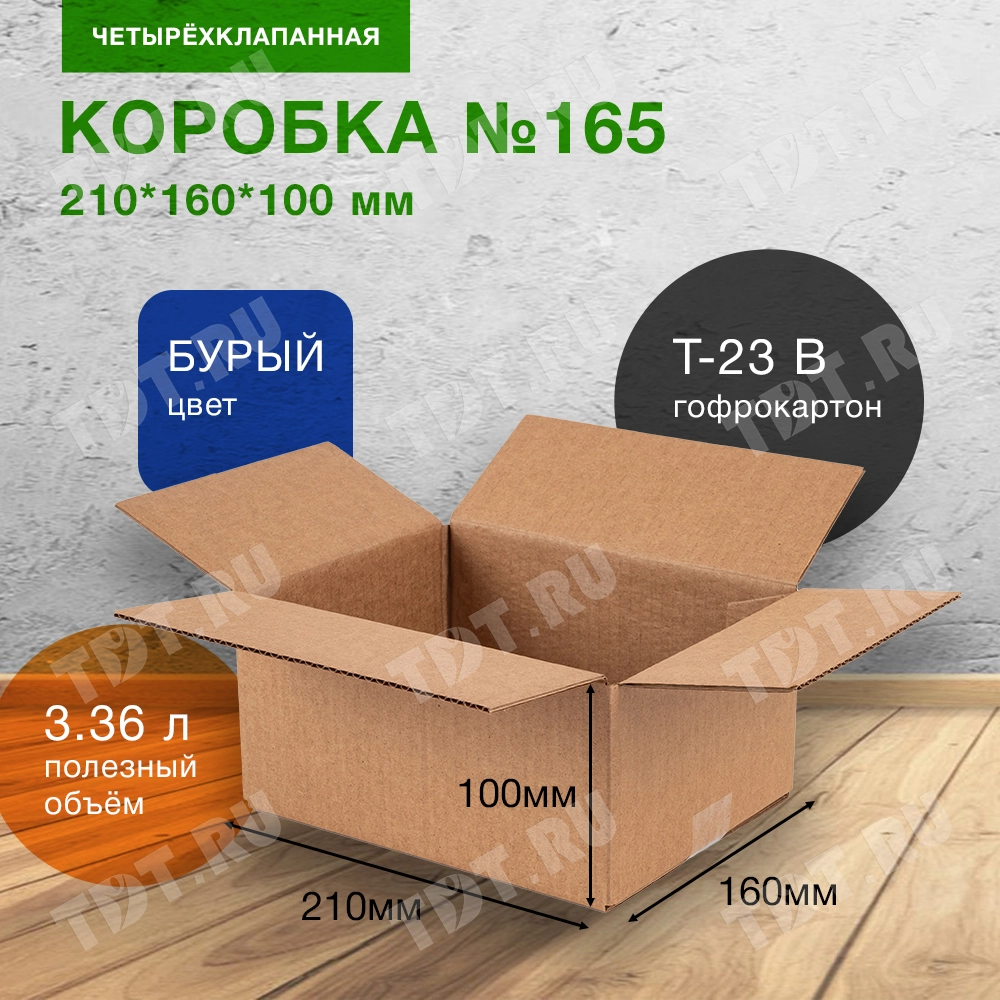 Четырехклапанный короб №165 бурого цвета, длиной 210 мм, шириной 160 мм и высотой 100 мм. Изготовлен из трехслойного картона марки Т-23 В. Полезный объём — 3.36 л.