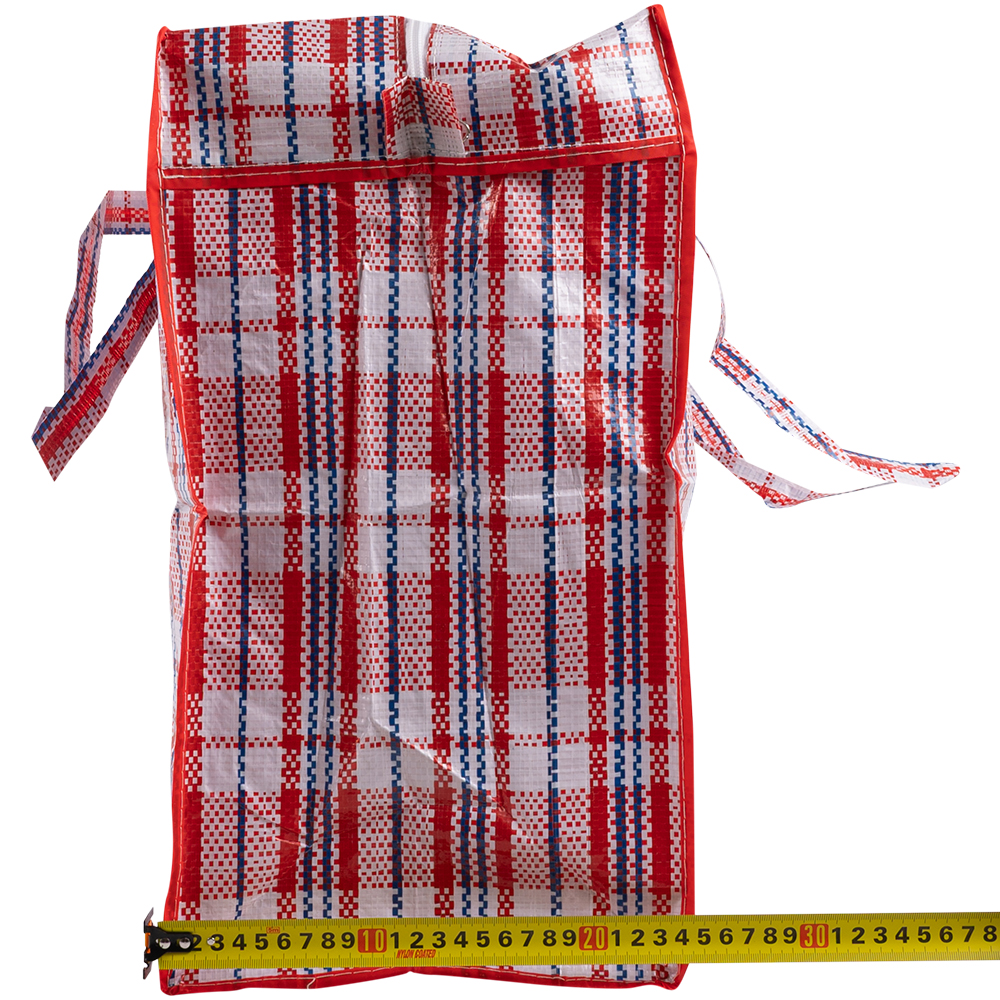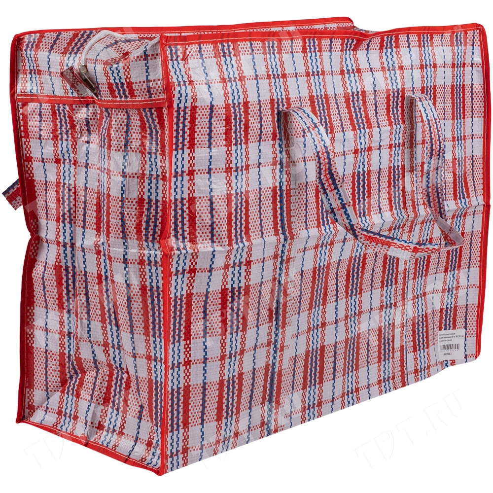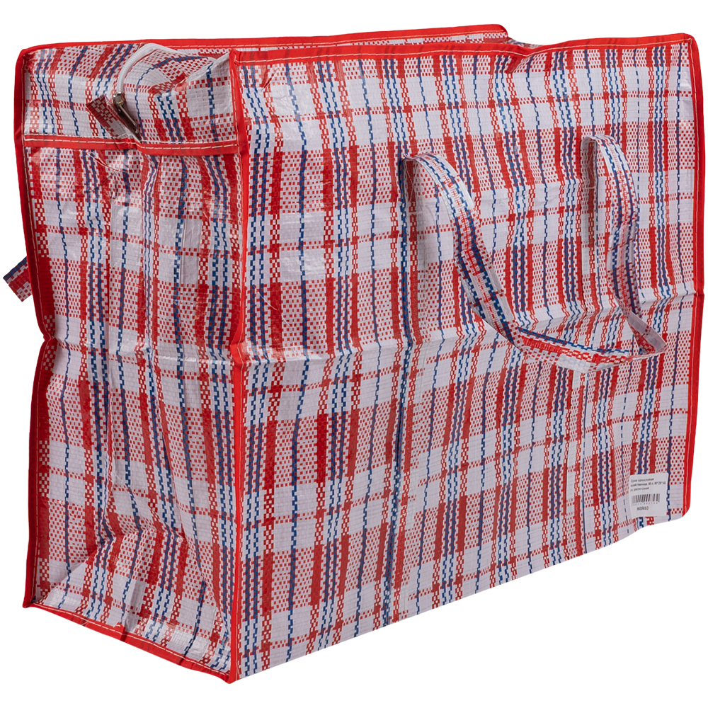 Сумка-баул однослойная хозяйственная длиной 60 см, шириной 25 см, высотой 45 см, объемом 68 л, красно-синяя. Материал полипропилен. Имеет прострочку по периметру. Занимает мало места в сложенном виде. Производится в Китае.