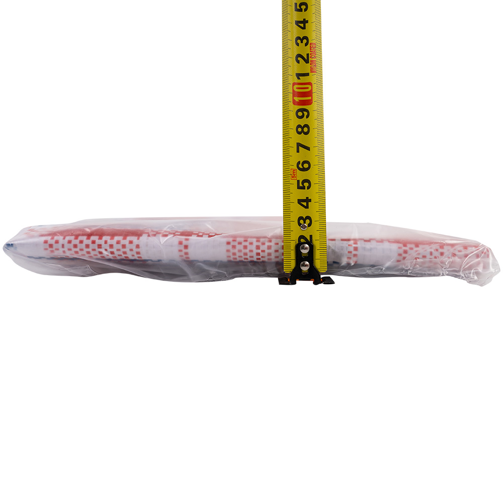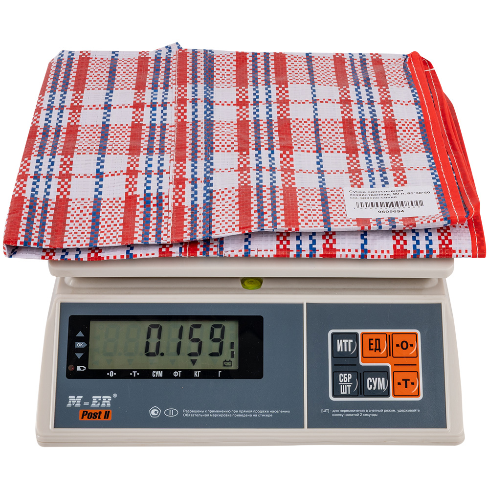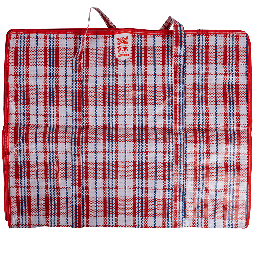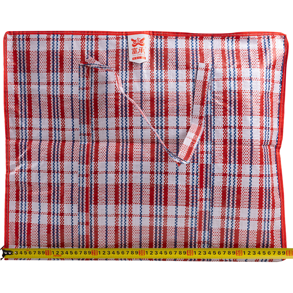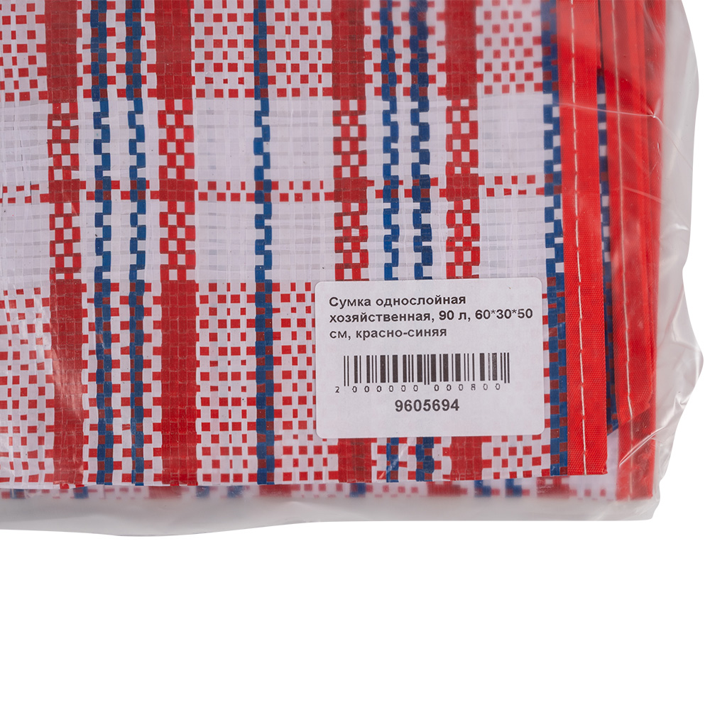 Большая сумка однослойная хозяйственная длиной 60 см, шириной 30 см, высотой 50 см, объемом 90 л, красно-синяя. Материал полипропилен. Имеет прострочку по периметру. Занимает мало места в сложенном виде. Производится в Китае.