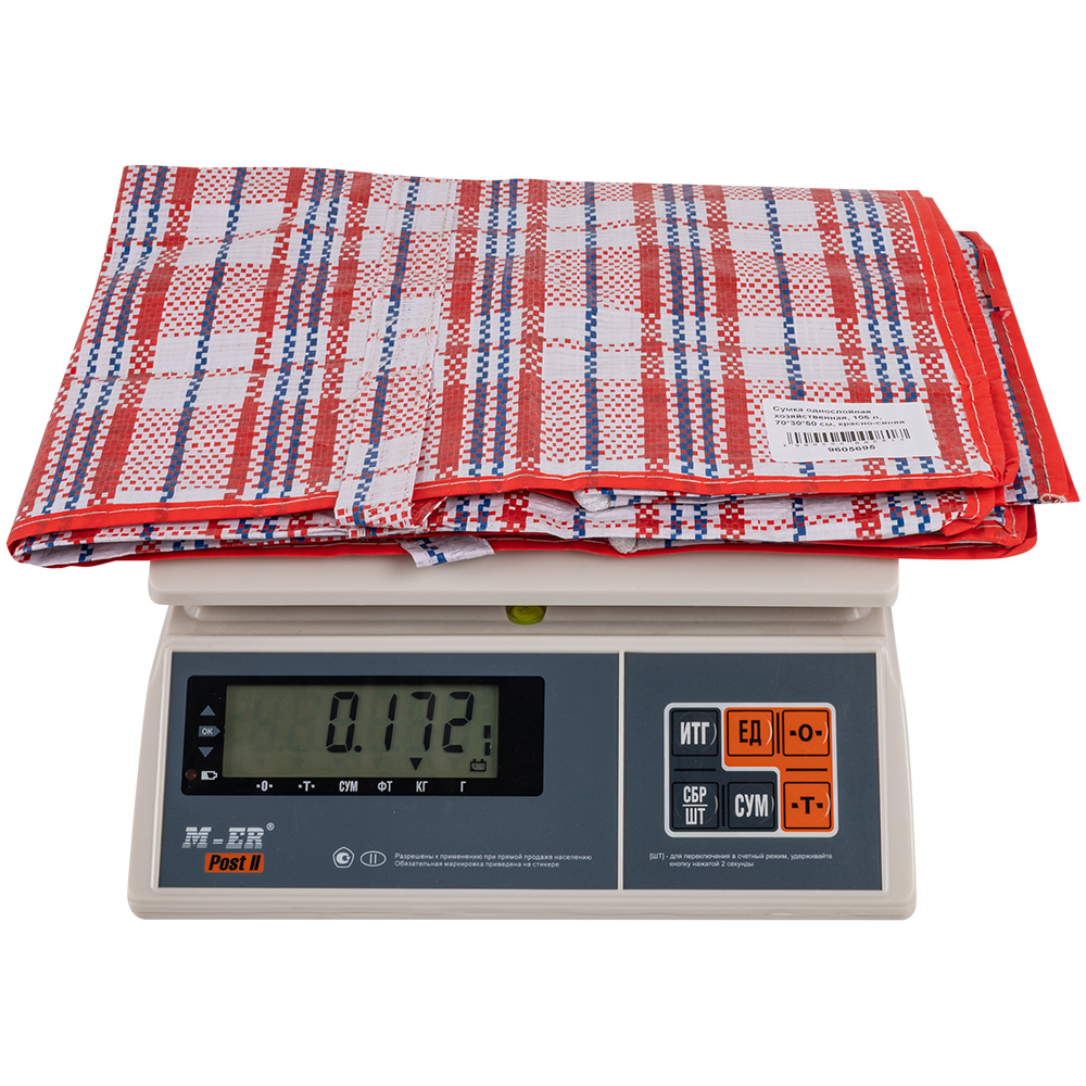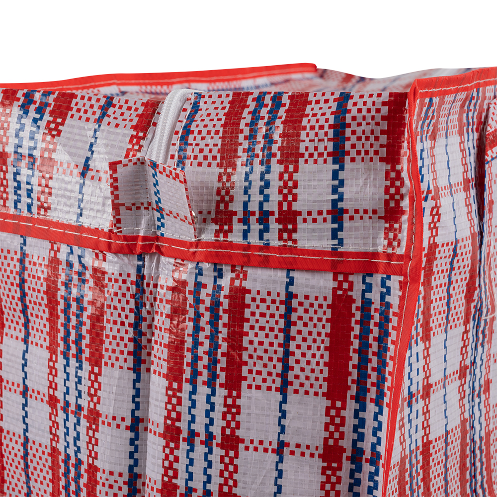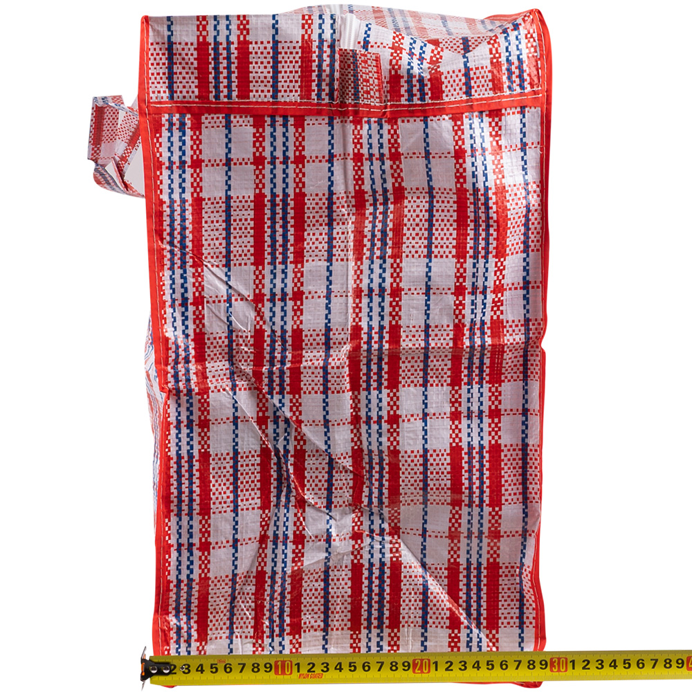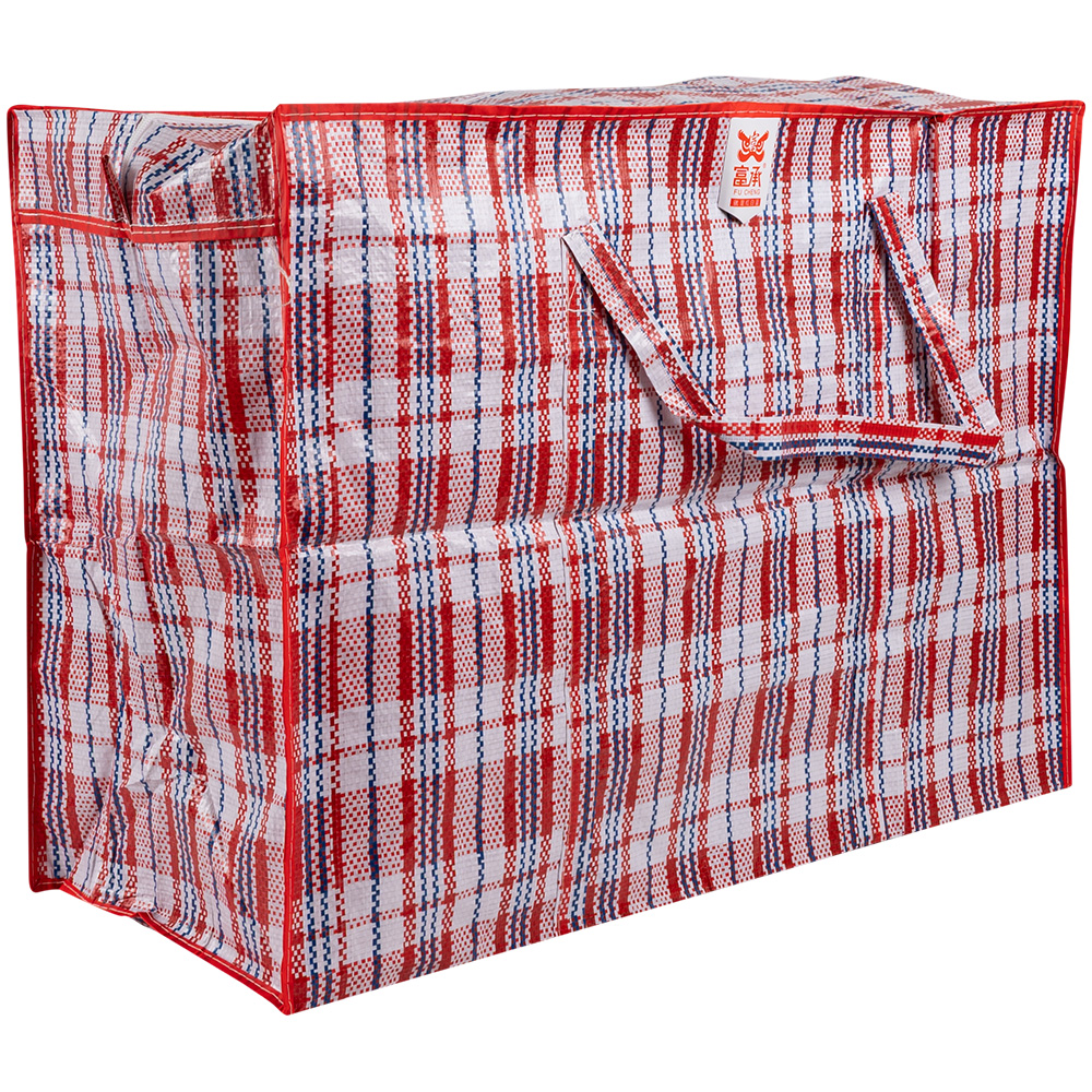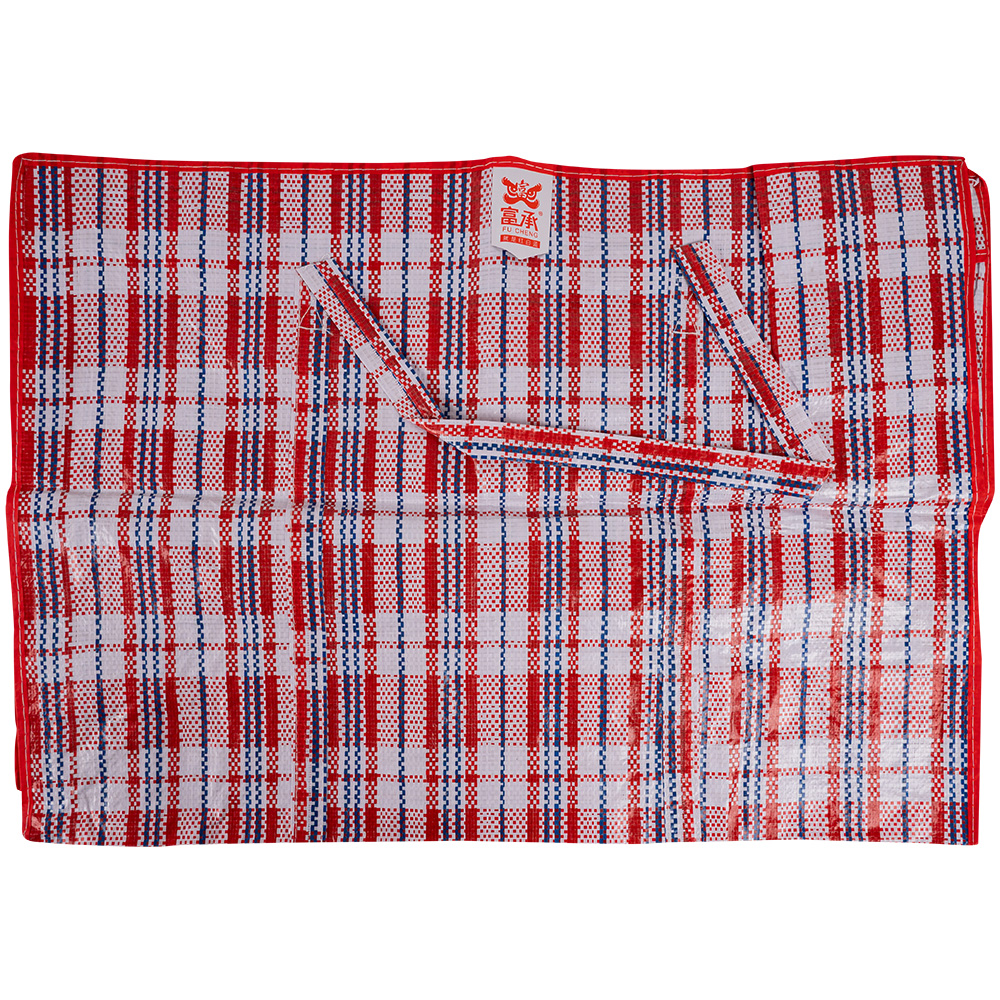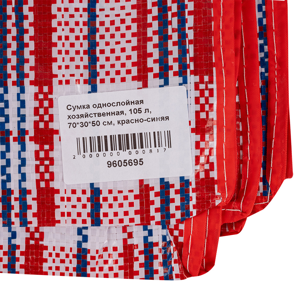 Большая сумка однослойная хозяйственная длиной 70 см, шириной 30 см, высотой 50 см, объемом 105 л, красно-синяя. Материал полипропилен. Имеет прострочку по периметру. Занимает мало места в сложенном виде. Производится в Китае.
