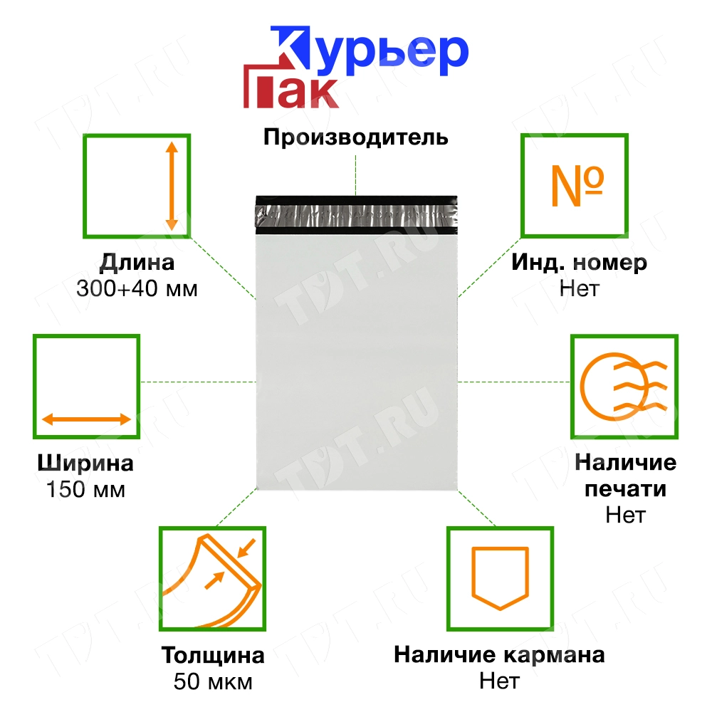 Курьер-пакет белый без печати, без кармана, 150*300+40 мм, 50 мкм, 100 шт.