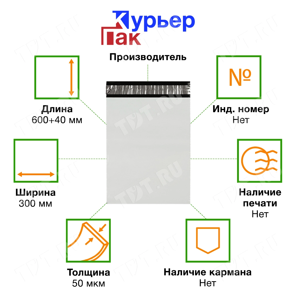Курьер-пакет белый без печати, без кармана, 300*600+40 мм, 50 мкм, 1 шт.
