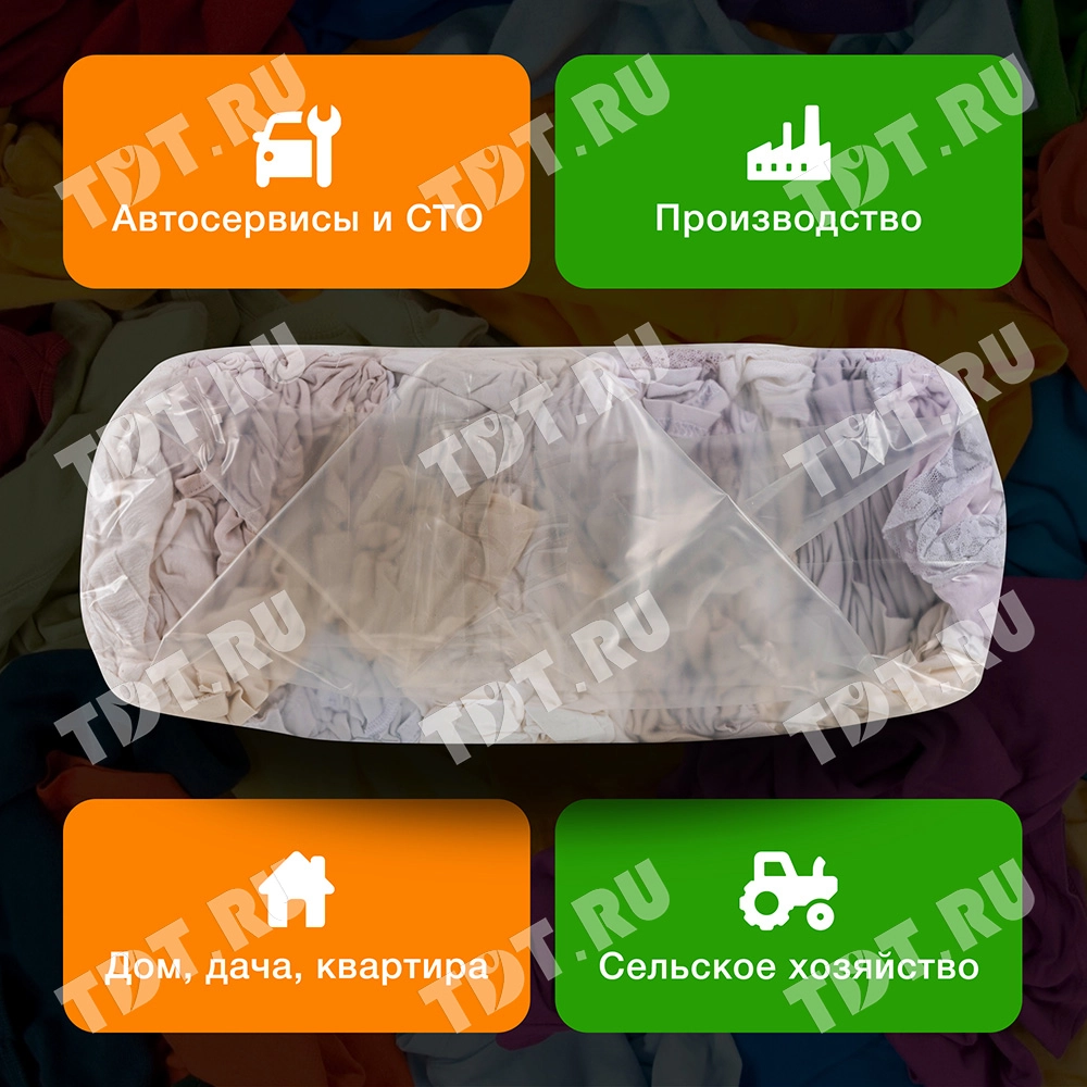 Область применения:Трикотажная ветошь применяется как обтирочный материал в промышленных цехах, мастерских, на строительной площадке. Обладая хорошими впитывающими свойствами, ветошь позволяет быстро и качественно обтереть масла и смазку с деталей, удалить избыток влаги, очистить загрязнения с рук, станков, рабочих поверхностей.