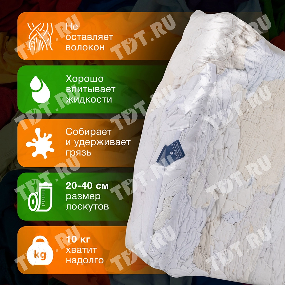 Белая трикотажная ветошь, весом 10 кг. Материал – 100% хлопок. Производится в России.
