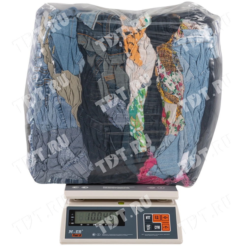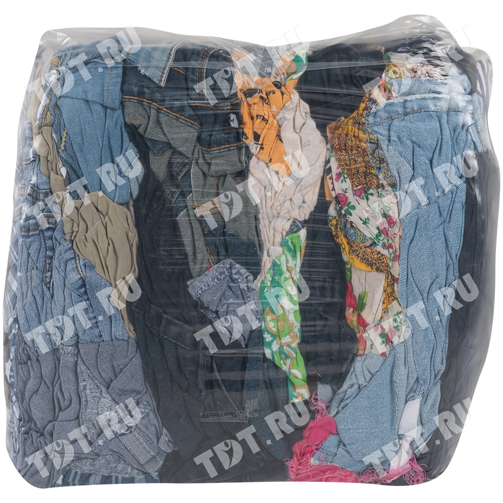Цветная ветошь ассорти, весом 10 кг. Джинсы, вельвет, шерсть, смесовые ткани. Синтетика 15-20%. Производится в России.