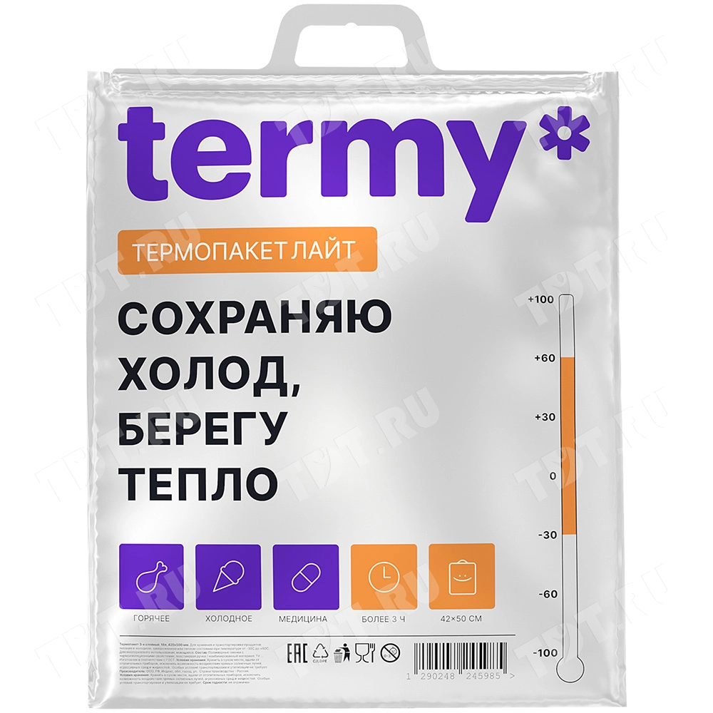 Термопакет «Termy Light» для хранения продуктов с усиленной клипсой-защелкой, шириной 420 мм, высотой 500 мм, объемом 18 л, грузоподъемностью до 10 кг. Многоразовый термопакет сохраняет холод и тепло до 3 часов. Производится в России.