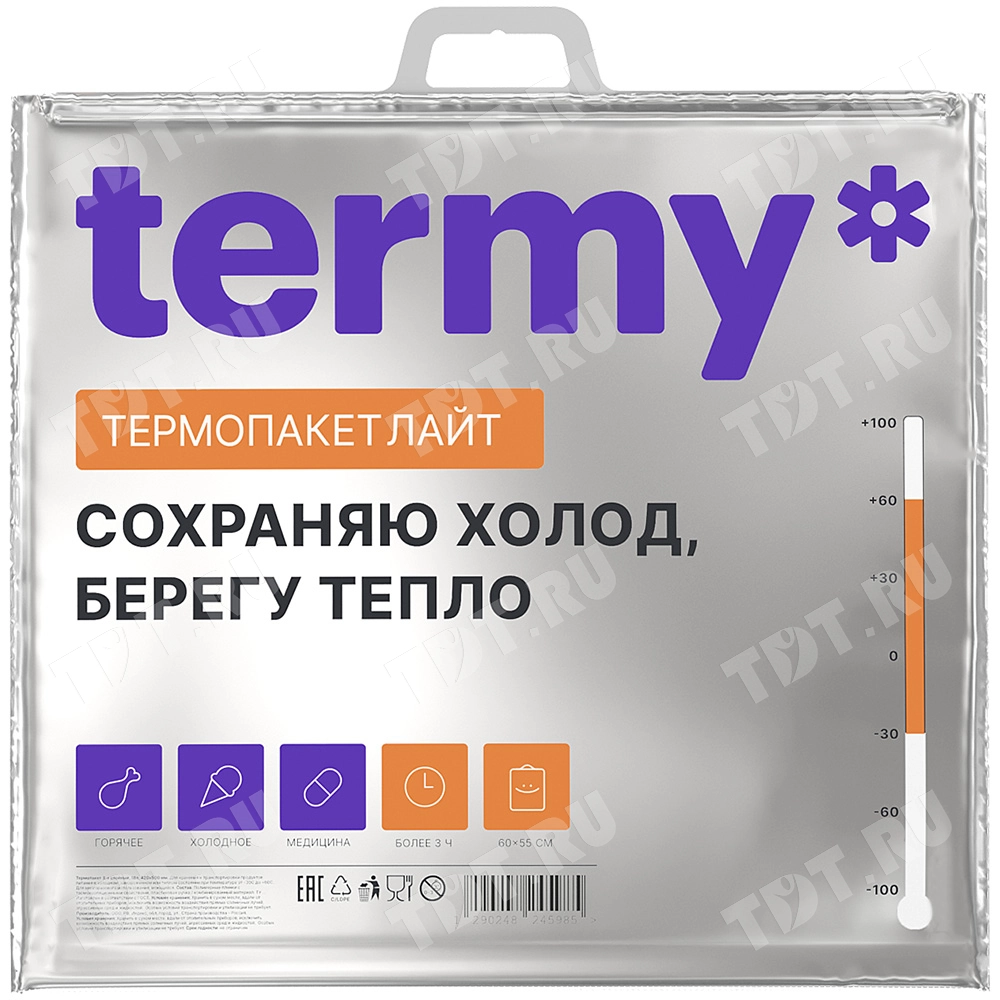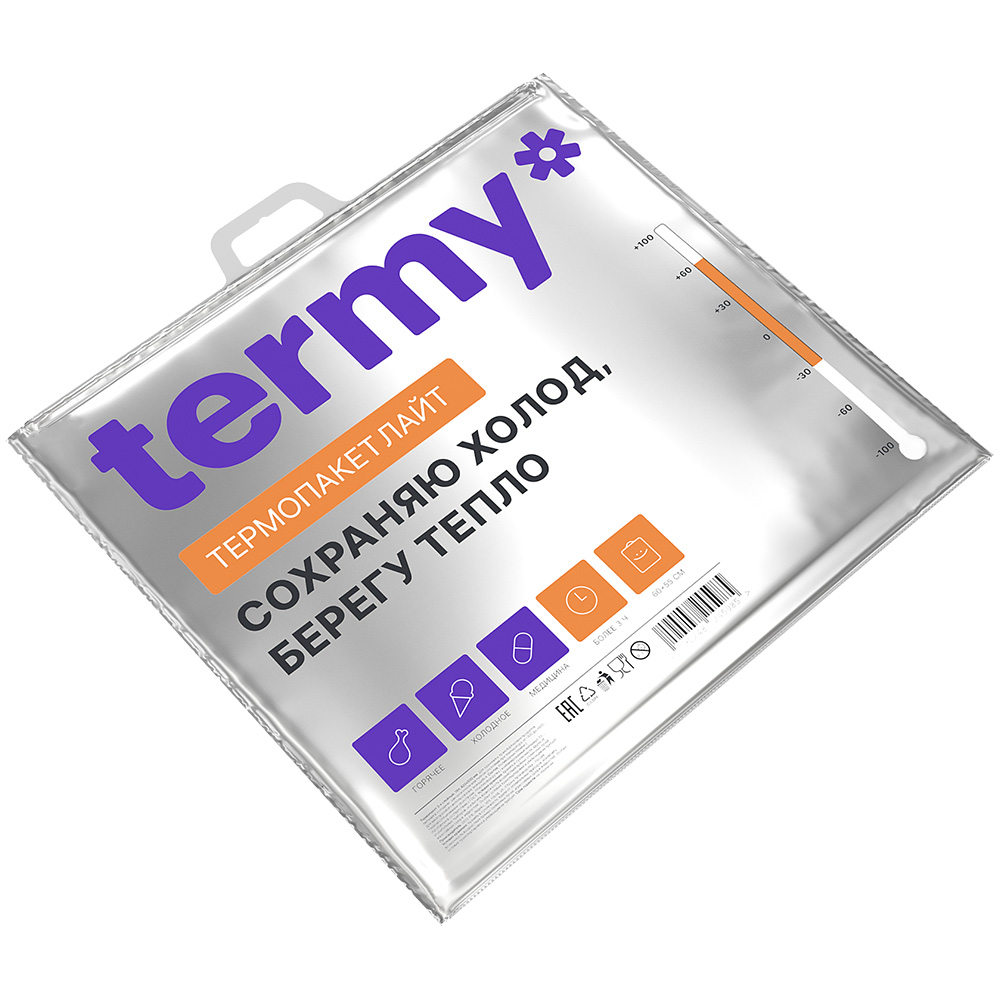 Термопакет «Termy Light» для хранения продуктов с усиленной клипсой-защелкой, шириной 600 мм, высотой 550 мм, объемом 33 л, грузоподъемностью до 15 кг. Многоразовый термопакет сохраняет холод и тепло до 3 часов. Производится в России.