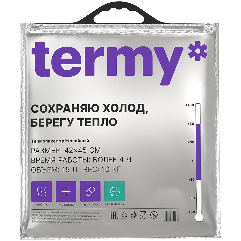 Термопакет «Termy Standart» для хранения продуктов с усиленной клипсой-защелкой, шириной 420 мм, высотой 450 мм, объемом 15 л, грузоподъемностью до 10 кг. Многоразовый термопакет сохраняет холод и тепло до 4 часов. Производится в России.