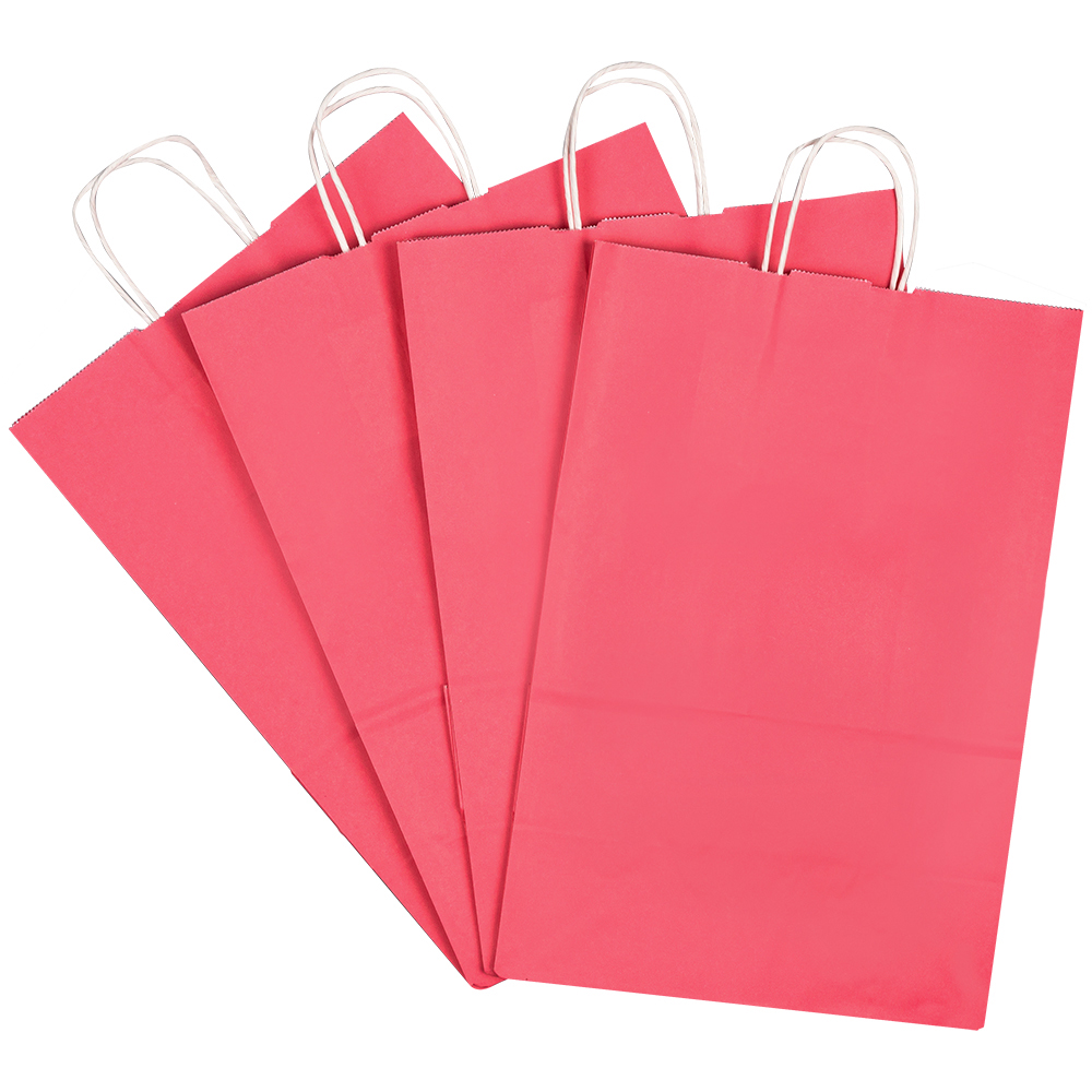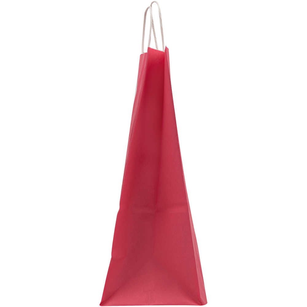 Розовый бумажный крафт пакет с крученой ручкой шириной 120 мм, длиной 320 мм, высотой 420 мм. Изготовлен из экологичного материала. Пакеты производятся в России.