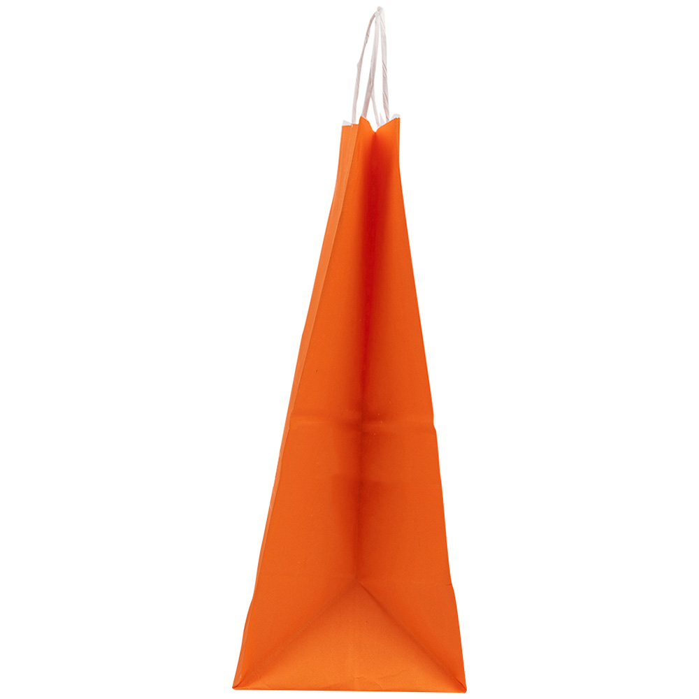 Оранжевый бумажный крафт пакет с крученой ручкой шириной 120 мм, длиной 320 мм, высотой 420 мм. Изготовлен из экологичного материала. Пакеты производятся в России.