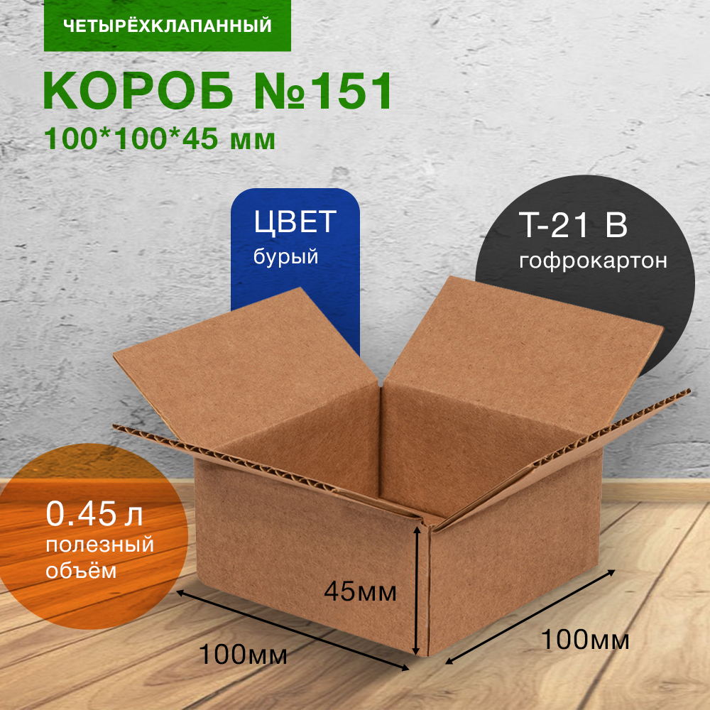 Картонный короб №151, длиной 100 мм, шириной 100 мм и высотой 45 мм. Изготовлен из трехслойного картона марки Т-21 В (макулатура). Полезный объём — 0.45 л.