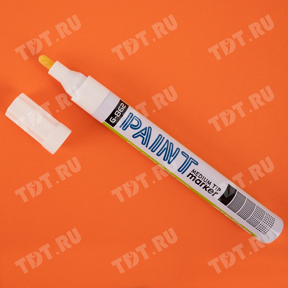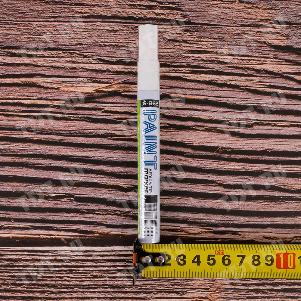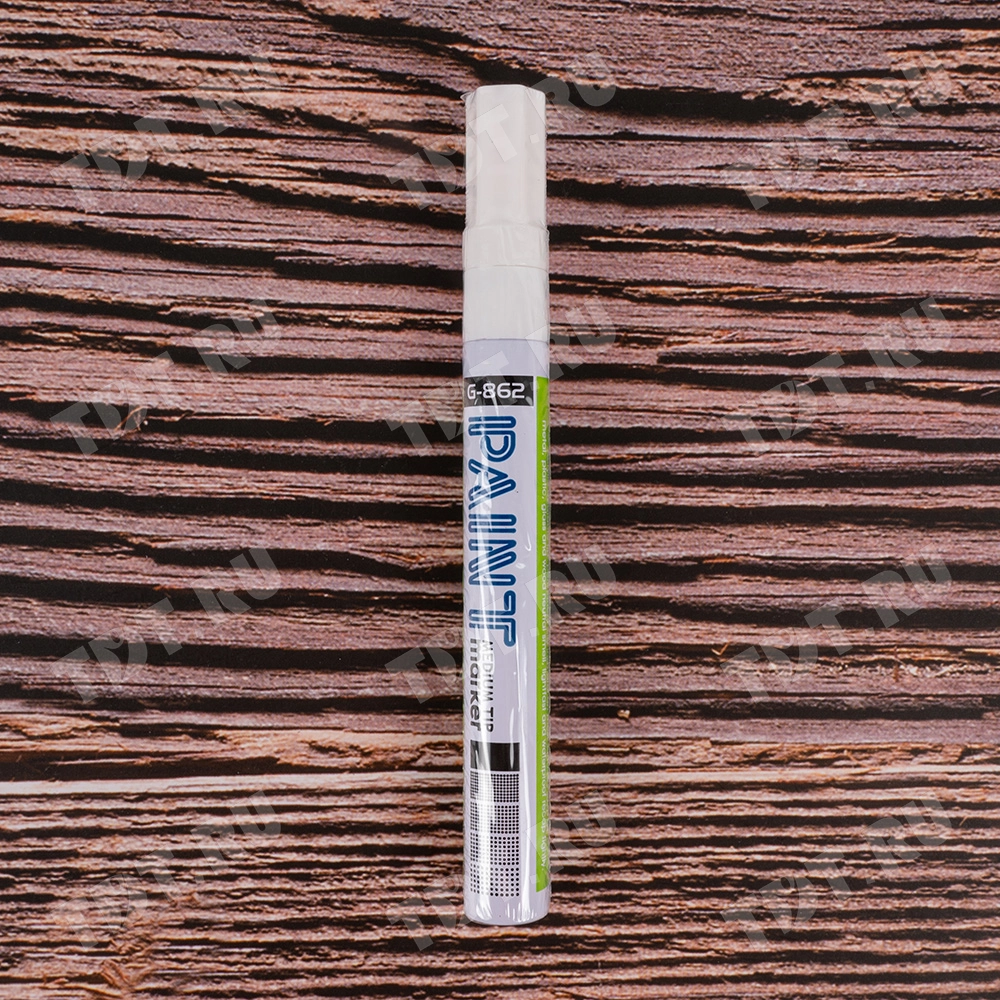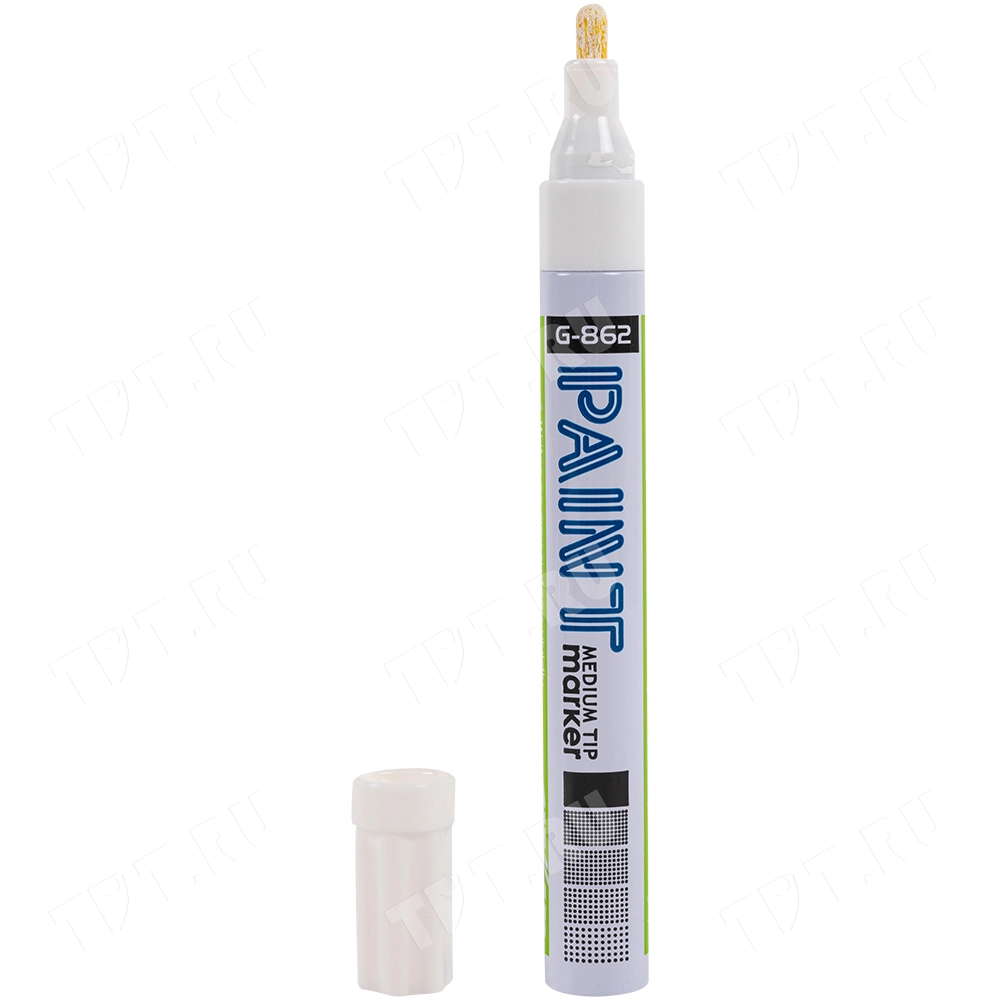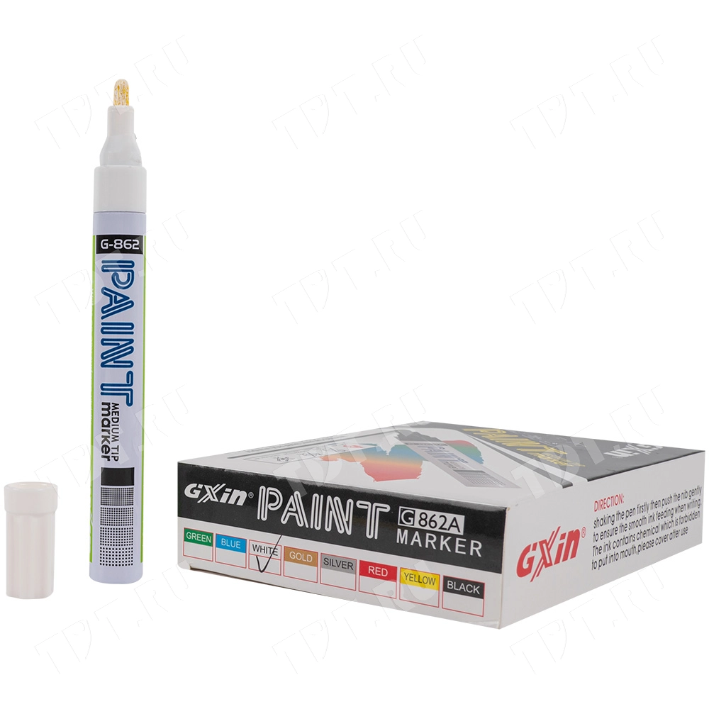 Маркер-краска Gxin G-862A – профессиональный лаковый перманентный маркер на масляной основе, толщиной пера 4 мм, белого цвета, круглый наконечник. Продается поштучно. Производится в Китае.